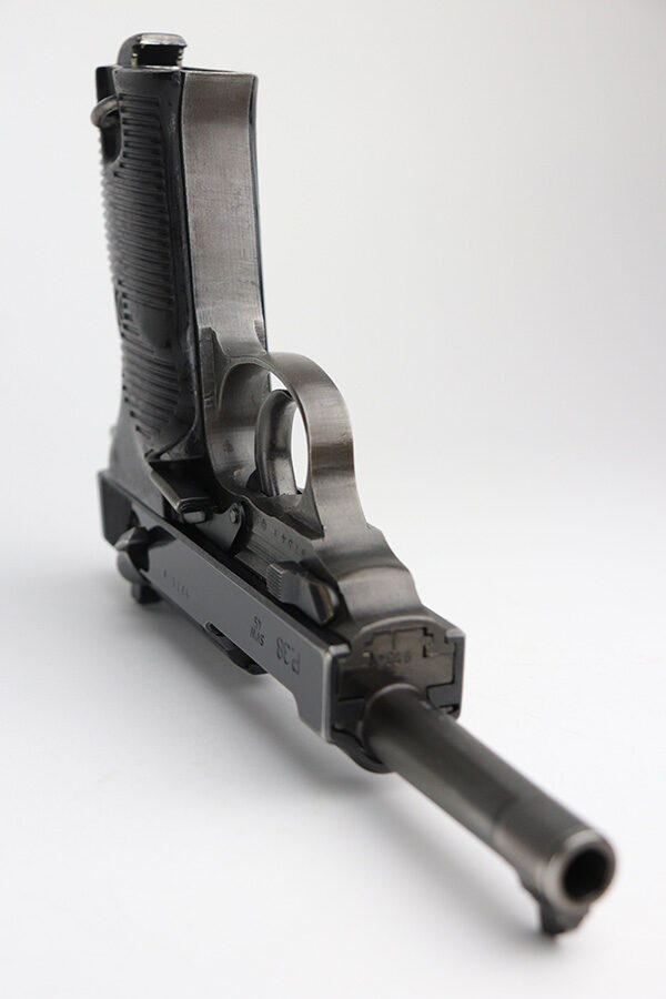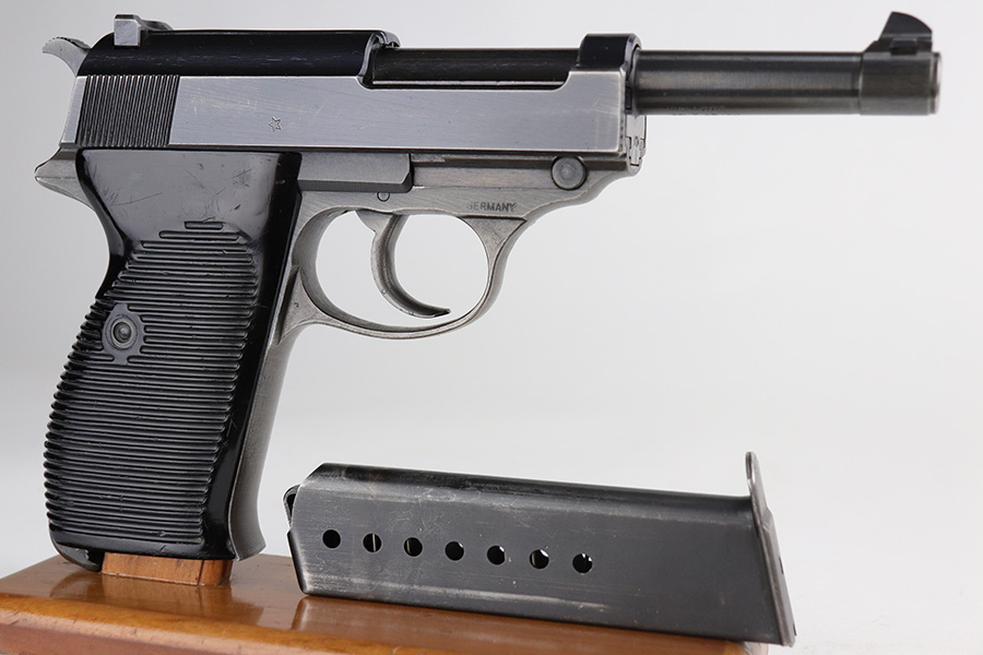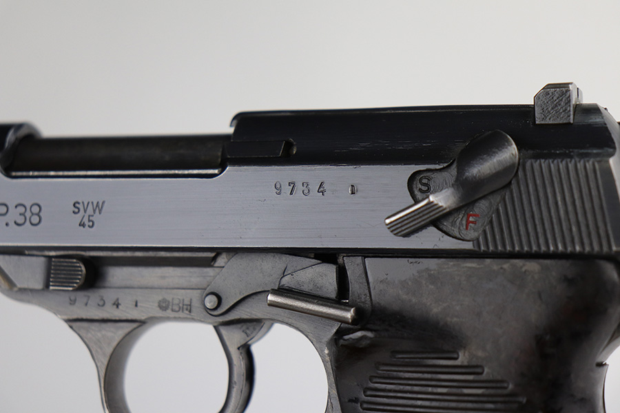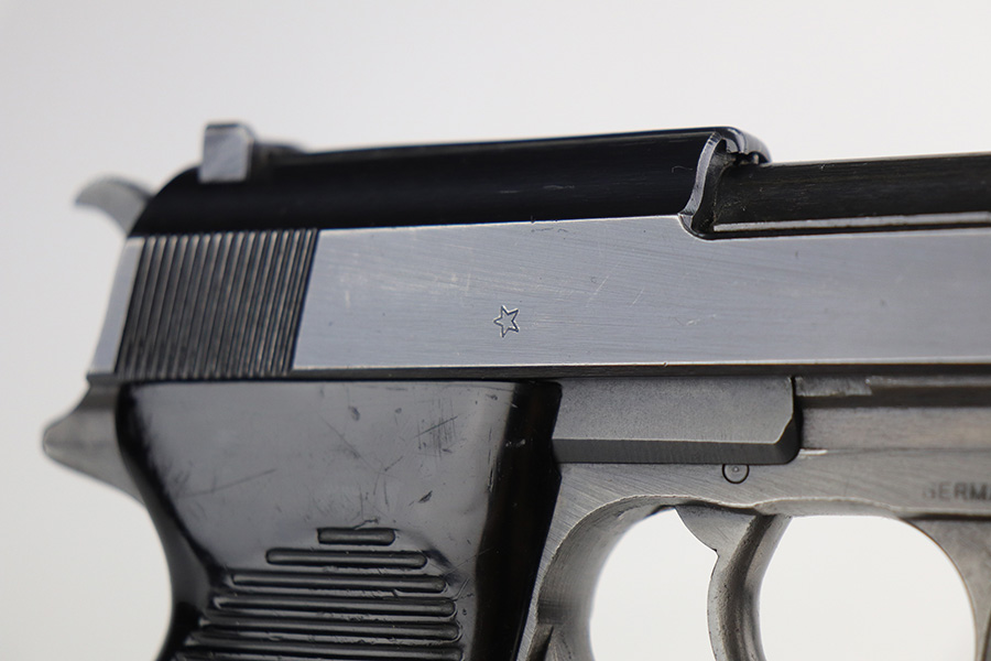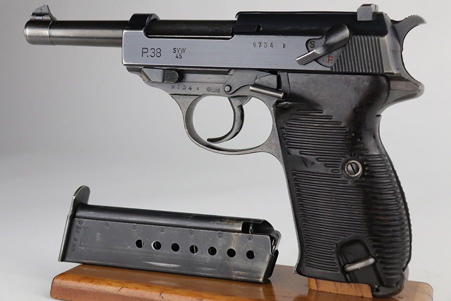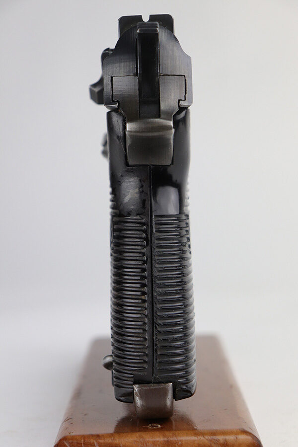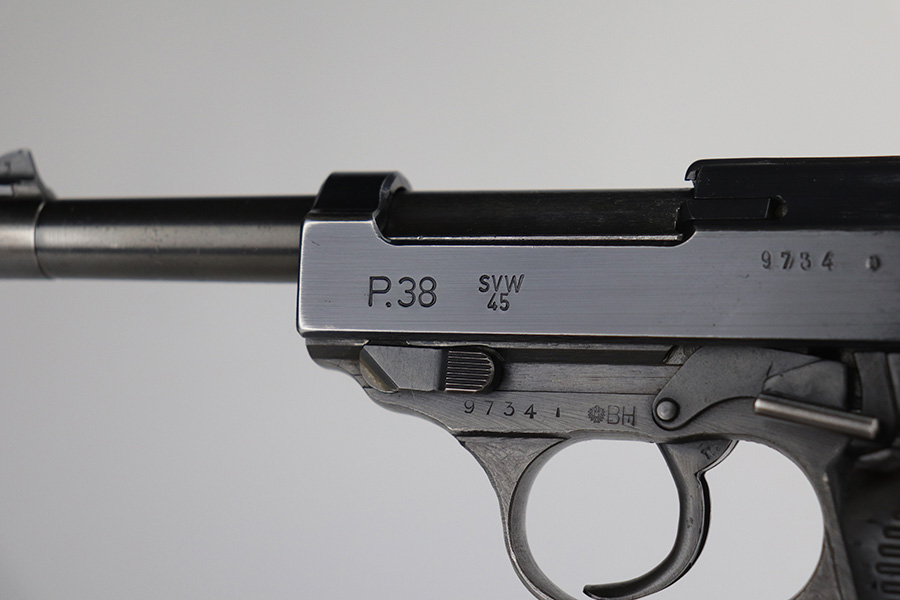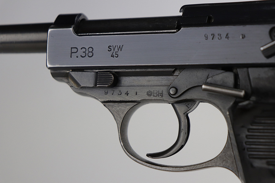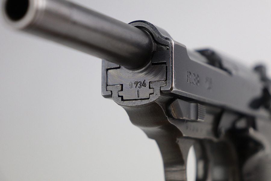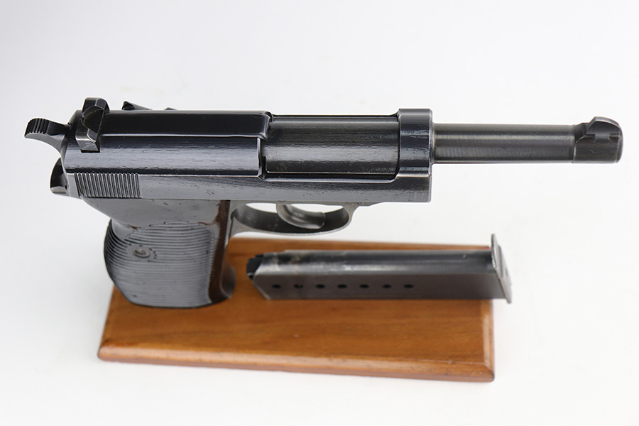 8/24/21 – This is a very nice example of a French-made Mauser P.38 assembled immediately following WW2 using leftover Nazi parts. It is all matching, has a French star on the right side of the slide, and has a “Waffen 135” Nazi proof on the barrel. It also has an “Eagle BH” proof on the left side of the frame, indicating that his gun ended up with the Austrian military. Import mark on the underside of the barrel and a “Germany” export marking on the right side of the frame. Comes with excellent grips and a post-war magazine. It has retained about 93-94% of its finish. Most of the finish loss is on the front strap, so the profile views are excellent. Some minor spotty oxidation on the front strap. There is very minor wear on the front edges of the slide and around the muzzle. Very minor thinning on the barrel through the ejection port. The bore is near-mint. De-cocker is functional.