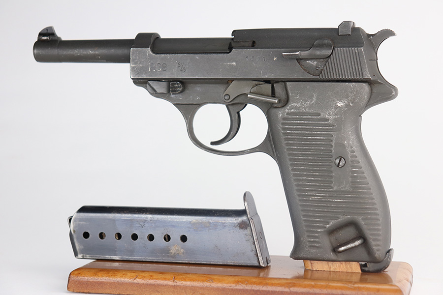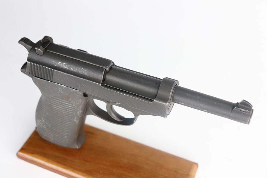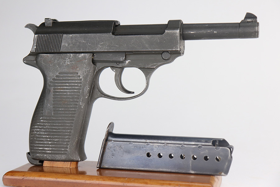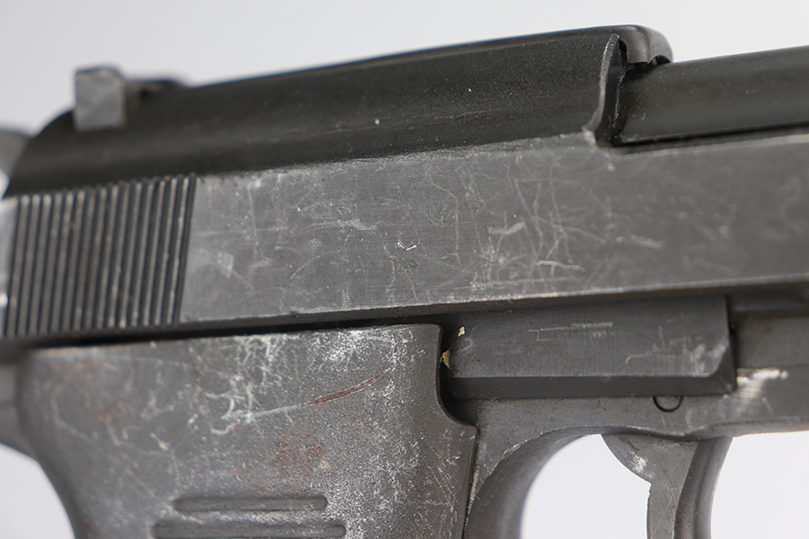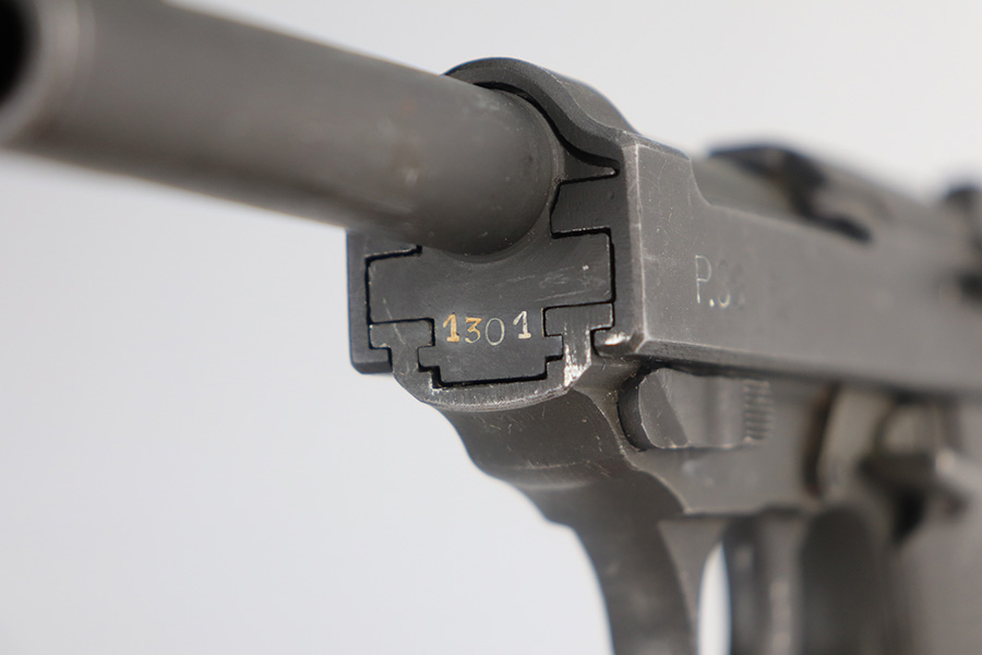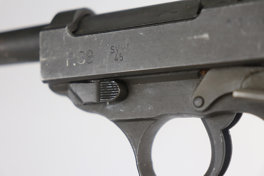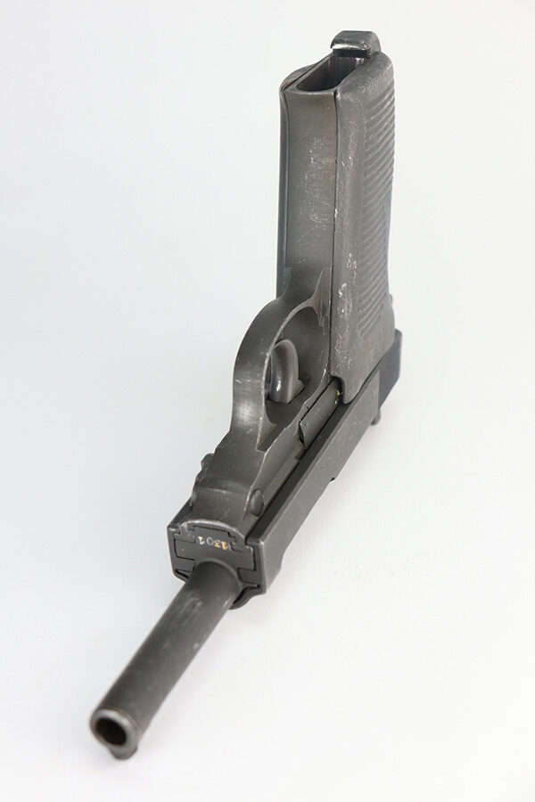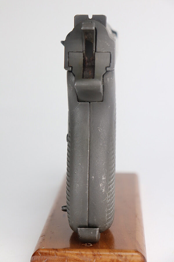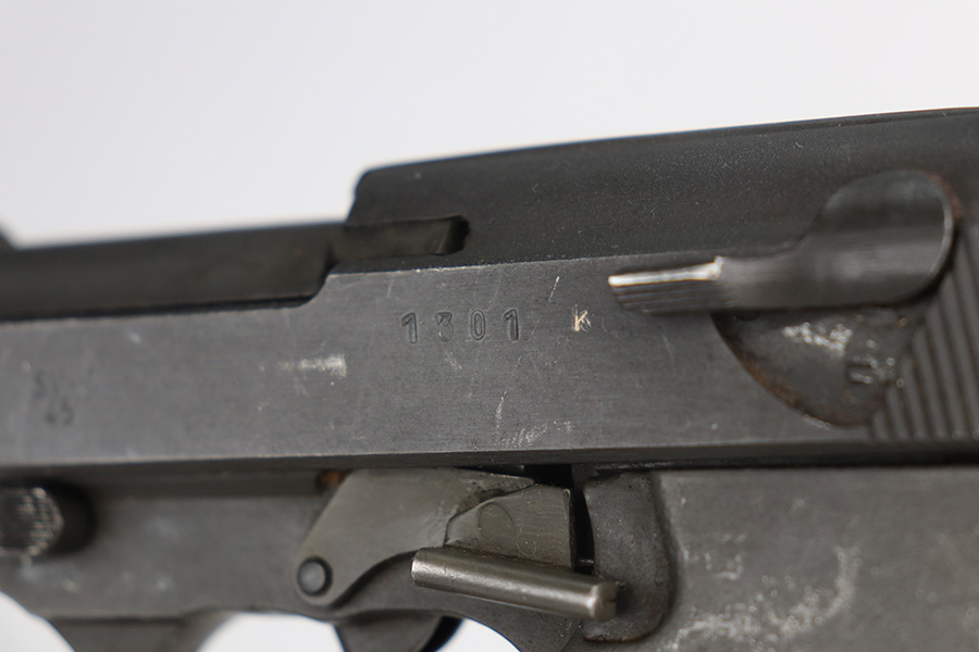 7/6/21 – This is an excellent example of a Mauser P.38 made by the French right after WW2, in 1945. Because of its grey appearance, it is often referred to as the “grey ghost”. The gun is all matching and has retained about 97% of its original phosphate finish. There is minor wear on the front edges of the slide and scratchy wear on the underside of the barrel and frame. Small scuffs and micro scratches throughout. Excellent grips with minor wear on the high edges. Comes with a proper magazine. Excellent shiny bore with strong rifling. De-cocker is functional.