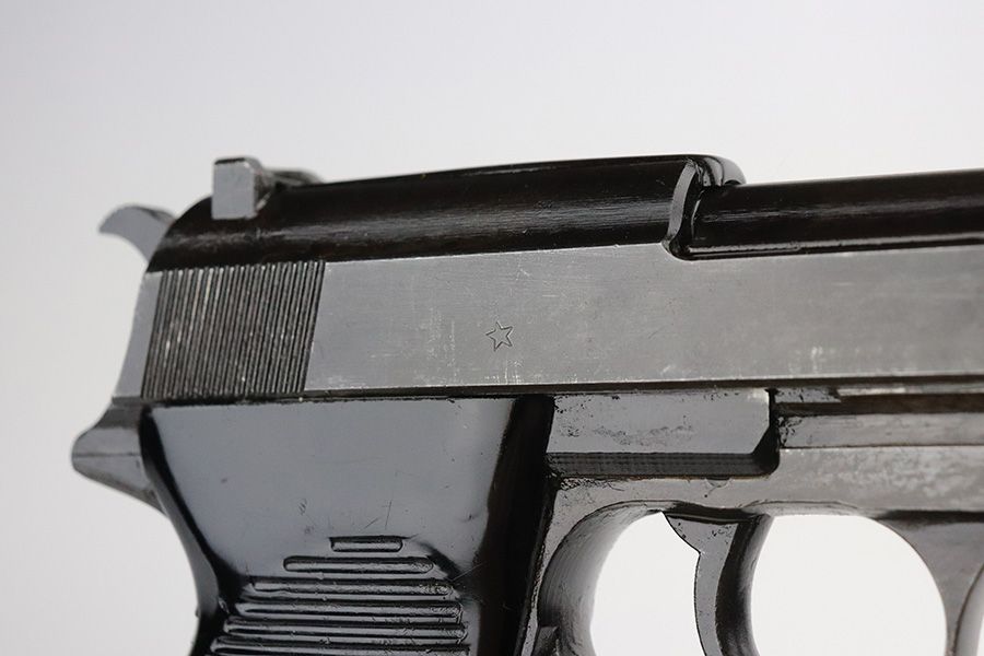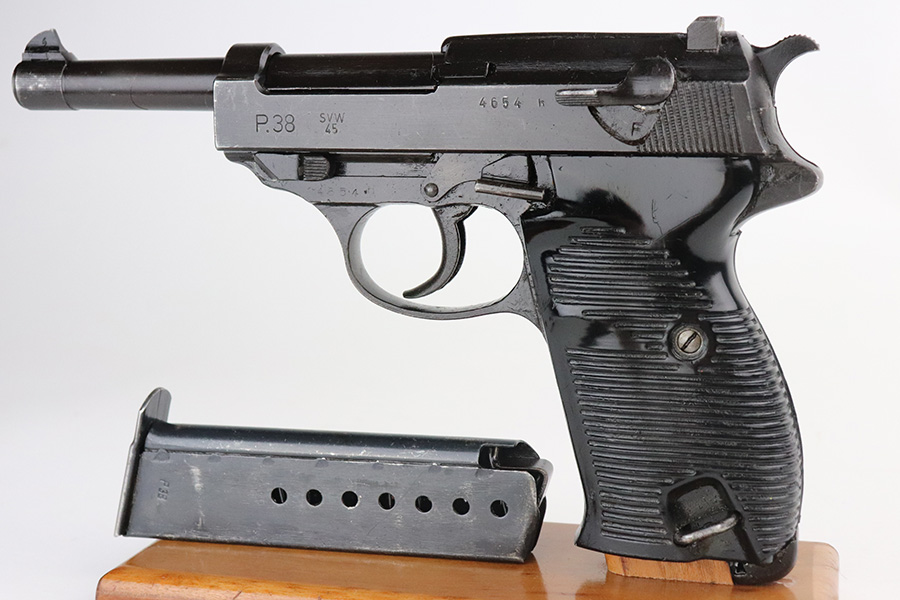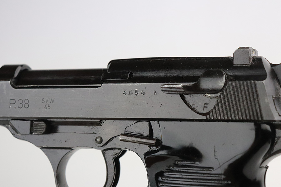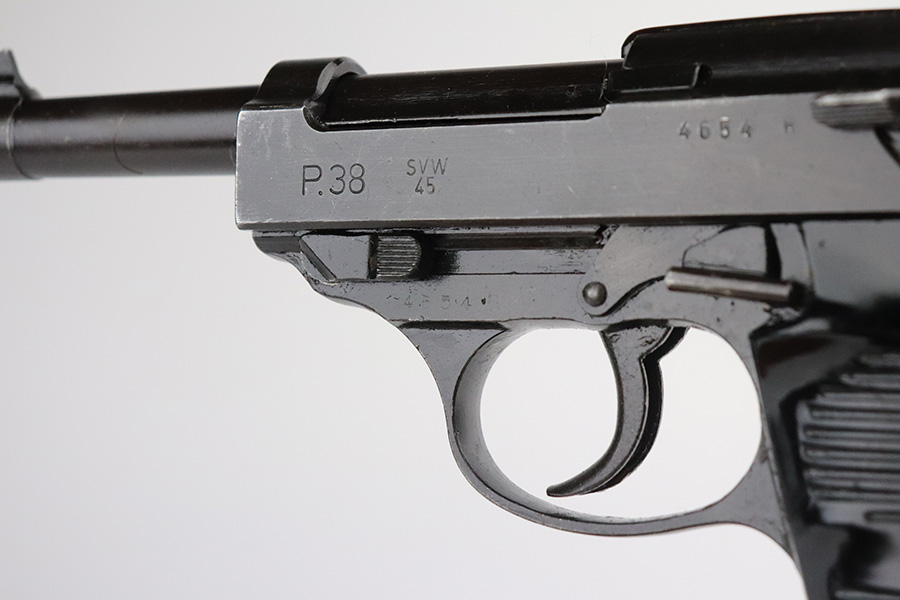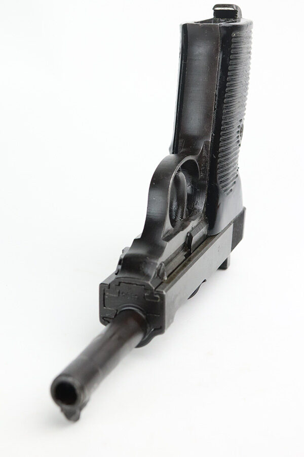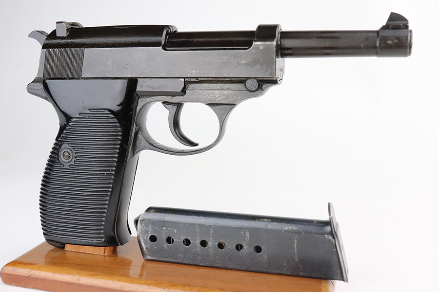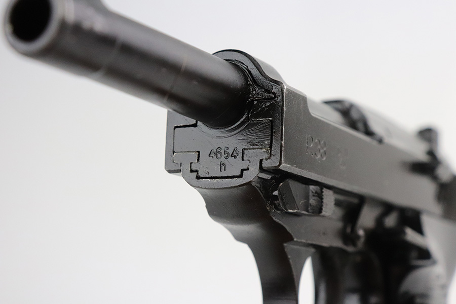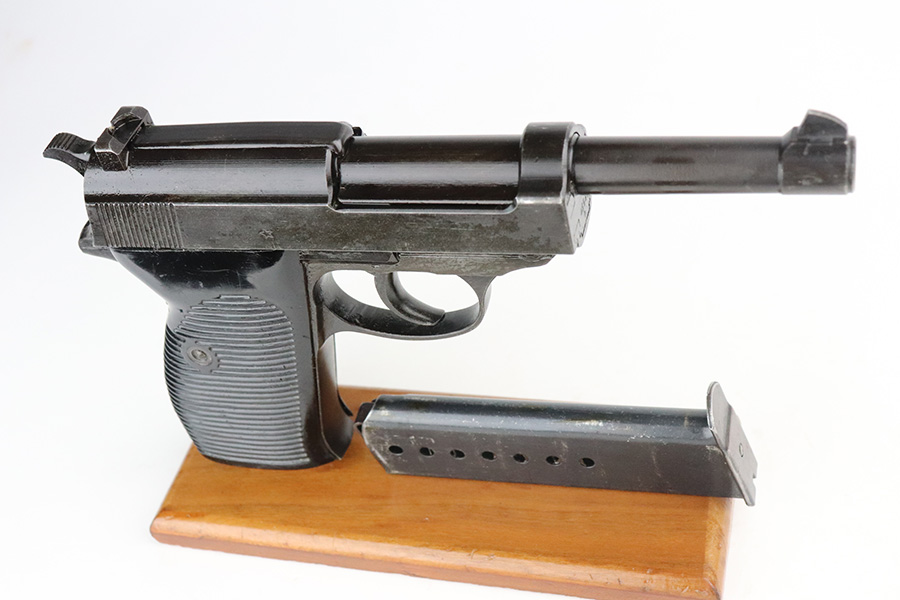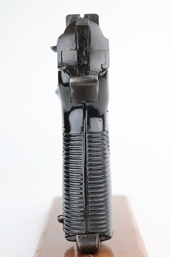 9/6/24 – This is a nice example of a French-made Mauser P.38 put together from leftover Nazi parts immediately after WW2. This one is matching and has a “Waffen 135” Nazi military proof on the barrel. French star proof on the right side of the slide. There is an import mark on the edge of the underside of the slide. It has a very dark finish and has retained about 90%. There is minor pin-pricking throughout and areas of minor splotchy discoloration on both sides of the slide. Comes with excellent grips and a WW2-era waffen-proofed magazine. The bore is excellent with very minor frosting in the grooves. De-cocker is functional. There is a lot of thick grease in the internals – would benefit from a good cleaning.