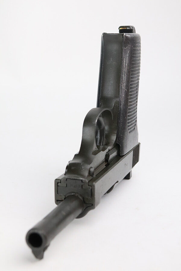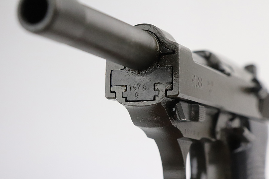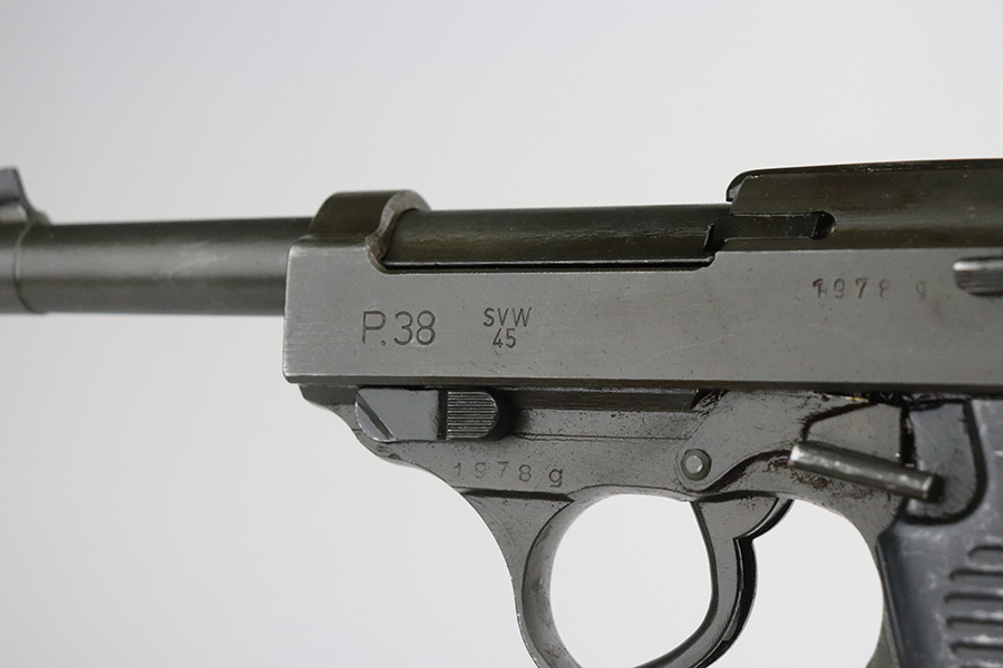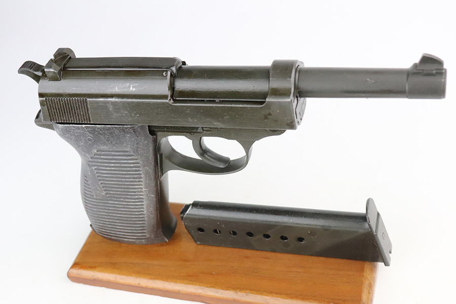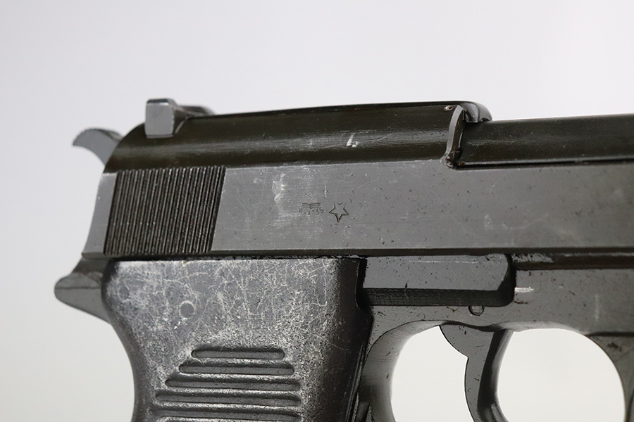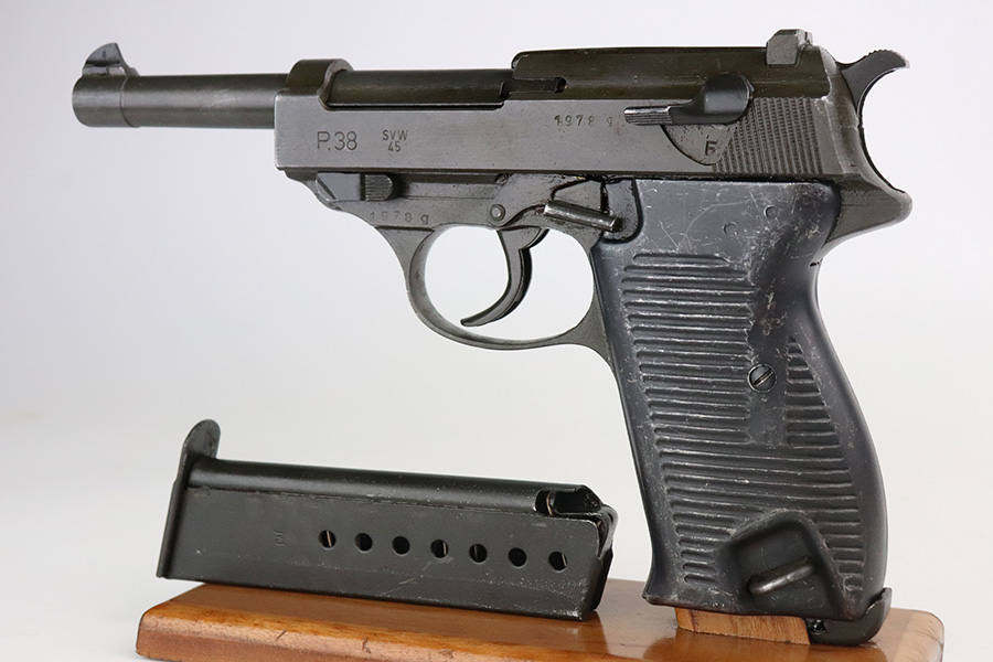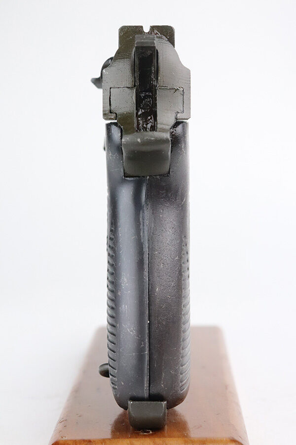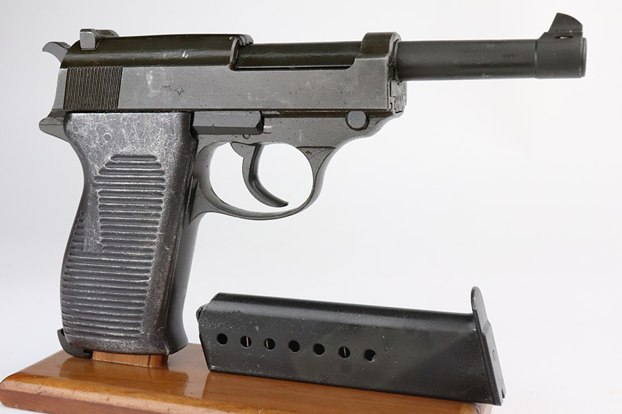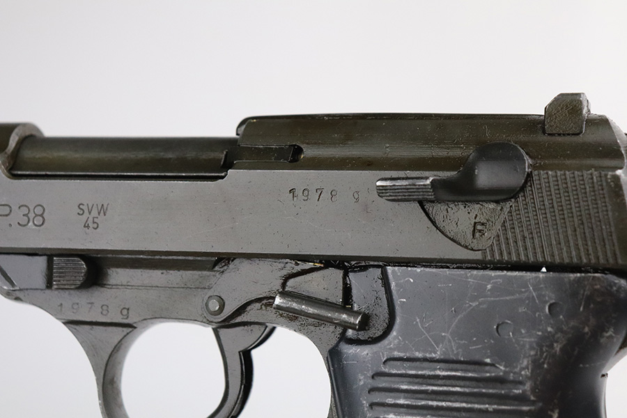 8/9/21 – This is a French Mauser P.38 put together from leftover Nazi parts immediately after WW2. It is all matching, has no import marks, has a French star on the right side of the slide, and “Waffen 135” Nazi military proofs on the slide and barrel. It has retained about 95-96% of its parkerized finish. There is very minor wear on the front edges of the slide and some light scratches/scuffs on the right side of the slide. Comes with desirable “gray ghost” grips (scuffs throughout) and a period-correct magazine. Mint bore. De-cocker is functional.