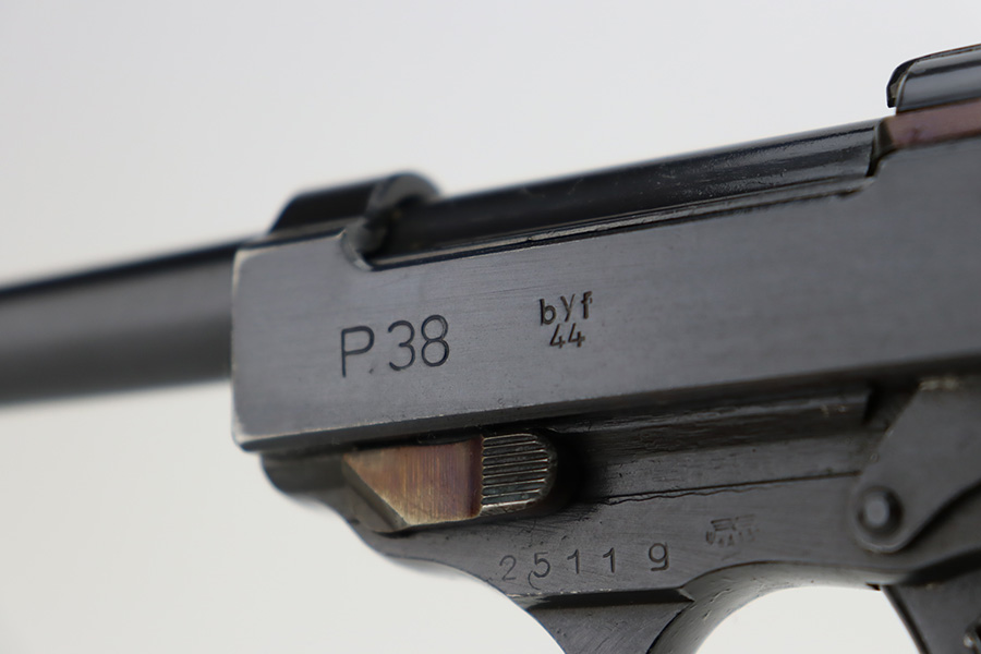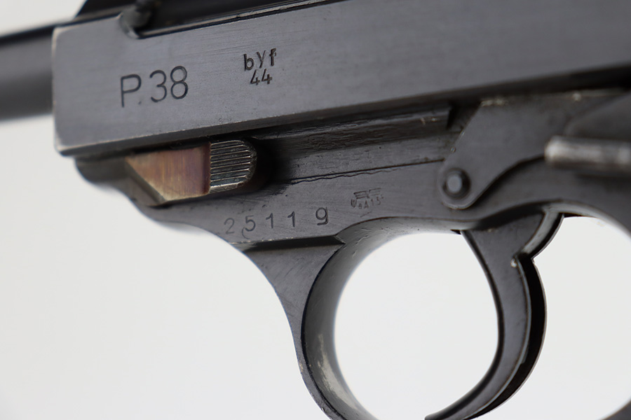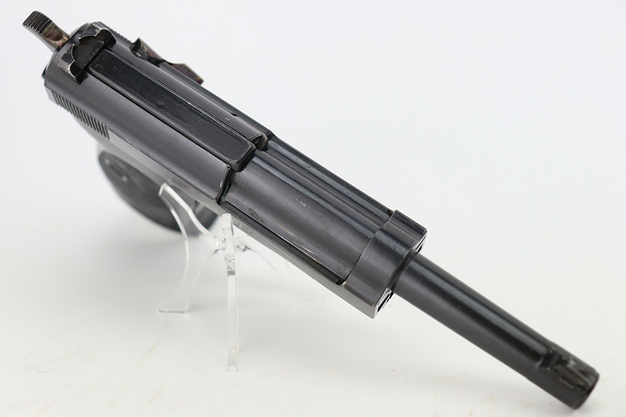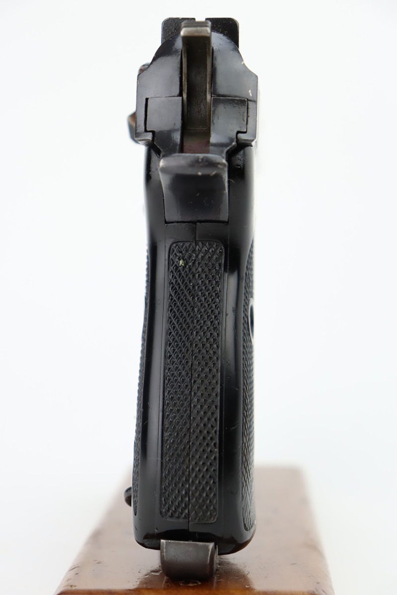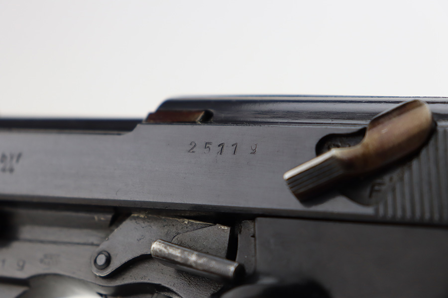 12/6/23 – This is a BYF 44 Mauser P.38 put together by the French immediately after WW2. It is mostly matching, but the locking block is mismatched. Nazi military proofs on the slide, frame, and barrel. There is a French star marking on the slide. The entire gun has been refinished, just some minor wear around the muzzle and front edges of the slide. There is some discoloration in an area on the right side of the slide where it appears some pitting may have been buffed away. Fitted with post-war grips and comes with a post-war magazine. The bore has good rifling with minor pin-pricking throughout. De-cocker is functional.