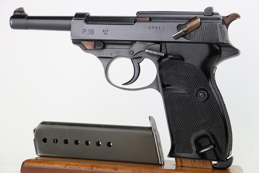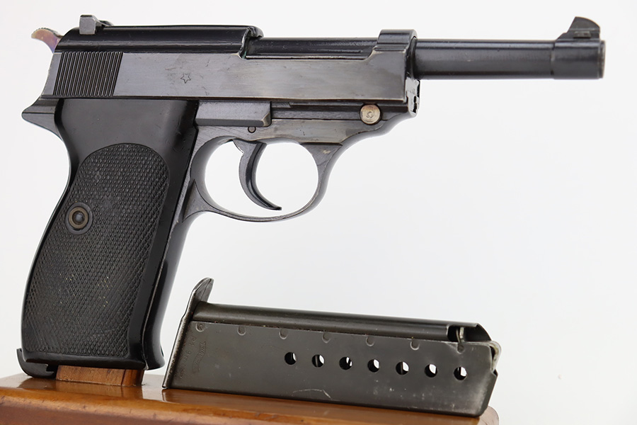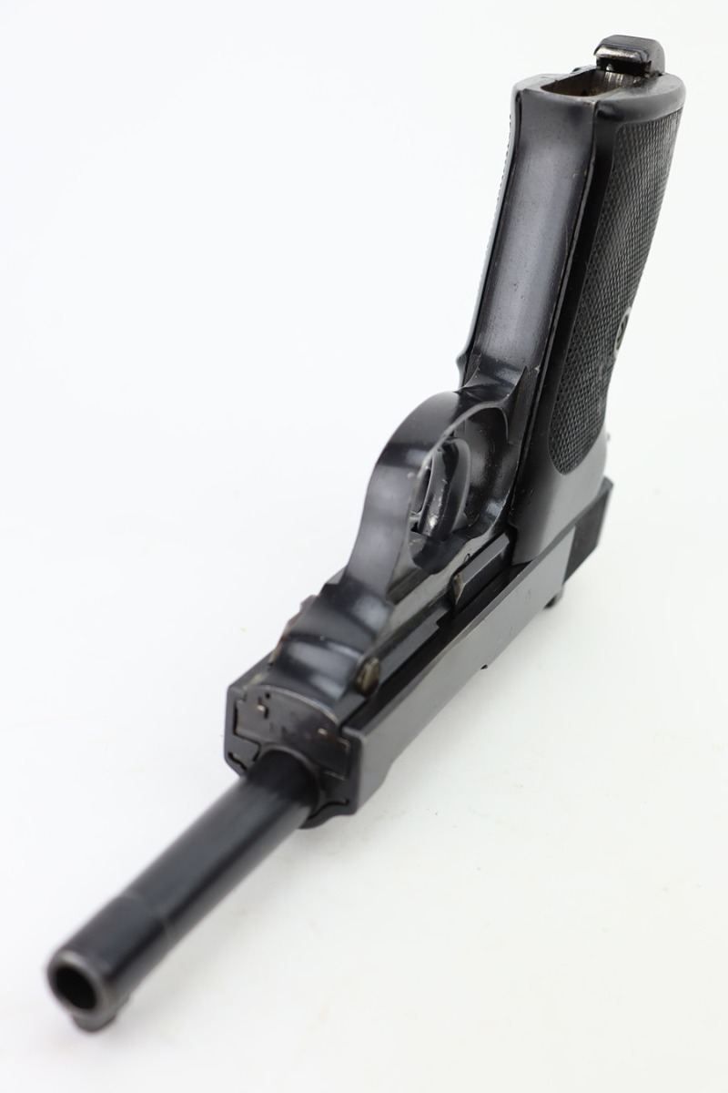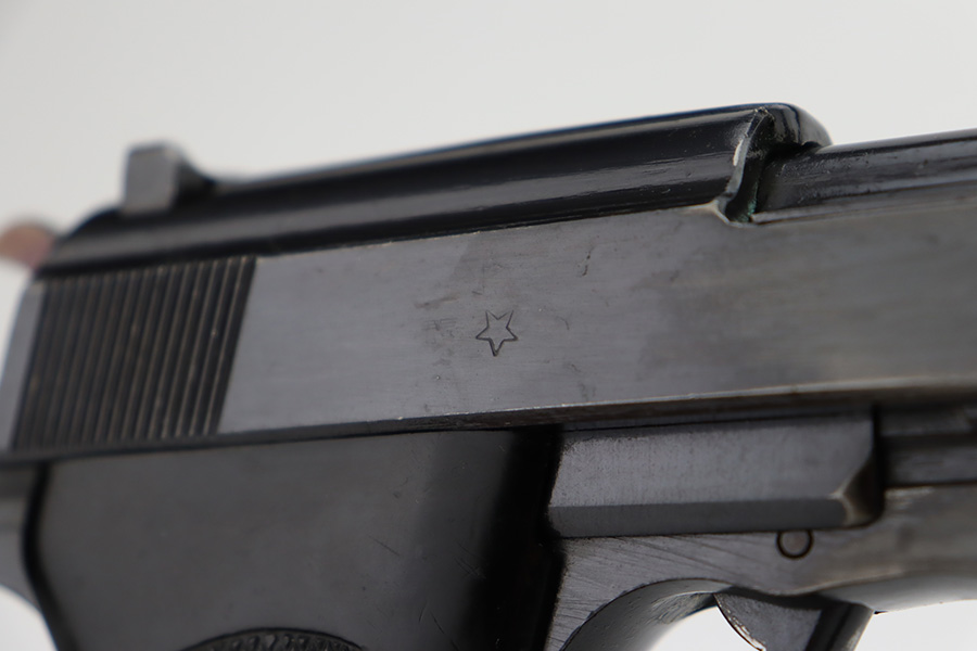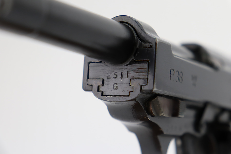 12/6/23 – This is a BYF 44 Mauser P.38 put together by the French immediately after WW2. It is mostly matching, but the locking block is mismatched. Nazi military proofs on the slide, frame, and barrel. There is a French star marking on the slide. The entire gun has been refinished, just some minor wear around the muzzle and front edges of the slide. There is some discoloration in an area on the right side of the slide where it appears some pitting may have been buffed away. Fitted with post-war grips and comes with a post-war magazine. The bore has good rifling with minor pin-pricking throughout. De-cocker is functional.