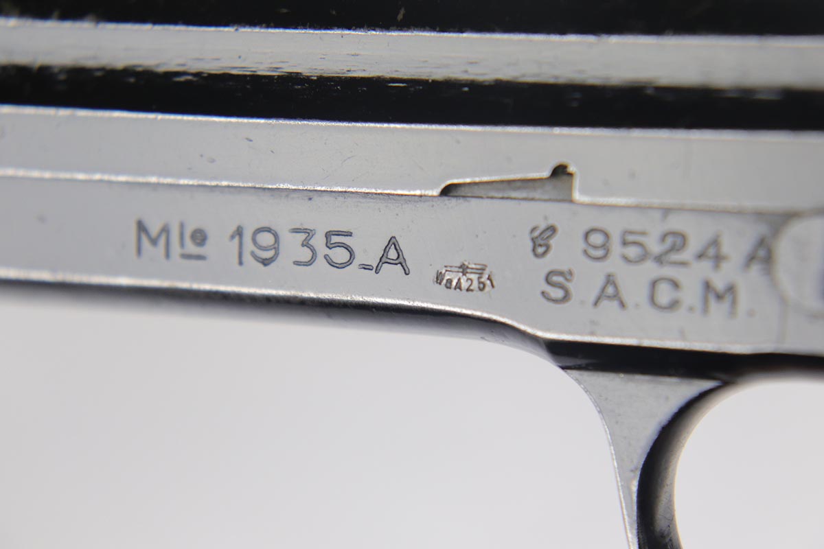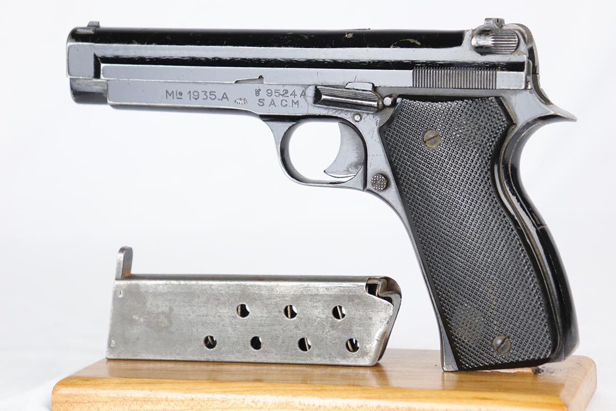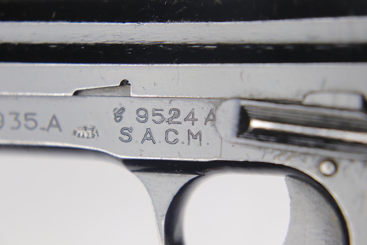 7/10/18 –  This is an all original M1935A, manufactured by SACM (Societe Alsacienne Construction Mecanique) in Cholet, France.  It is Nazi-marked E/WaA251 on the left side of the slide, making this the more common 2nd variation model of these pistols.  Overall, they remain fairly scarce for German Army pistols of that time, with only about ~24,000 produced.  The serial dates this one to the earlier end of the range, likely produced somewhere around 1941-1942.  The original finish is about 85%, with multiple areas of typical wear/finish loss on frame and slide.  It is all correct and original with an excellent bore.  Grips are in great condition with no cracks or chips.