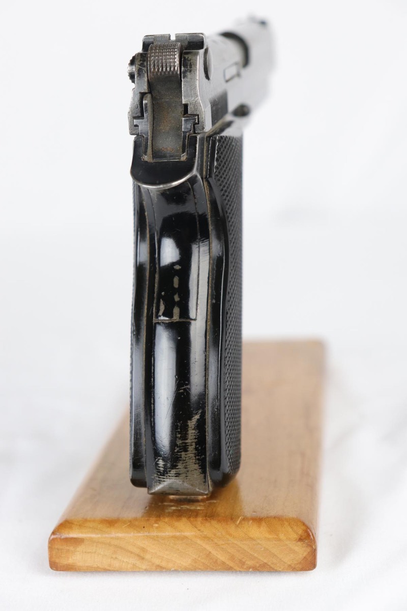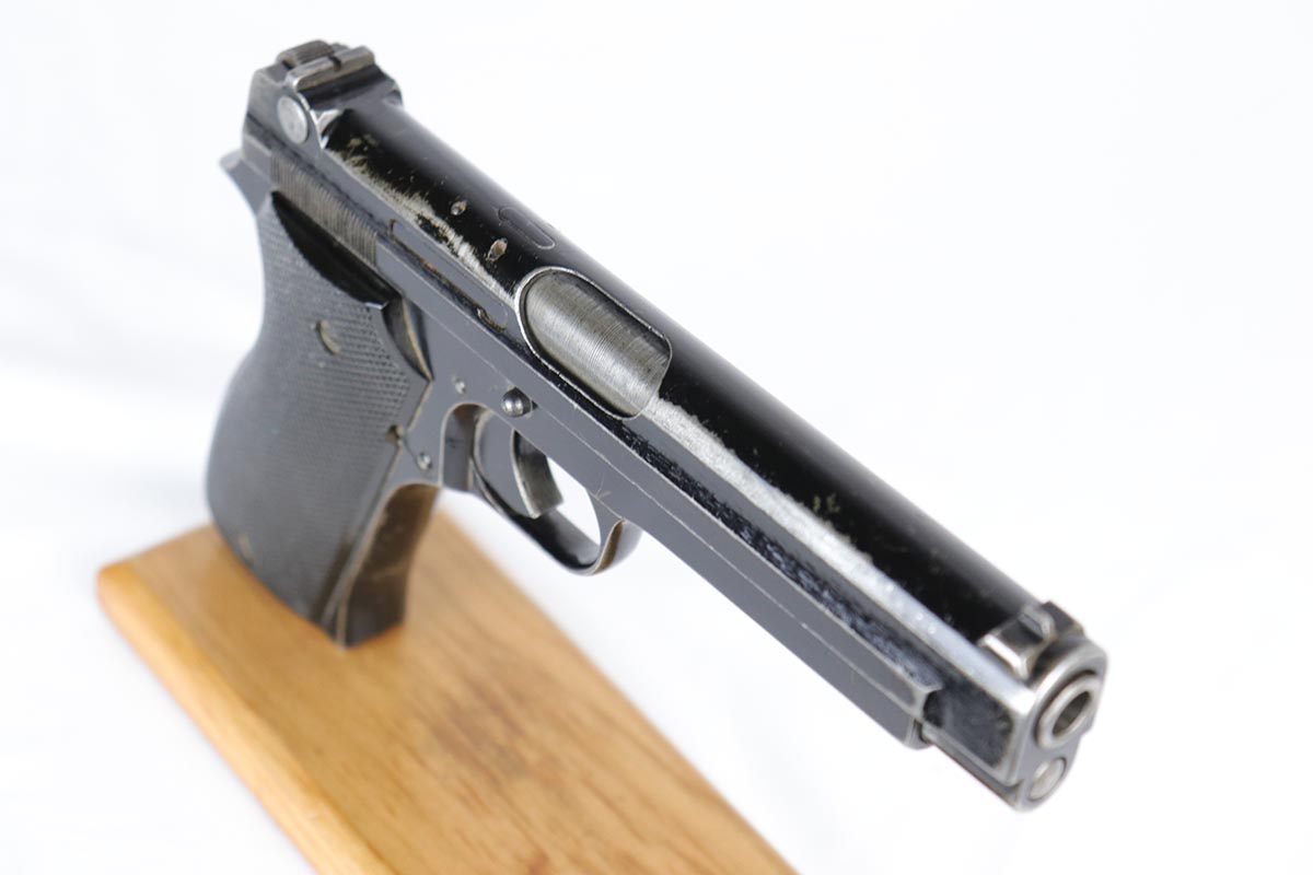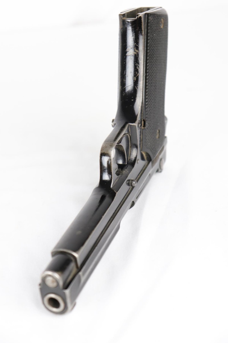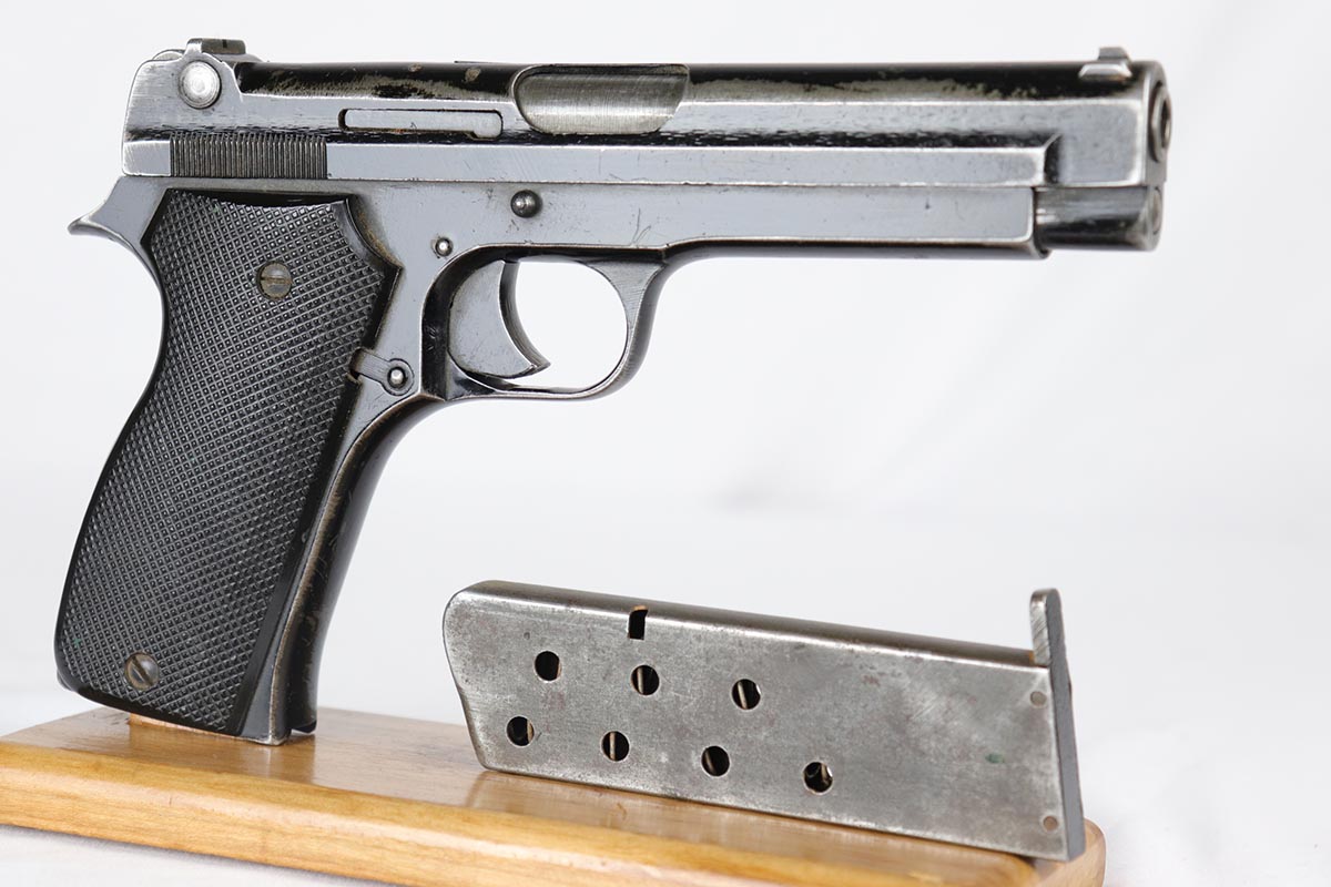 7/10/18 –  This is an all original M1935A, manufactured by SACM (Societe Alsacienne Construction Mecanique) in Cholet, France.  It is Nazi-marked E/WaA251 on the left side of the slide, making this the more common 2nd variation model of these pistols.  Overall, they remain fairly scarce for German Army pistols of that time, with only about ~24,000 produced.  The serial dates this one to the earlier end of the range, likely produced somewhere around 1941-1942.  The original finish is about 85%, with multiple areas of typical wear/finish loss on frame and slide.  It is all correct and original with an excellent bore.  Grips are in great condition with no cracks or chips.