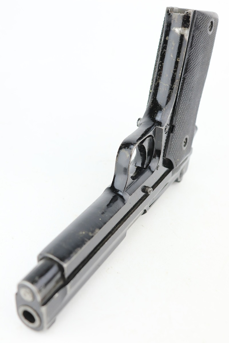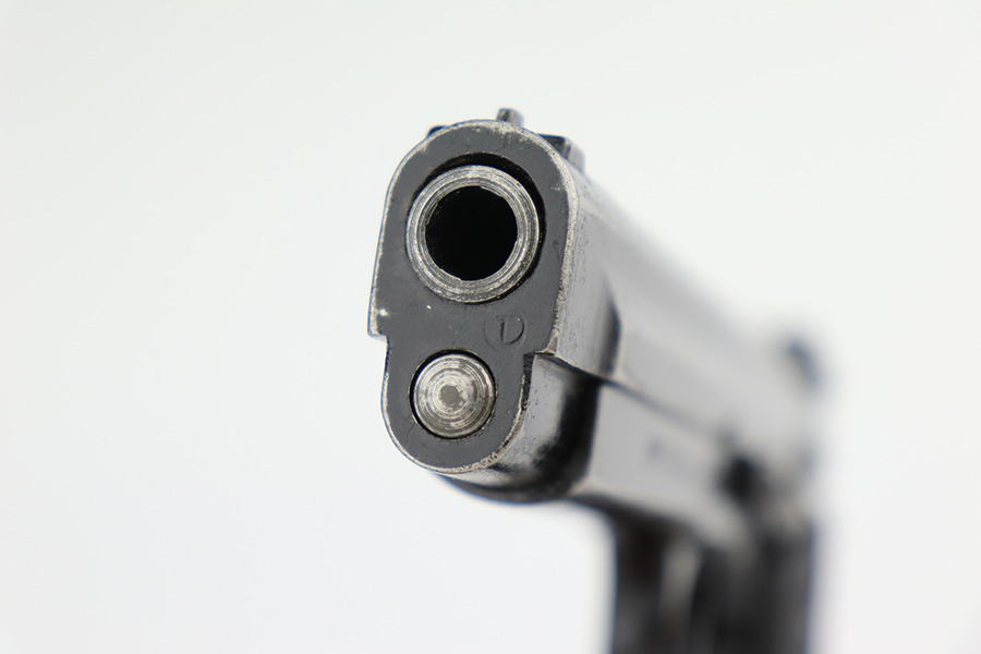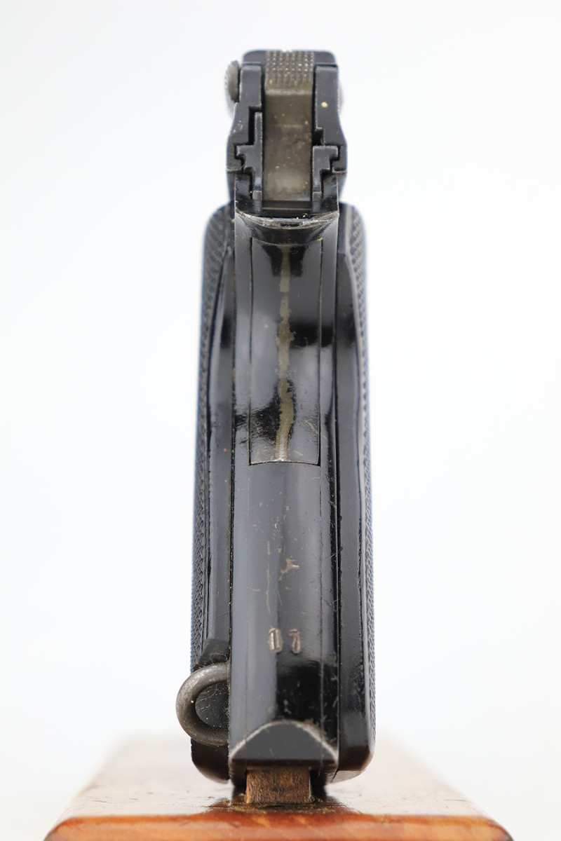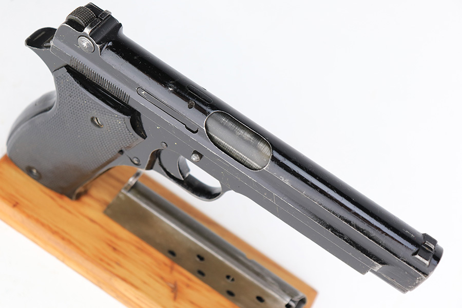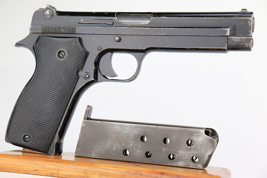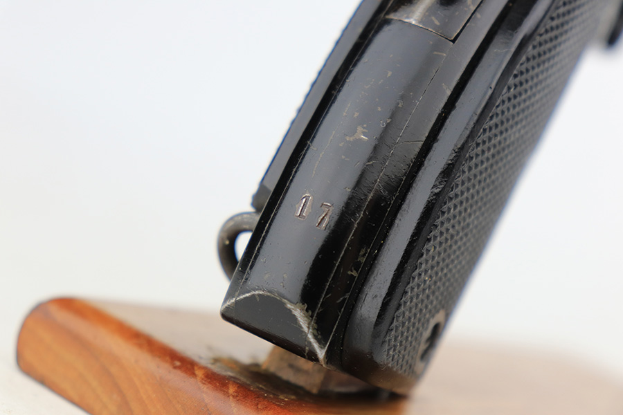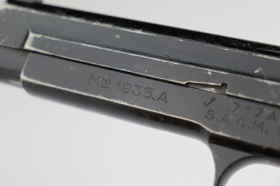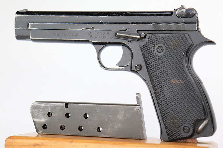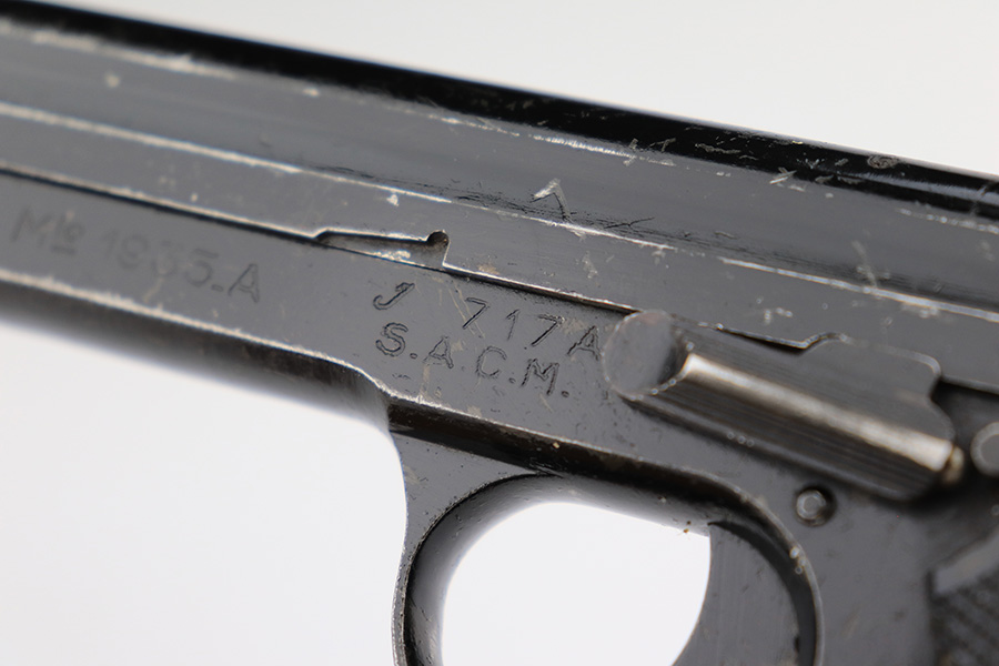 3/27/23 – This is a very nice example of a SACM Model 1935A manufactured by the French immediately after WW2. This one is all matching and has retained roughly 90% of its original black enamel finish. Generally, there is minor wear around the muzzle, around the high edges, and some light scratching and chipping in the finish throughout. Fitted with very nice black plastic grips and comes with one proper magazine. Mint bore. Appears to a unit marking on the back strap.