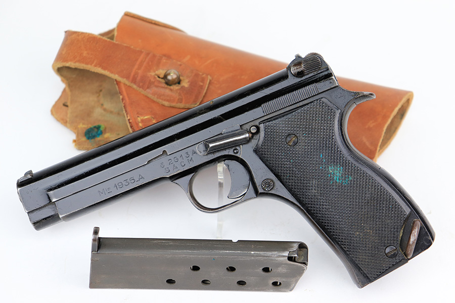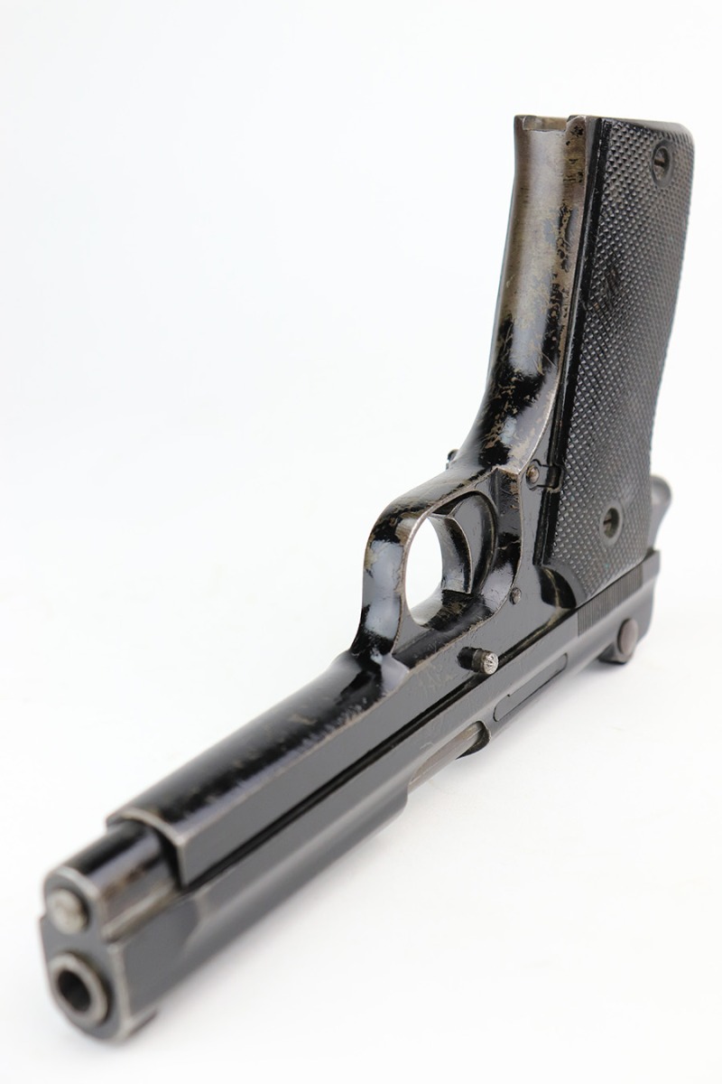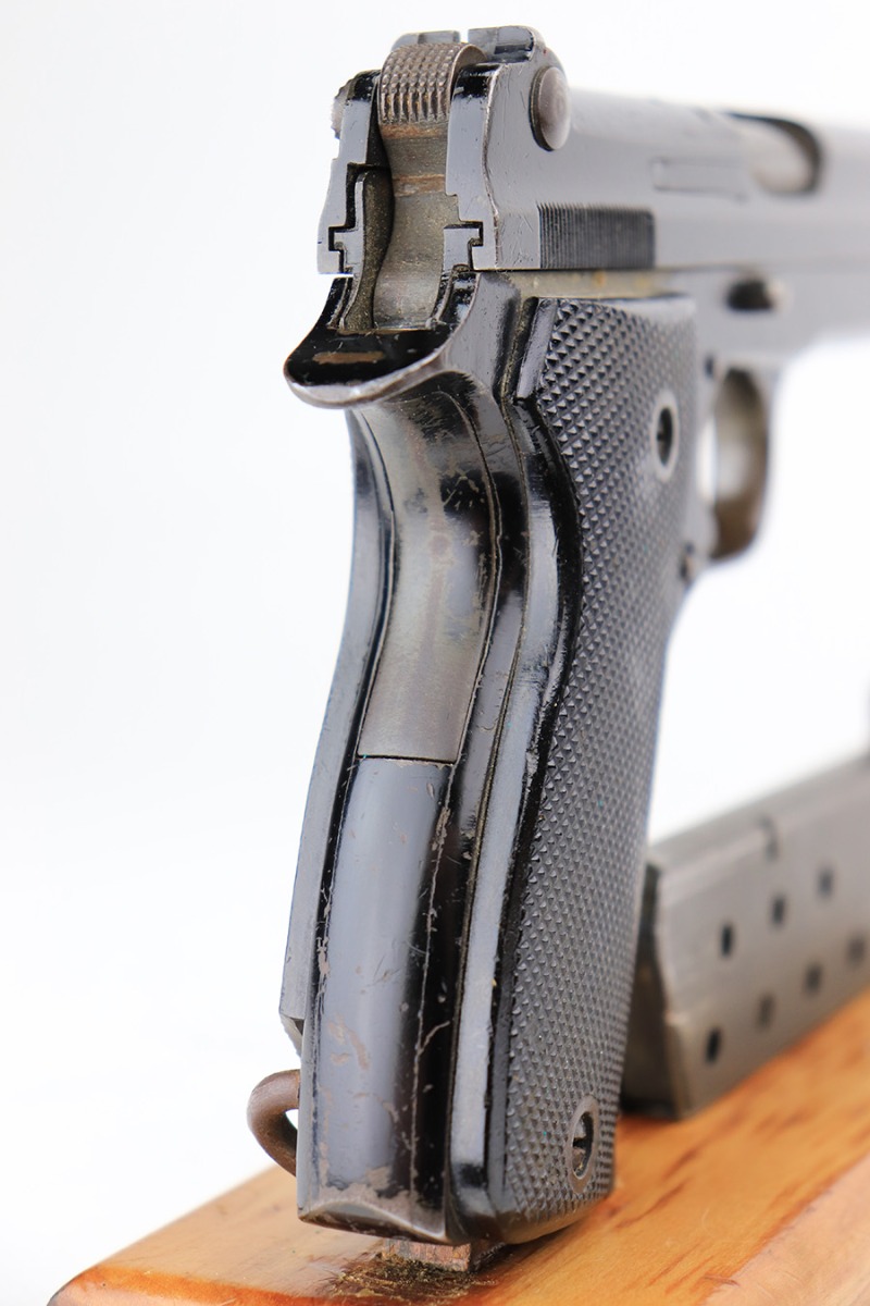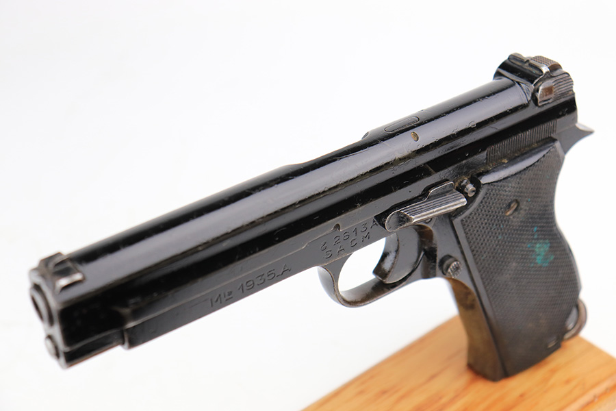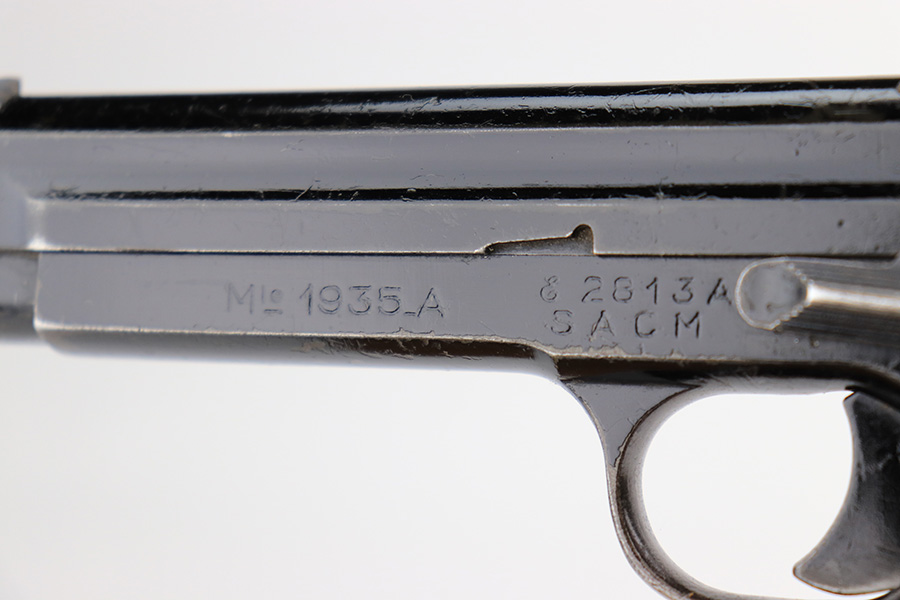 3/24/22 – This is a nice example of a French SACM Model 1935A chambered in 7.65mm. It lacks Nazi waffen proofs and has an “E” serial prefix, indicating it was manufactured immediately after the Nazi occupation during WW2. It comes as a rig with one proper magazine and a modified 1942-dated Colt 1911A1 holster (fits the gun well). The gun has retained roughly 80% of its original black painted finish. The majority of the finish loss is on the grip straps, but there is scratching and small chips in the paint throughout. Comes with very nice black bakelite grips – a small area of verdigris on the left side. The bore has strong rifling but there are a few tiny areas of minor pitting.