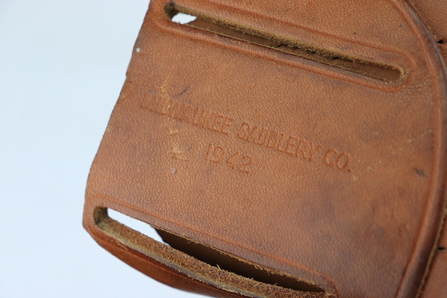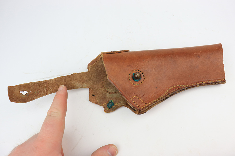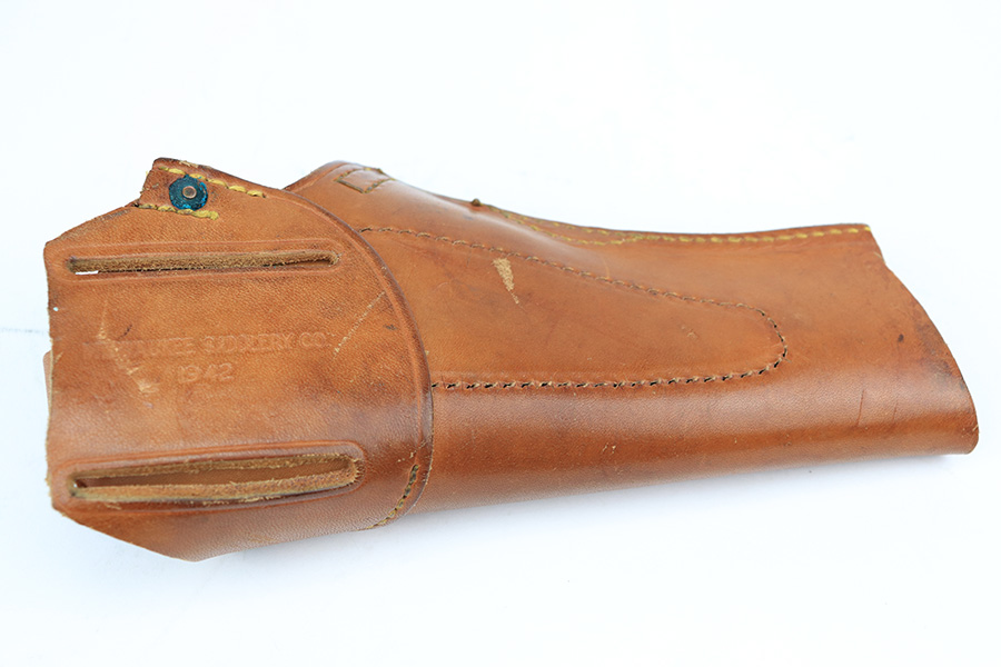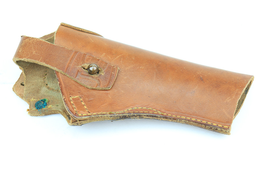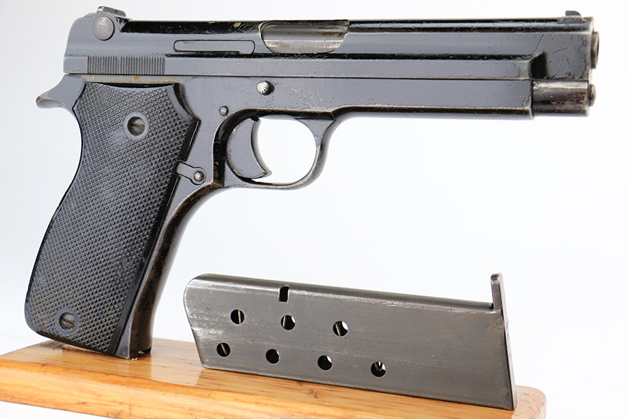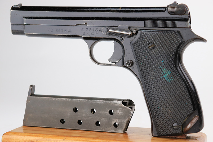 3/24/22 – This is a nice example of a French SACM Model 1935A chambered in 7.65mm. It lacks Nazi waffen proofs and has an “E” serial prefix, indicating it was manufactured immediately after the Nazi occupation during WW2. It comes as a rig with one proper magazine and a modified 1942-dated Colt 1911A1 holster (fits the gun well). The gun has retained roughly 80% of its original black painted finish. The majority of the finish loss is on the grip straps, but there is scratching and small chips in the paint throughout. Comes with very nice black bakelite grips – a small area of verdigris on the left side. The bore has strong rifling but there are a few tiny areas of minor pitting.