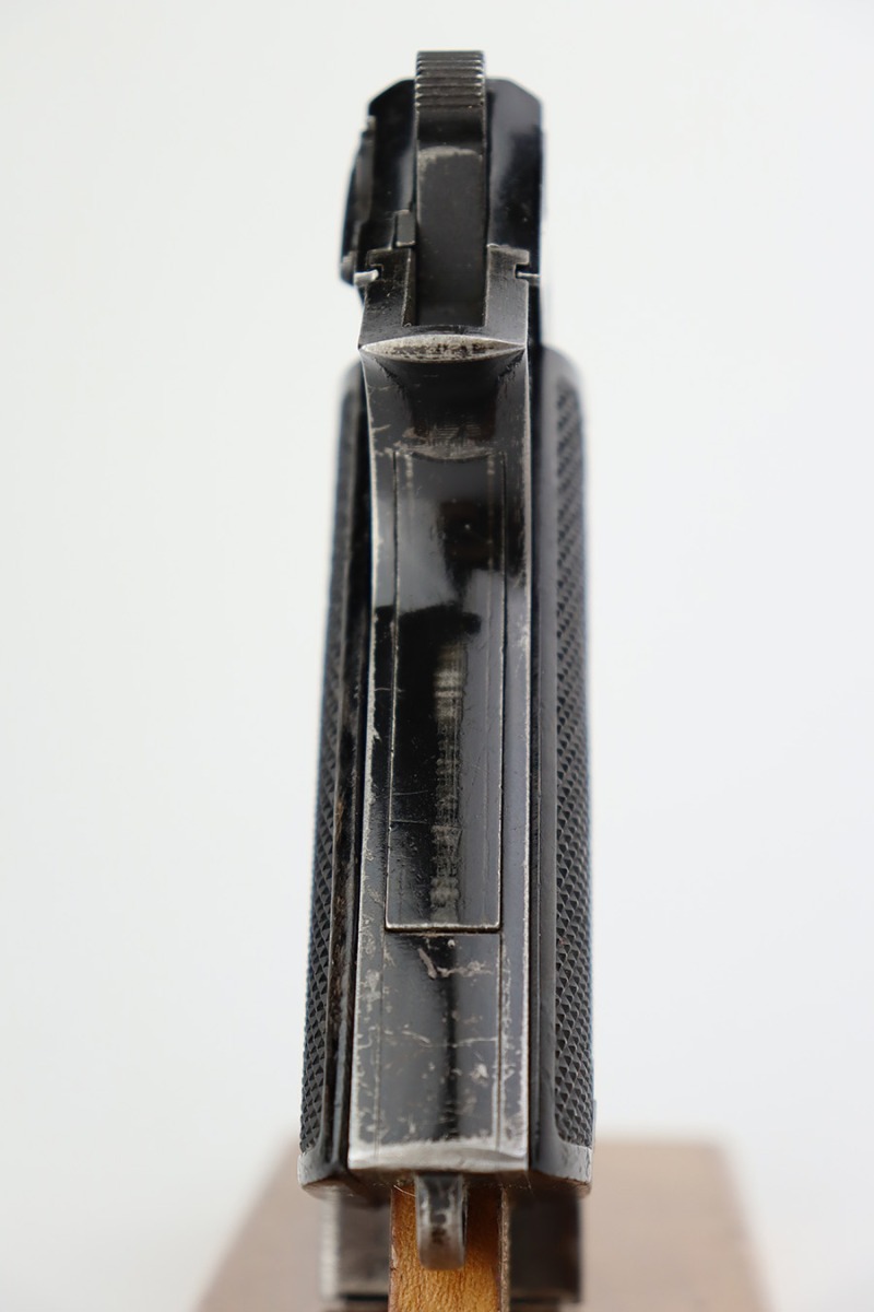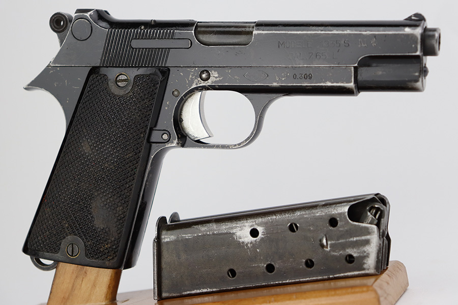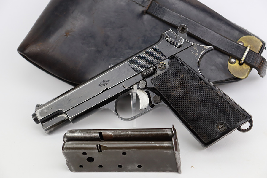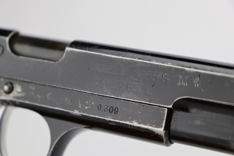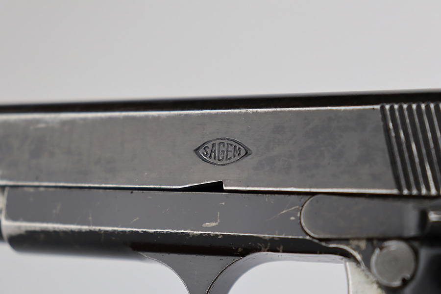7/28/23 – This is a nice example of a SAGEM Model 1935S M1, chambered in 7.65mm Longue. They were made in 1937-1960’s. It comes as a rig with two proper magazines and a black leather holster. The gun itself has retained roughly 65% of its black enamel finish with general high edge wear, chipping in the finish throughout, and thinning along the left side of the slide. Fitted with black bakelite grips – spots of wear and blemishes on both sides. The bore has decent rifling, but there is pitting in the grooves.