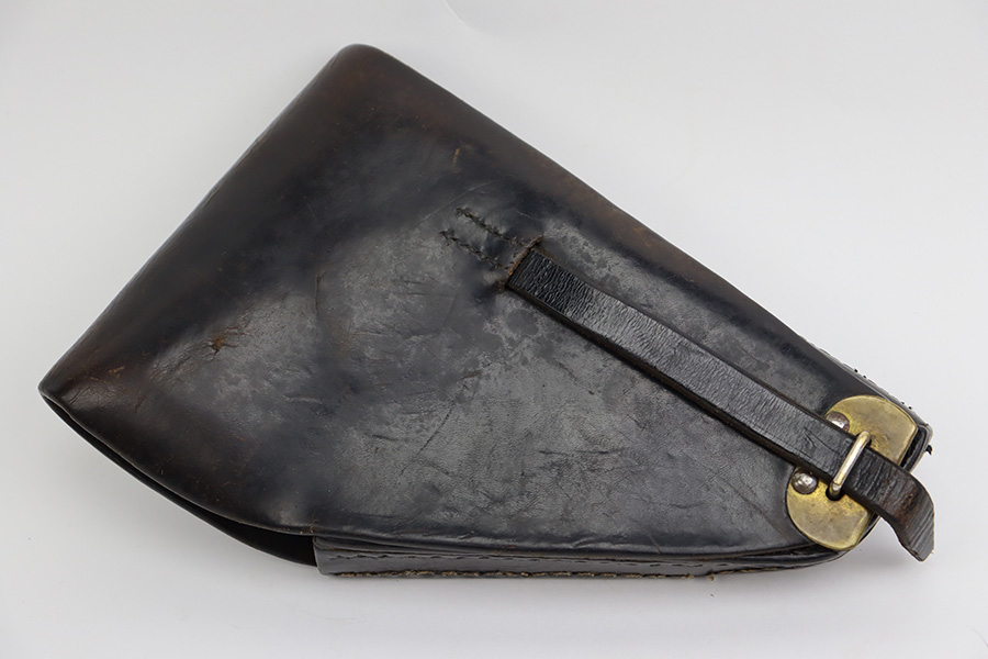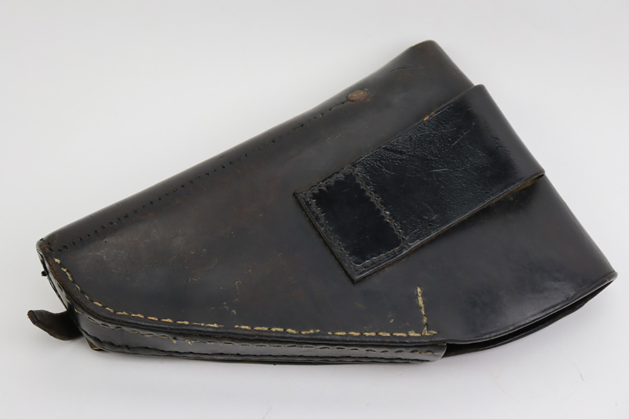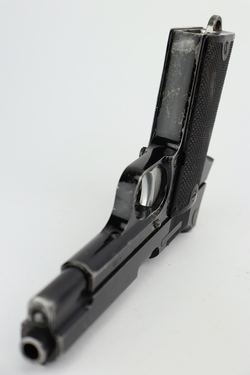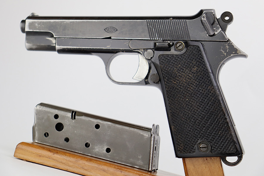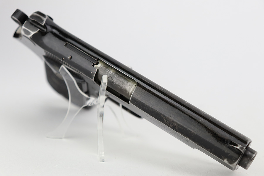 7/28/23 – This is a nice example of a SAGEM Model 1935S M1, chambered in 7.65mm Longue. They were made in 1937-1960’s. It comes as a rig with two proper magazines and a black leather holster. The gun itself has retained roughly 65% of its black enamel finish with general high edge wear, chipping in the finish throughout, and thinning along the left side of the slide. Fitted with black bakelite grips – spots of wear and blemishes on both sides. The bore has decent rifling, but there is pitting in the grooves.