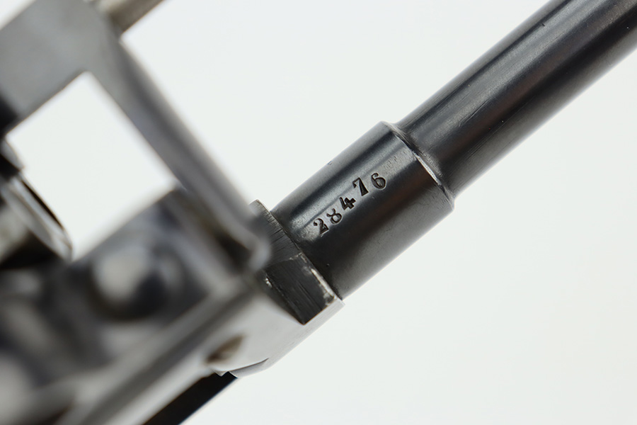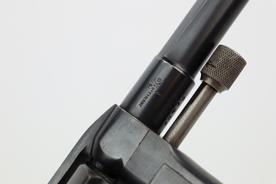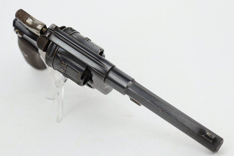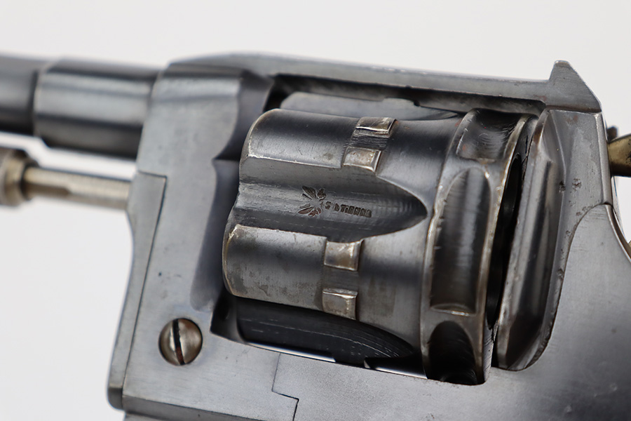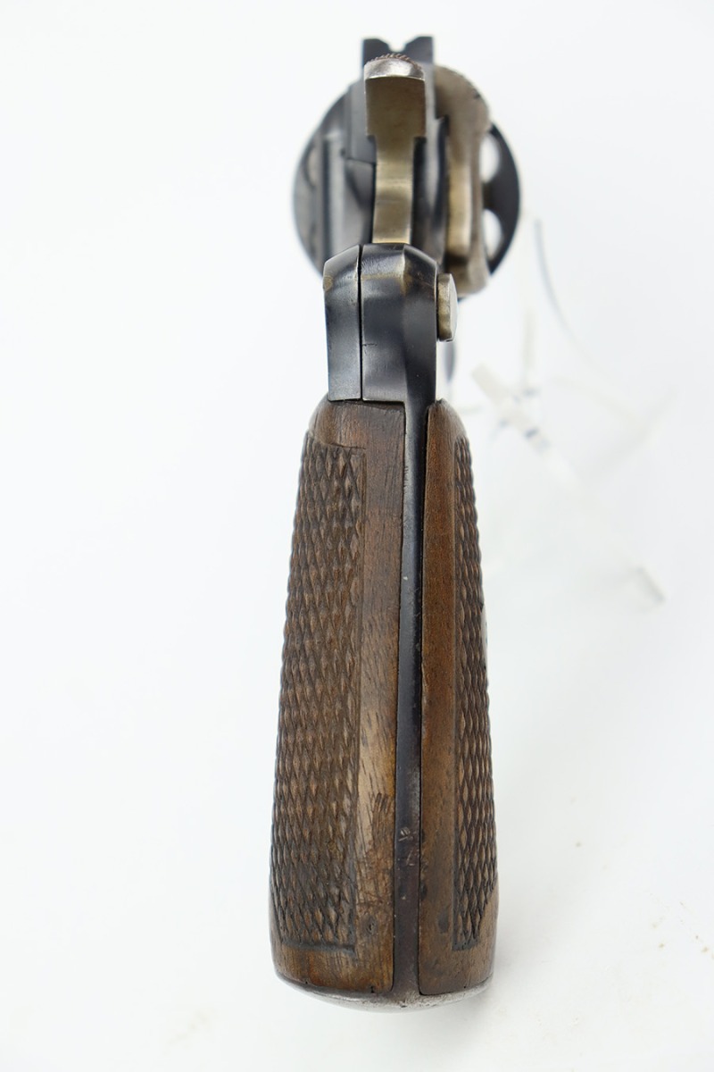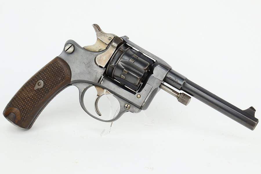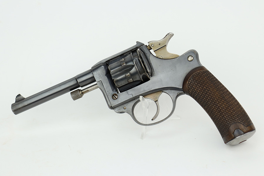 7/5/23 – This is an excellent example of a French St. Etienne Model 1892 revolver, manufactured in the early 1900’s and chambered in 8mm French. The gun is all matching and has the proper French St. Etienne proofs throughout. It has retained most of its bluing with minor general high edge wear, an area of wear on the underside of the trigger guard, and some very light patina on the right side of the frame. Fitted with excellent period-correct wood grips. The rifling in the bore is a bit worn with pin-pricking throughout.