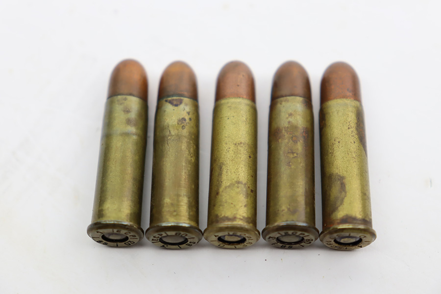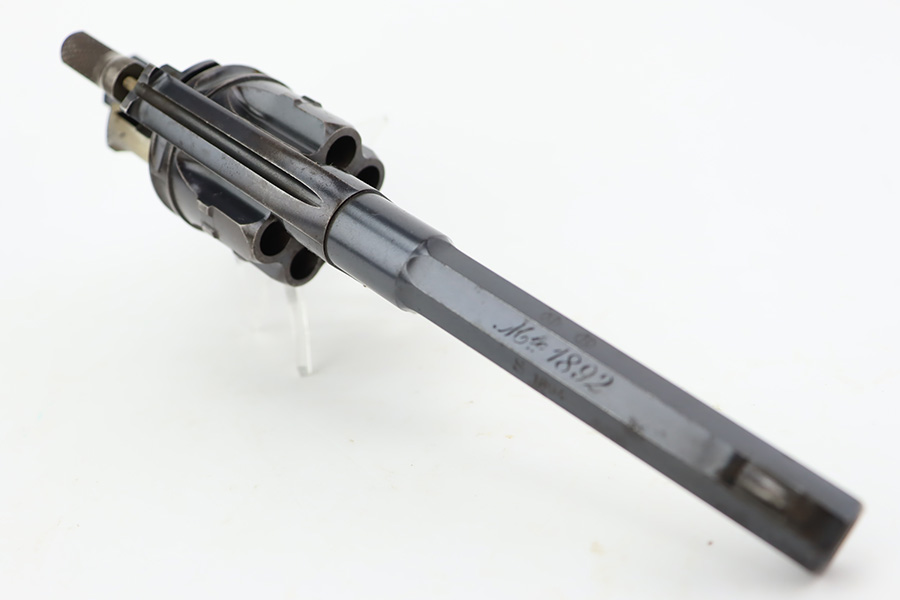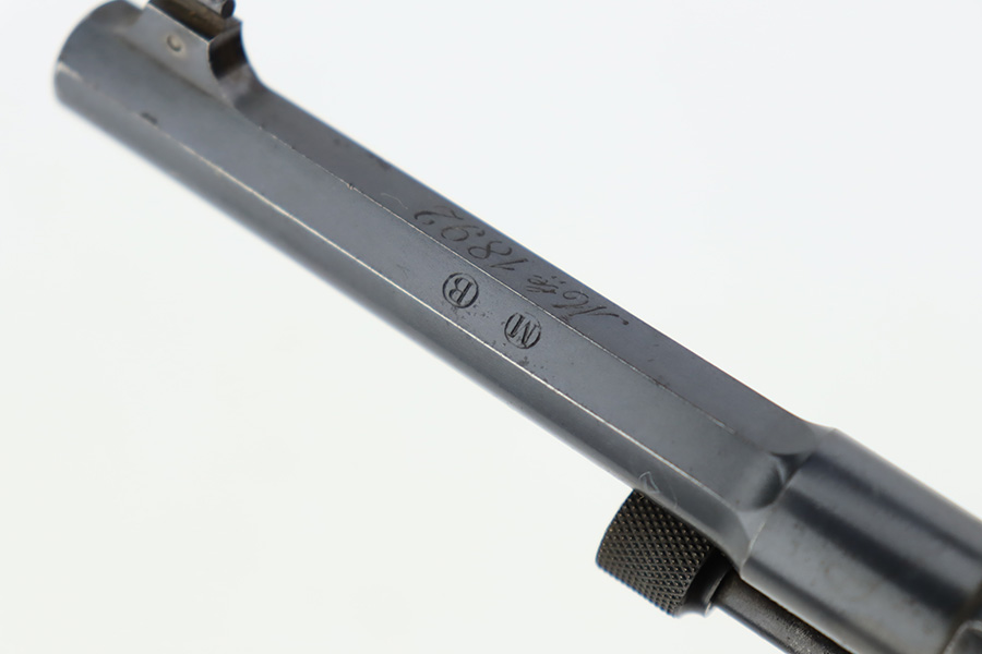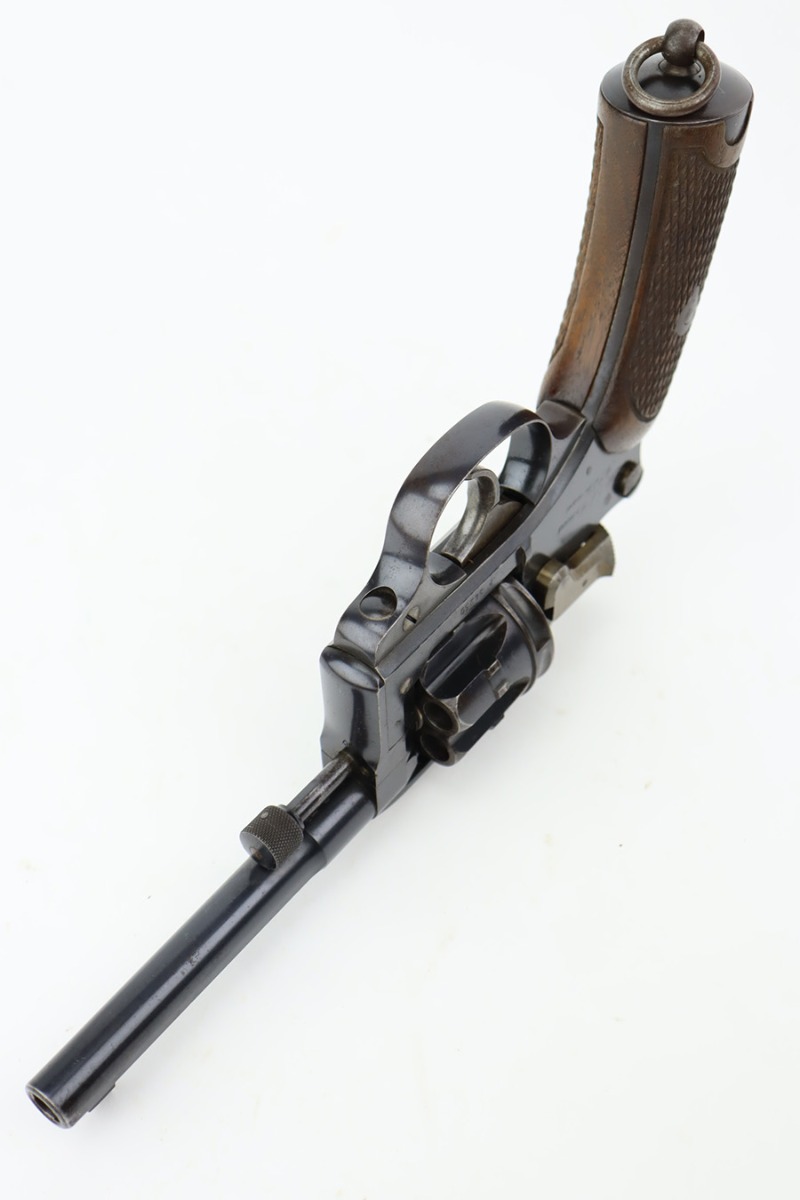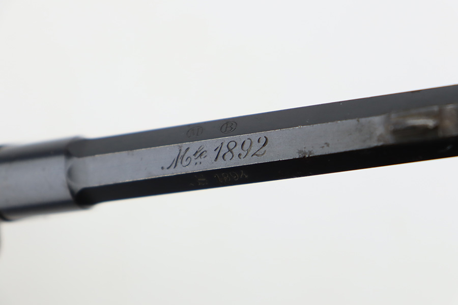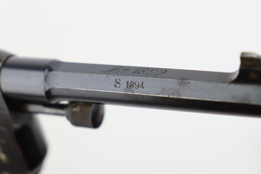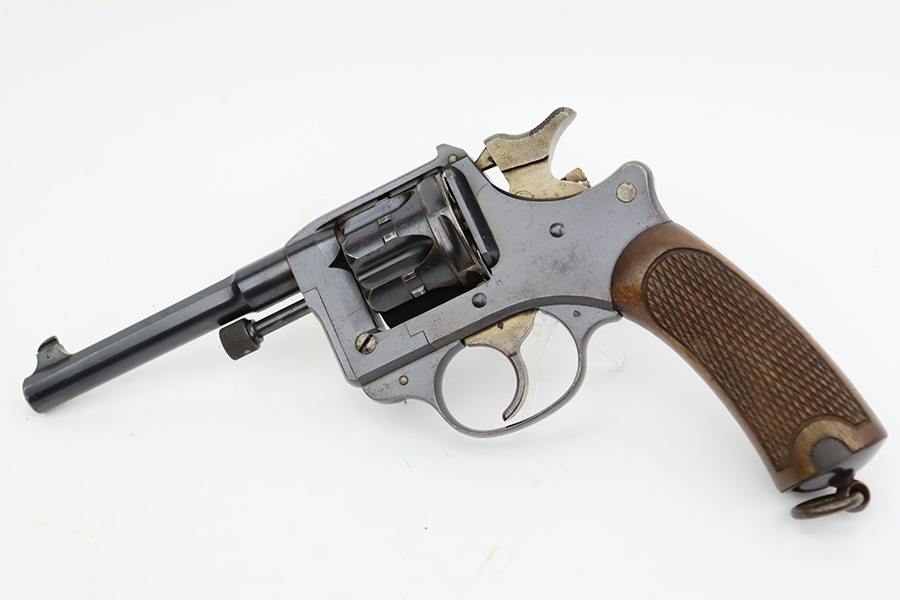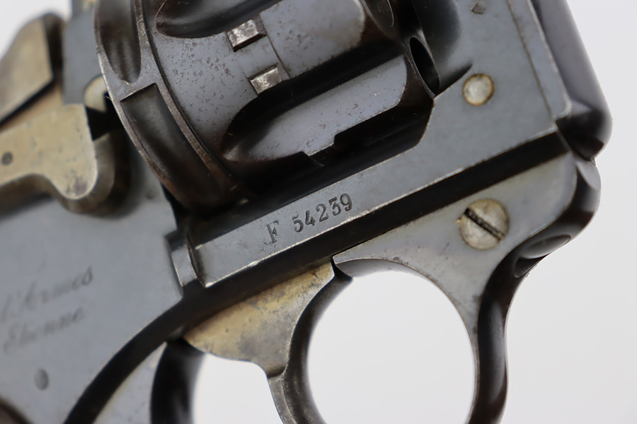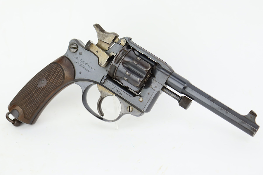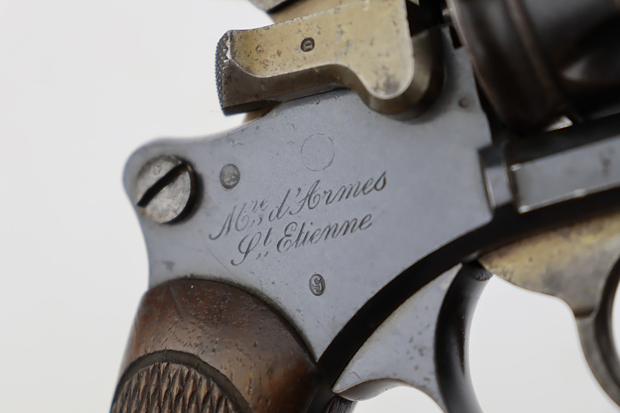 9/6/23 – This is an excellent example of a French St. Etienne Model 1892 revolver, manufactured in 1894 and chambered in 8mm French. The gun is all matching and has the proper French St. Etienne proofs throughout. It has retained most of its bluing with minor general high edge wear, areas of very light freckling here and there, and some minor pitting on the right side of the barrel. Fitted with excellent period-correct wood grips. The bore has strong rifling, but there are a couple of small spots of oxidation and pitting. Comes as a rig with a leather holster and 5 ammo cartridges. This gun is an antique – No FFL required.