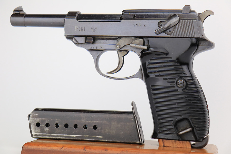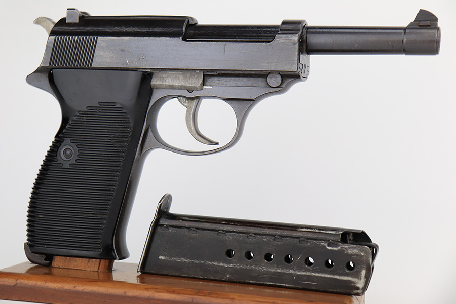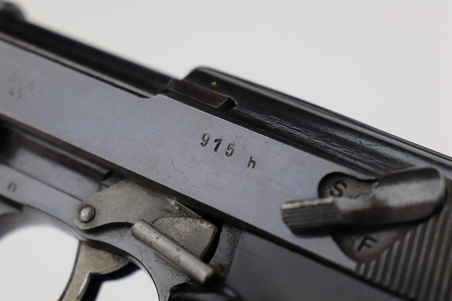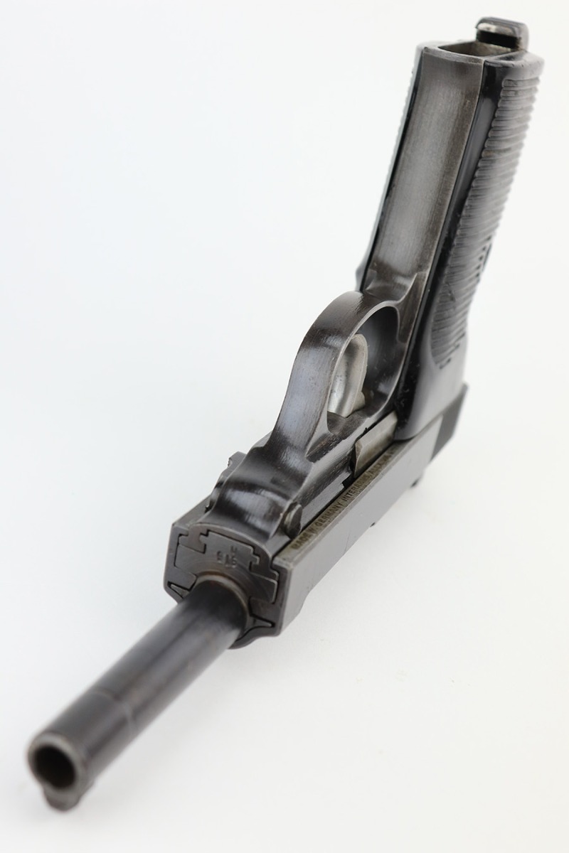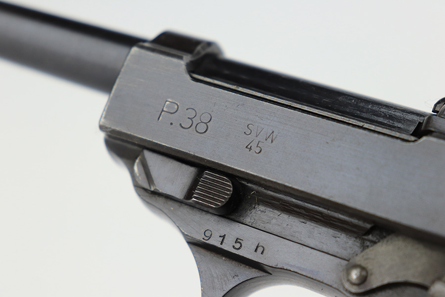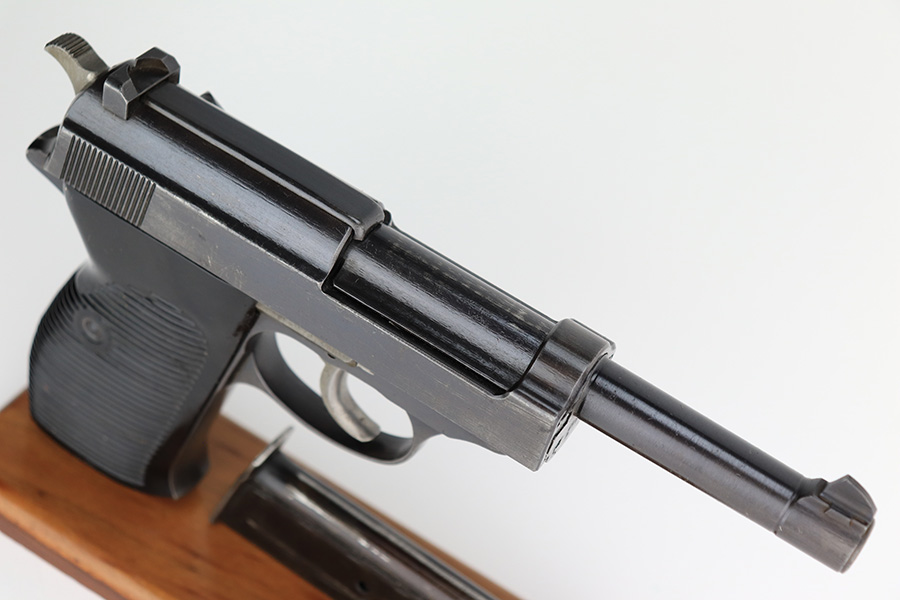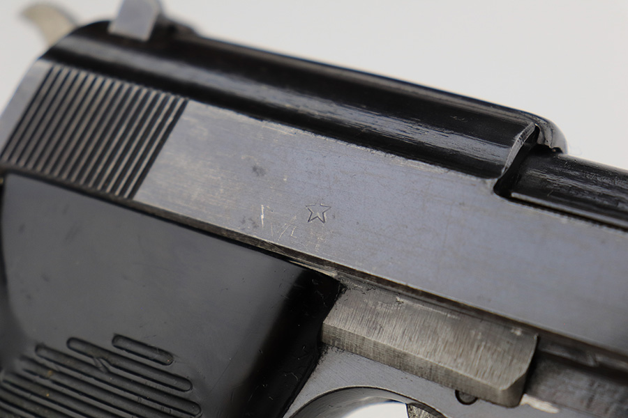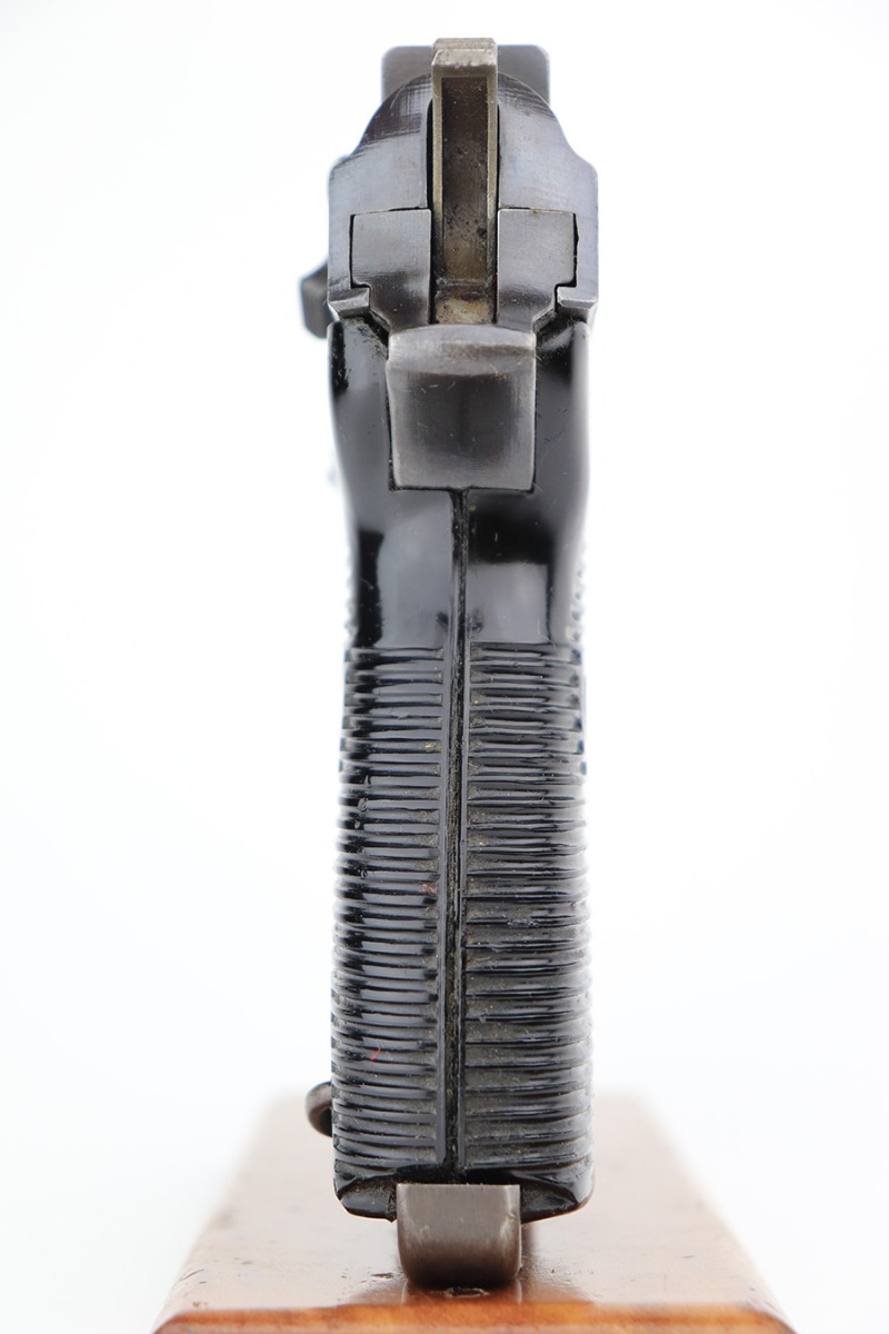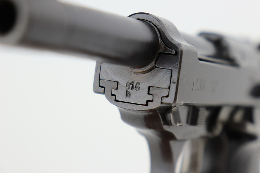 4/20/23 – This is a very nice example of a Mauser P.38 put together by the French using leftover Nazi parts immediately after WW2. This one was imported by Interarms and has an import mark on the underside of the slide. The gun is all matching, has a French star on the right side of the slide, and has one “Waffen 135” Nazi military acceptance proof on the barrel. It has retained about 92% of its finish with very minor thinning on the front strap and light, somewhat scratchy wear along the right side of the slide. Fitted with nice black plastic grips – light scuffs and handling marks on both sides. Comes with a waffen-proofed jvd magazine. The bore has good rifling, but there is light freckling throughout. De-cocker is functional.