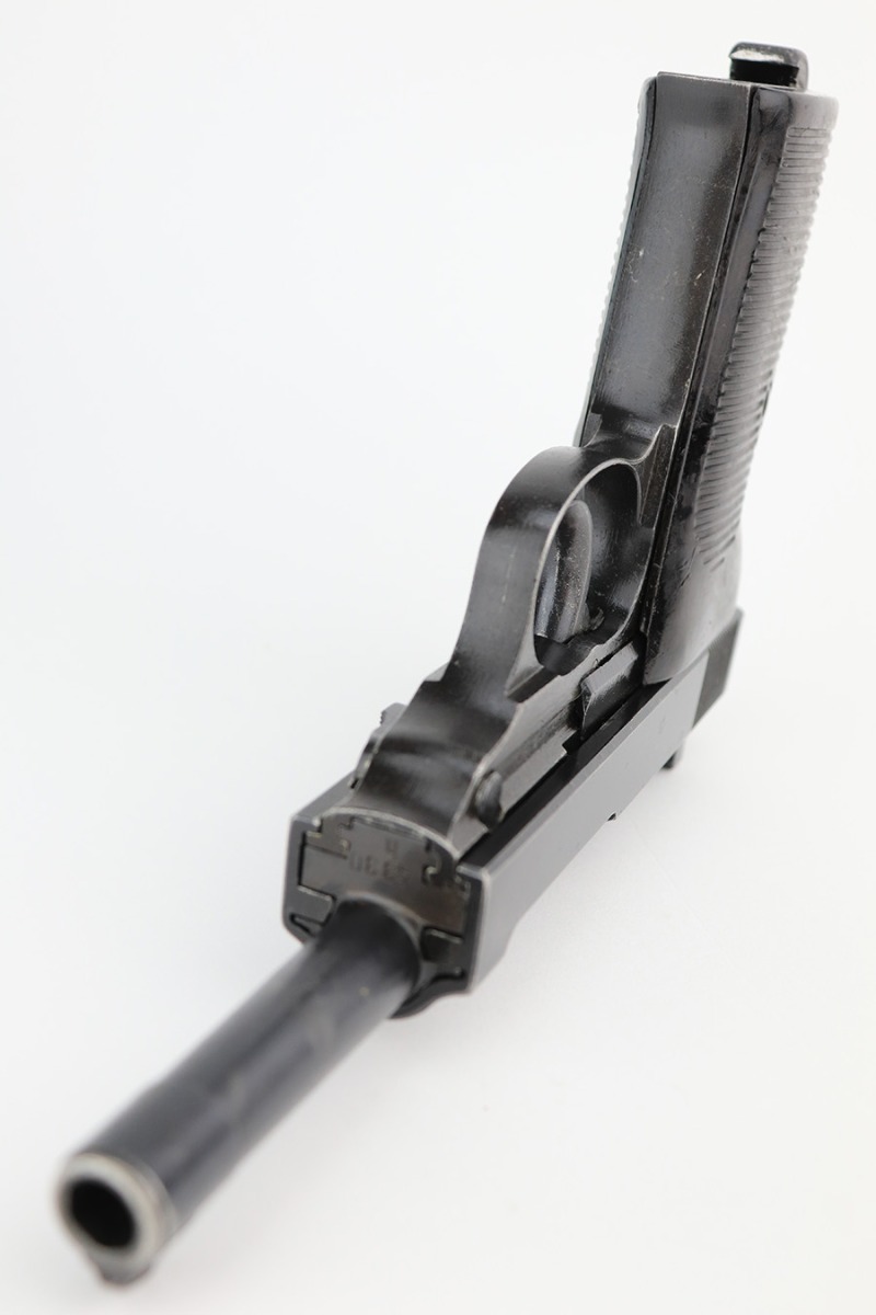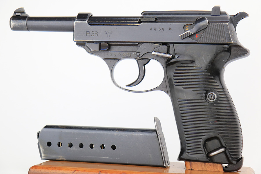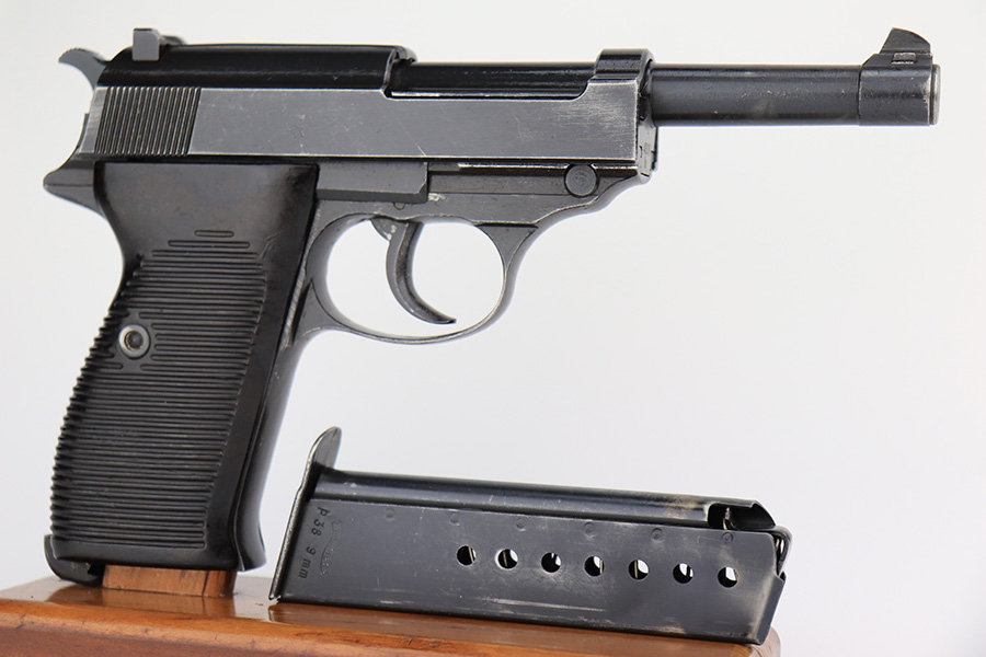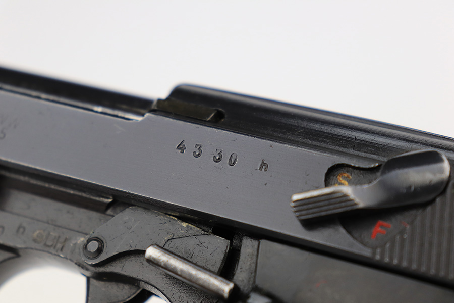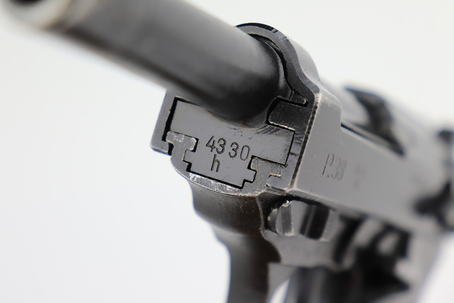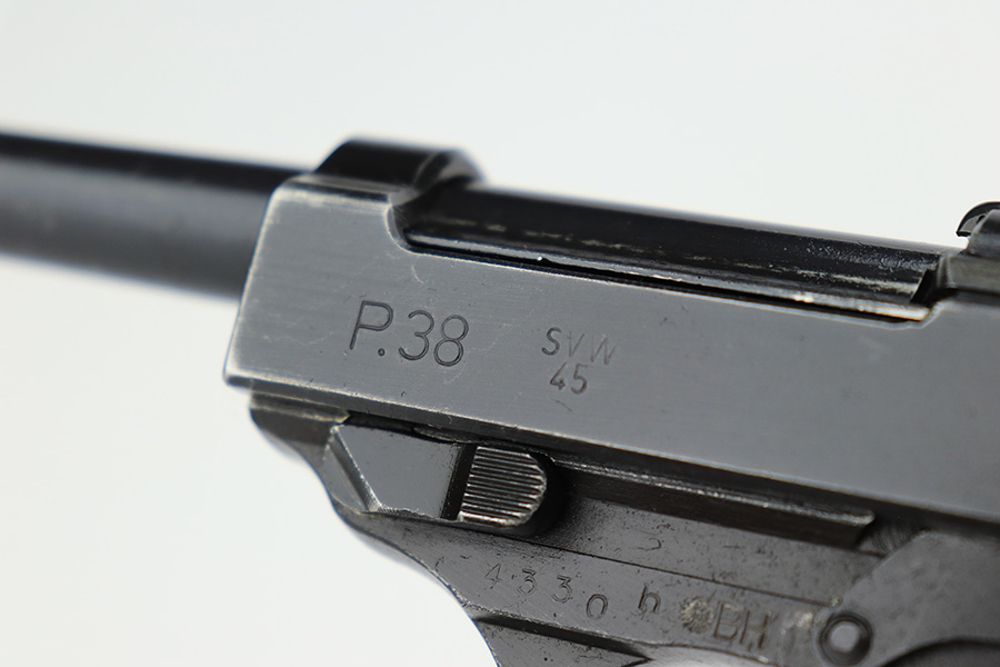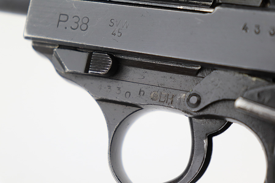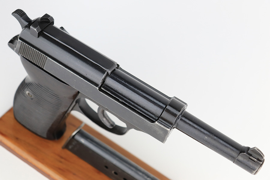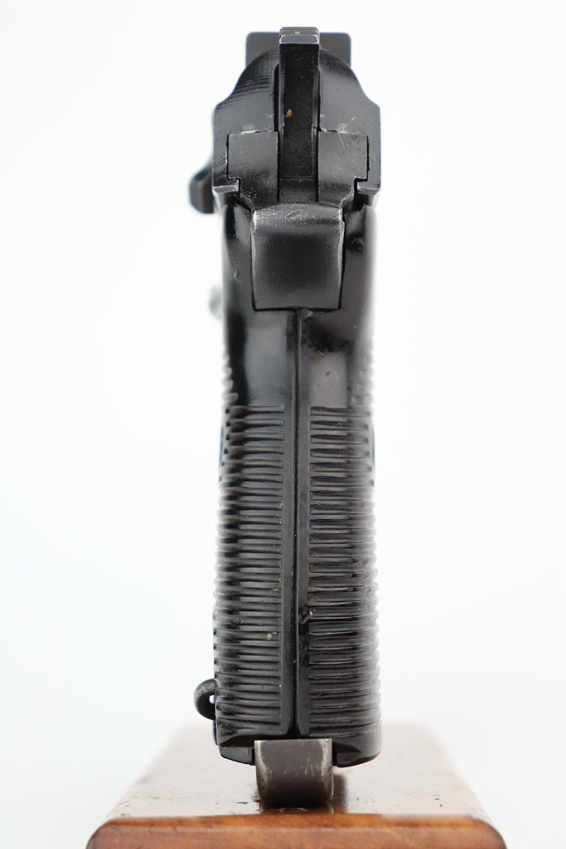 4/21/23 – This is an excellent example of a Mauser P.38 put together by the French using leftover Nazi parts immediately after WW2. This one is all matching and has an extremely faint import mark on the right side of the frame. There is a French star on the right side of the slide, and there is one “Eagle 359” Nazi military acceptance proof on the barrel, indicating it was made by Walther. There is also an “Eagle BH” proof on the left side of the frame, indicating it was issued to the Austrian military. It has retained about 96% of its finish with minor wear around the muzzle and around the high edges of the slide. Fitted with excellent blackish-brown bakelite grips and comes with a post-war magazine. The bore has decent rifling, but there is pin-pricking throughout. De-cocker is functional.