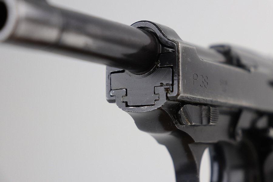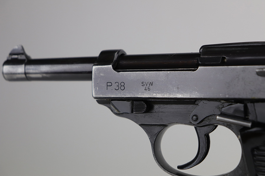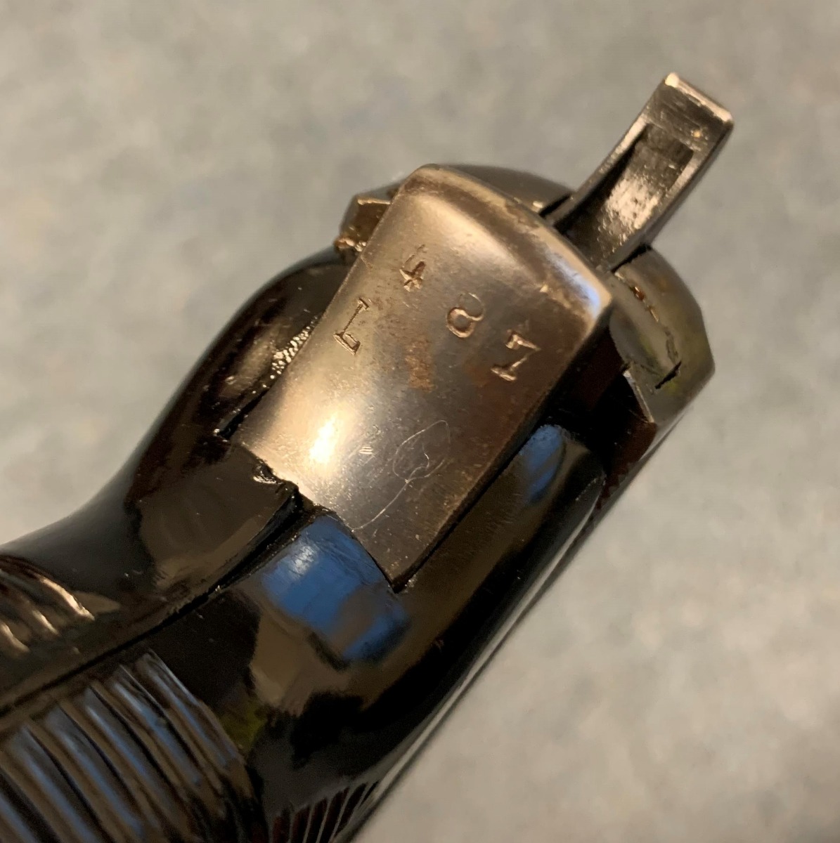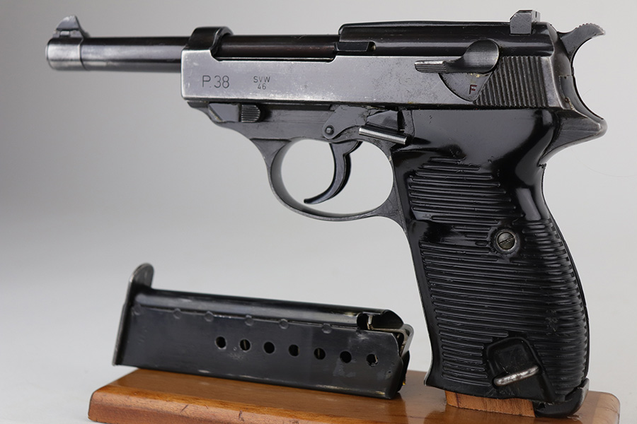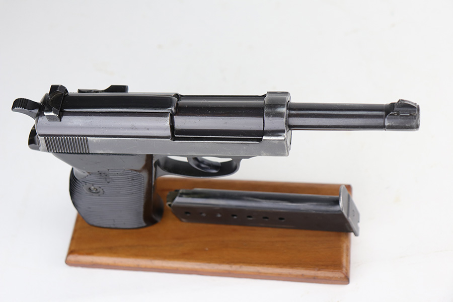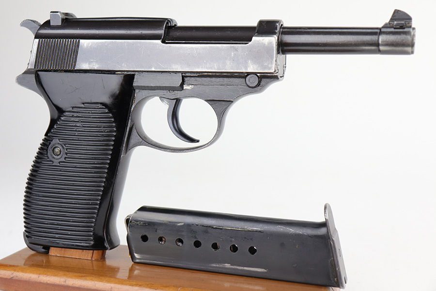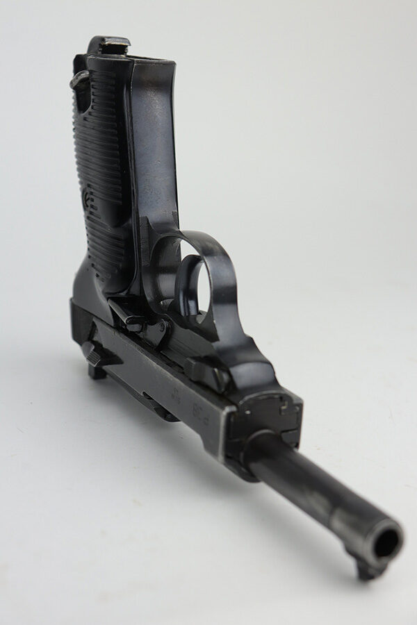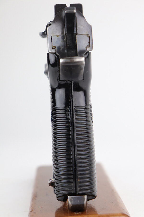 2/28/23 – This is a rare French Mauser P.38 manufactured in 1946. It has a rare “L” block serial number. This one has no serial numbers, but does have French proofs on the barrel. It comes with excellent post-war grips and a proper magazine. It has retained roughly 85% of its finish. There is spotty, scratchy wear on both sides of the slide, on the barrel, and around the muzzle. Minor wear and freckling on the front strap. Excellent bore – shiny with strong rifling. De-cocker is functional.