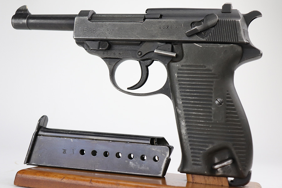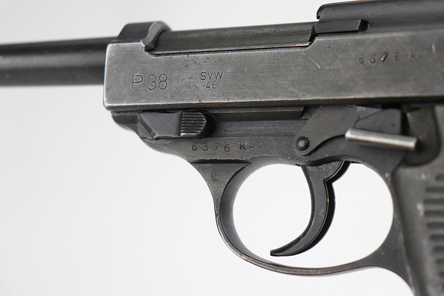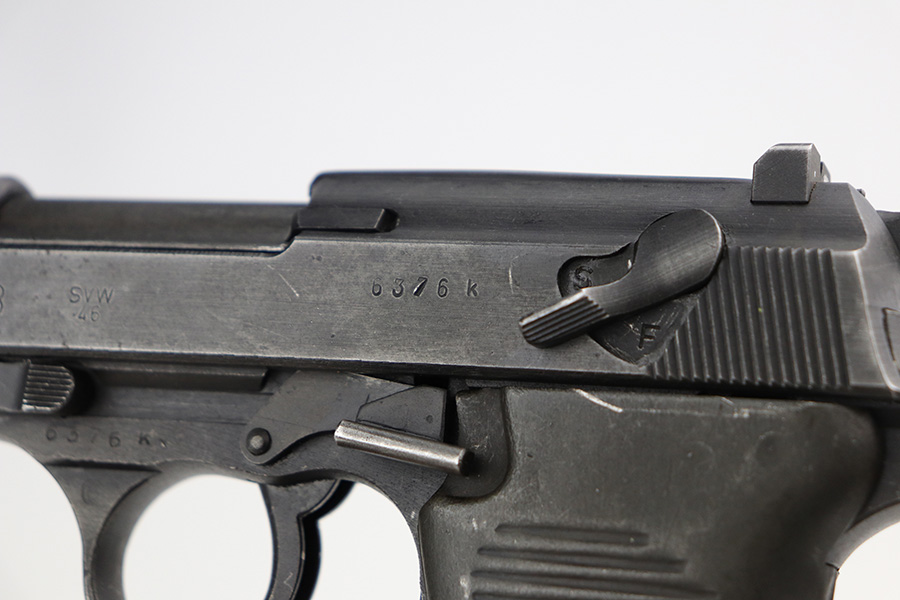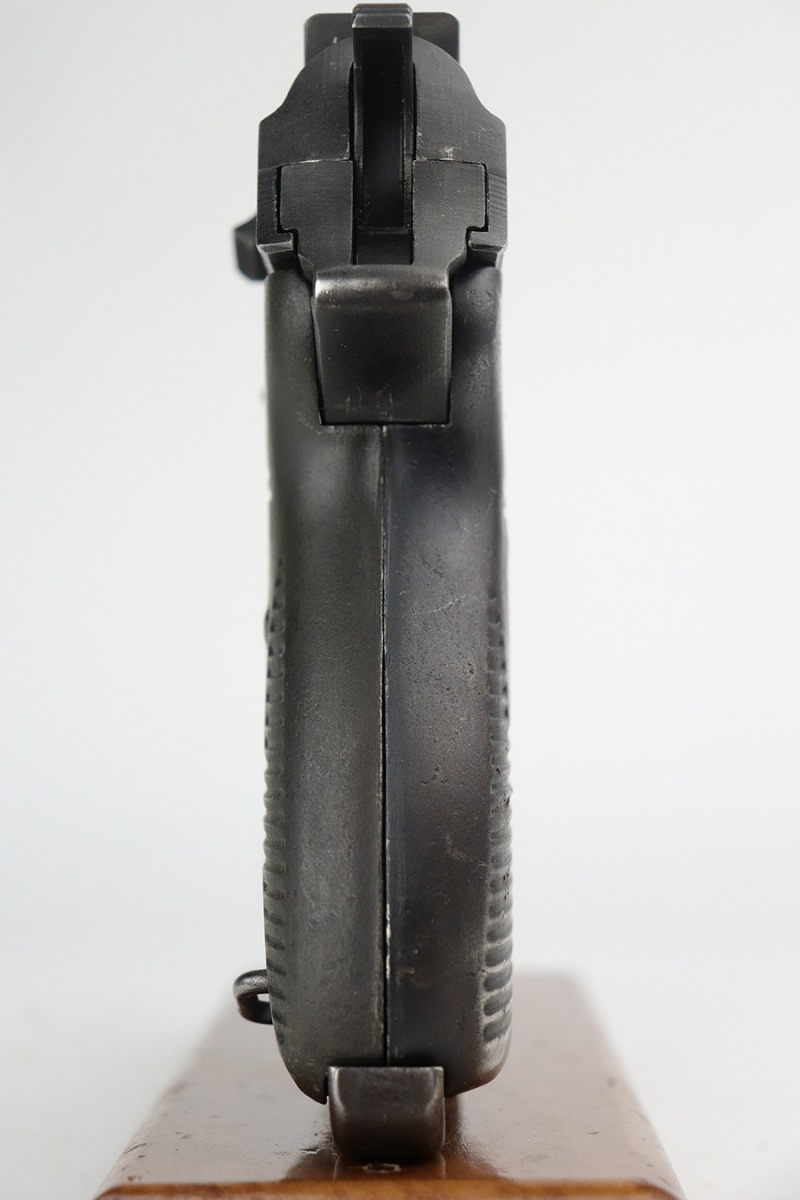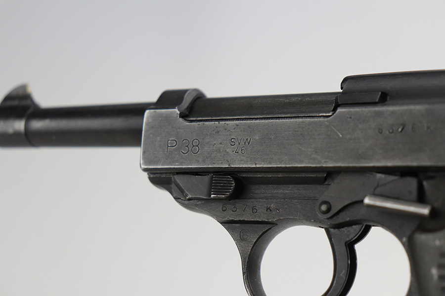 9/27/21 – This is a very nice example of an “SVW 46” Mauser P.38 assembled by the French in 1946 using leftover Nazi parts. It is all matching and has a French Star proof on the right side of the slide. There is a “Waffen 135” Nazi military proof on the barrel. This one also comes with desirable “Gray Ghost” French grips and a waffen-proofed magazine. The gun has retained about 93-94% of its dull finish. Generally, there is minor wear on the high edges of the slide and around the muzzle. Minor thinning on the top of the barrel, through the ejection port. While there isn’t a ton of actual finish loss, there is splothcy discoloration throughout. Minty bore. De-cocker is functional.