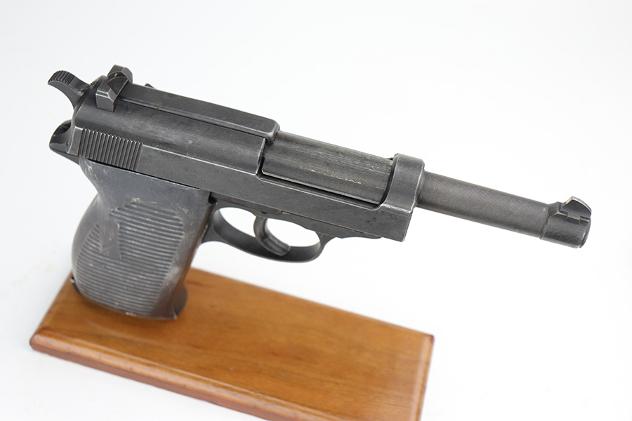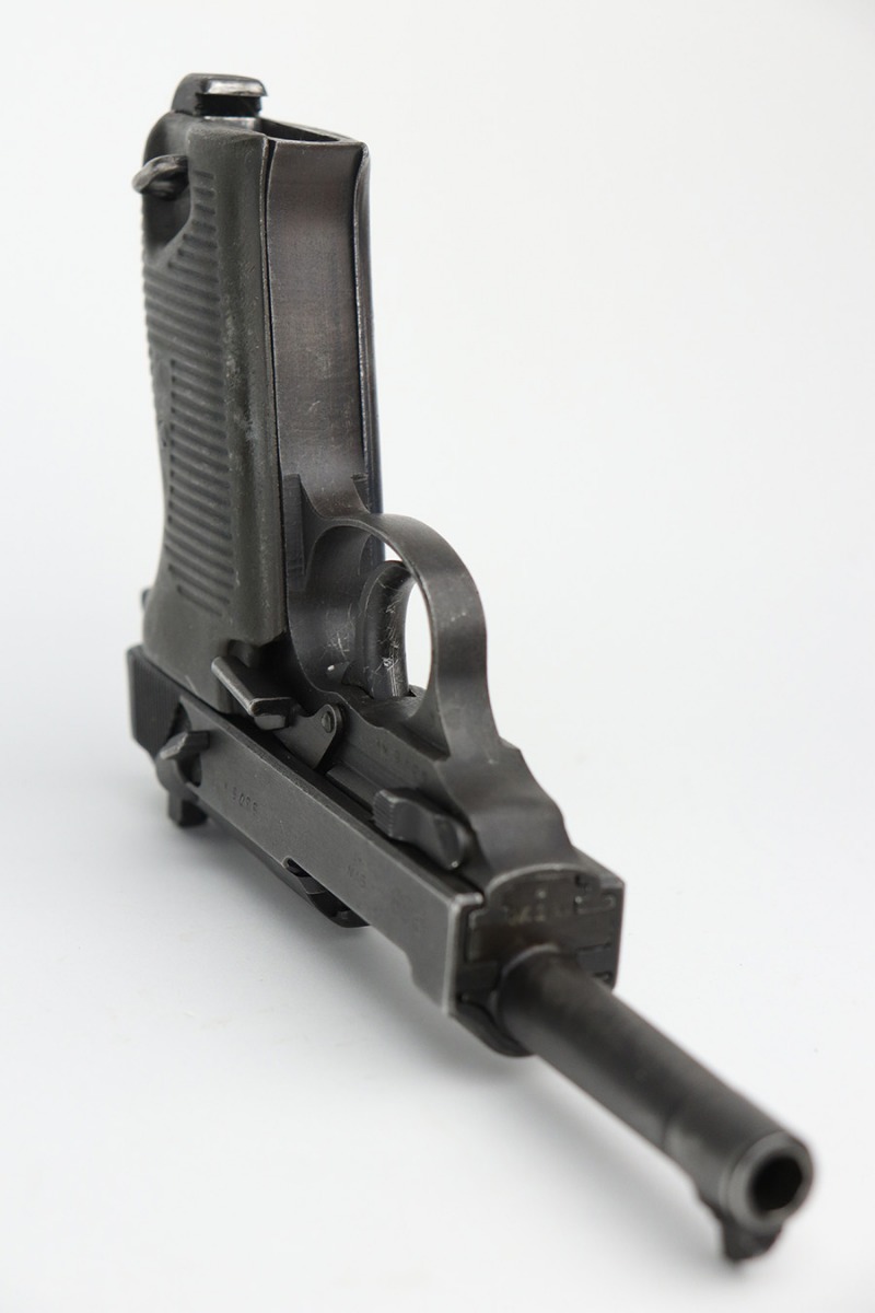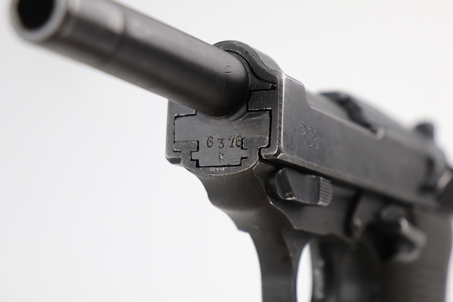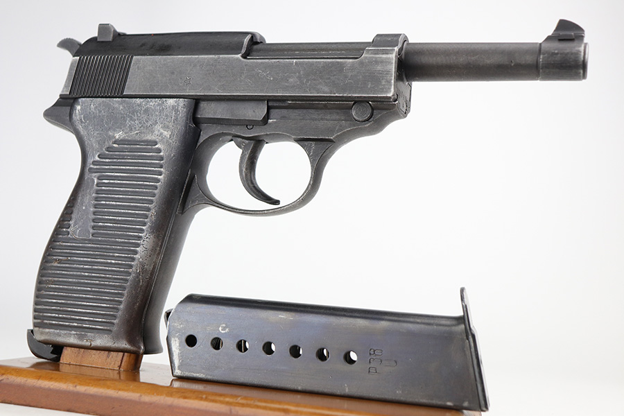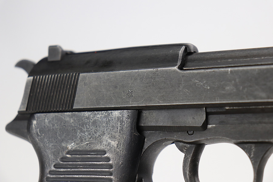 9/27/21 – This is a very nice example of an “SVW 46” Mauser P.38 assembled by the French in 1946 using leftover Nazi parts. It is all matching and has a French Star proof on the right side of the slide. There is a “Waffen 135” Nazi military proof on the barrel. This one also comes with desirable “Gray Ghost” French grips and a waffen-proofed magazine. The gun has retained about 93-94% of its dull finish. Generally, there is minor wear on the high edges of the slide and around the muzzle. Minor thinning on the top of the barrel, through the ejection port. While there isn’t a ton of actual finish loss, there is splothcy discoloration throughout. Minty bore. De-cocker is functional.