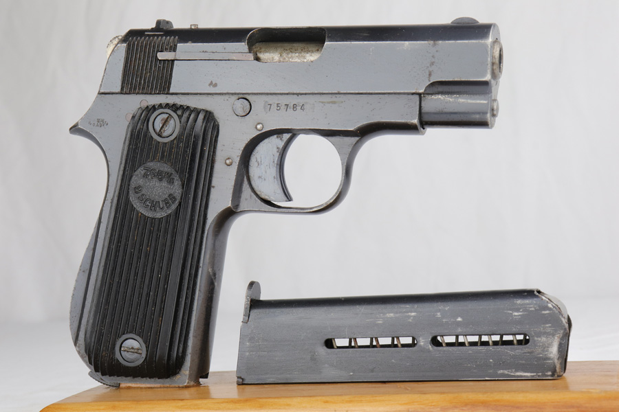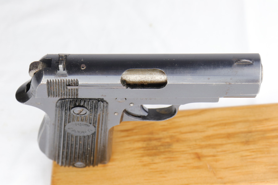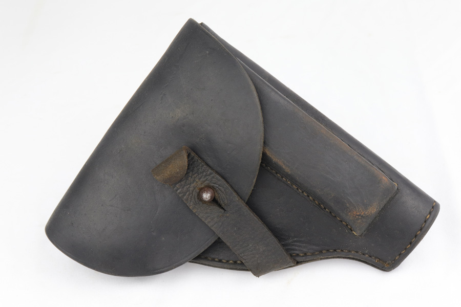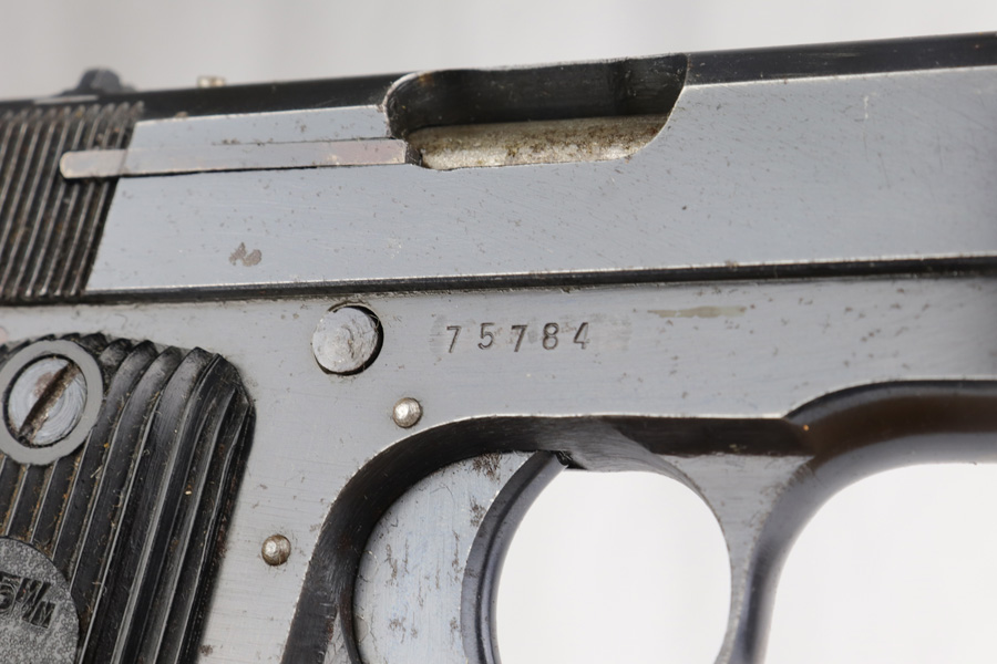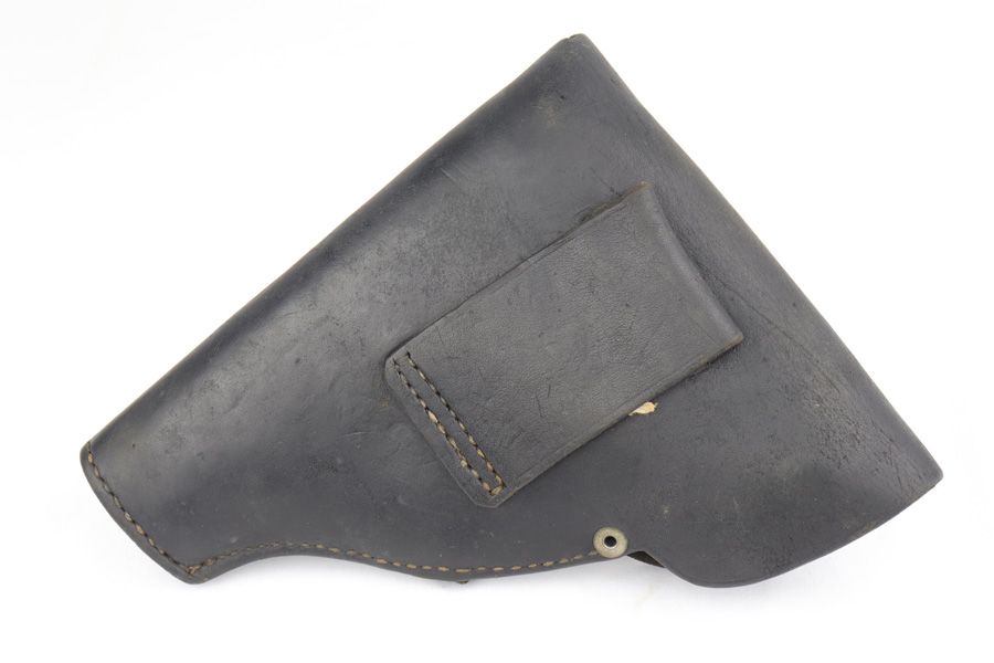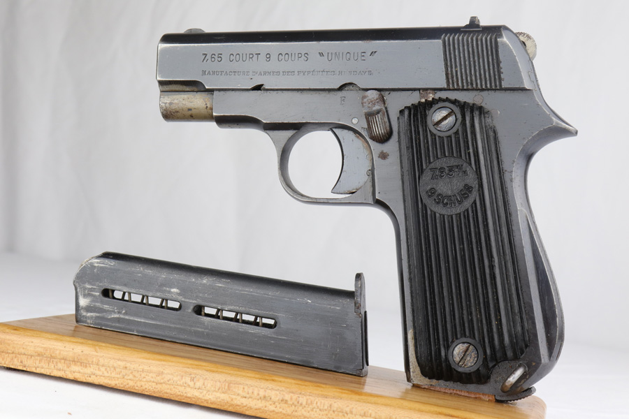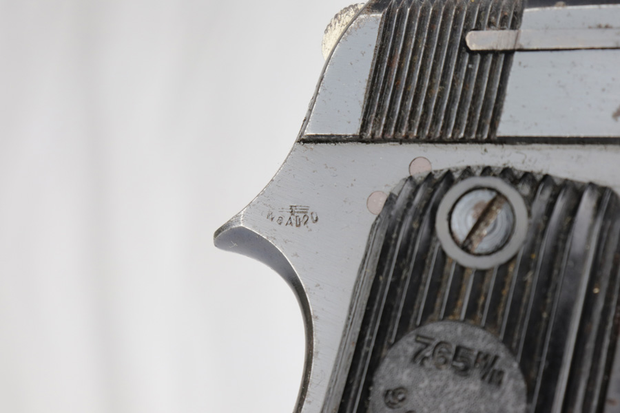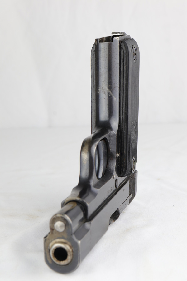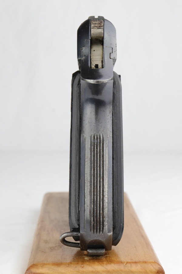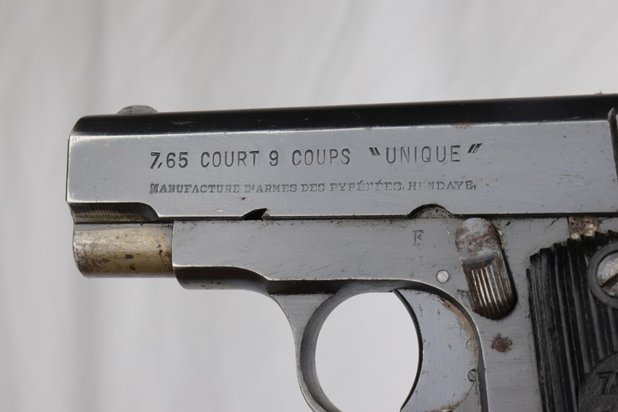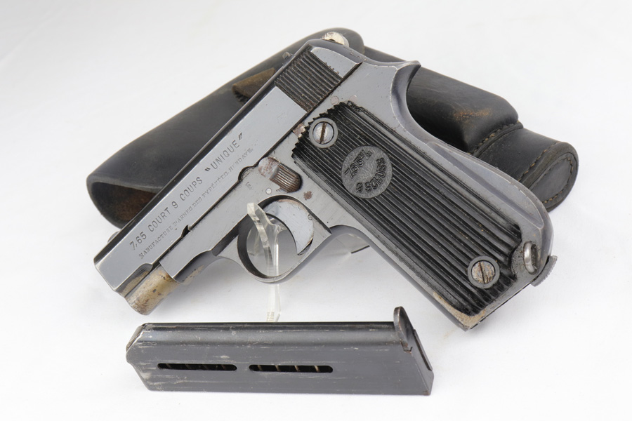 3/5/19 – This is an original Nazi production French Unique model 17 pistol rig. This is known as the “Kriegsmodell”, meaning it was made after the Germans took over the factory and made slight modifications to the original model 17 pistol. About half as many Kriegsmodell 17s were made compared to the standard model 17. The overall finish is about 91-93% as shown by our photos. The profile view is pretty nice but there’s an area of discoloration/finish loss on the underside of the frame and slide, toward the muzzle. There’s also some rub wear on the front strap and trigger guard. Minty bore. Excellent grips and proper magazine. Pistol is fully functional, though the safety lever is slightly loose. It still functions properly, though. Comes with an unmarked holster that fits the gun nicely – not sure if it is period original or post-war.