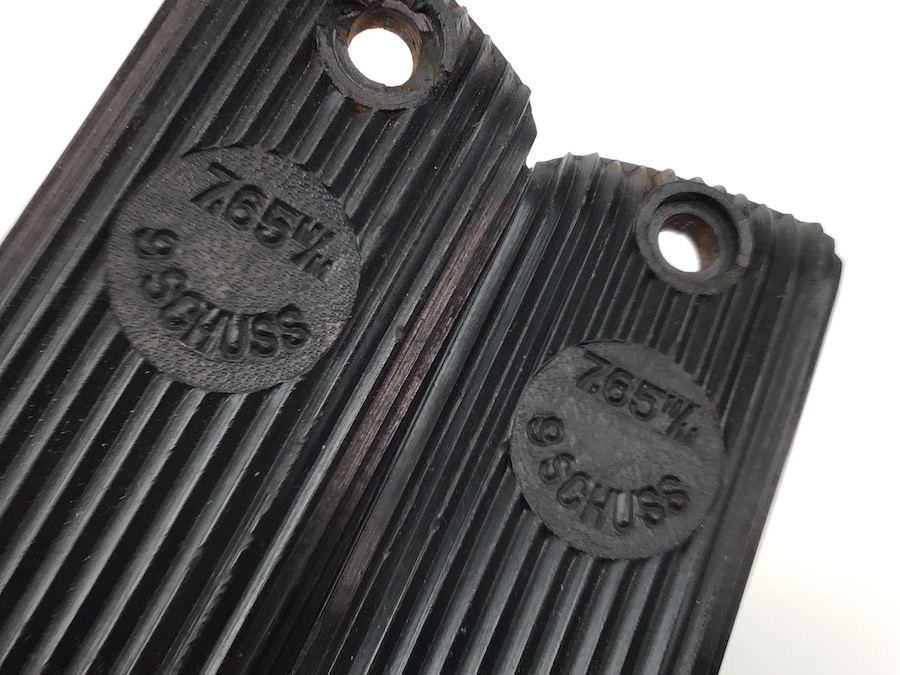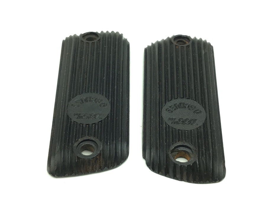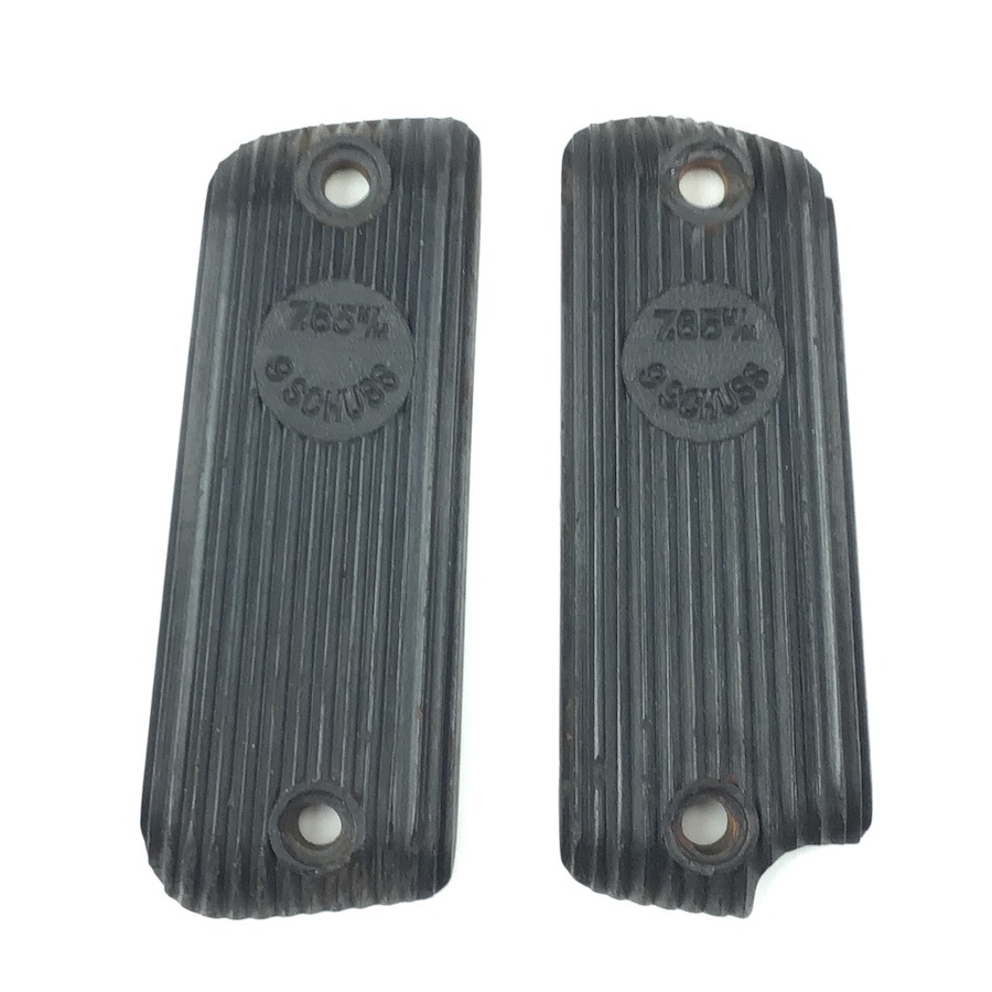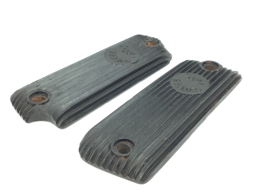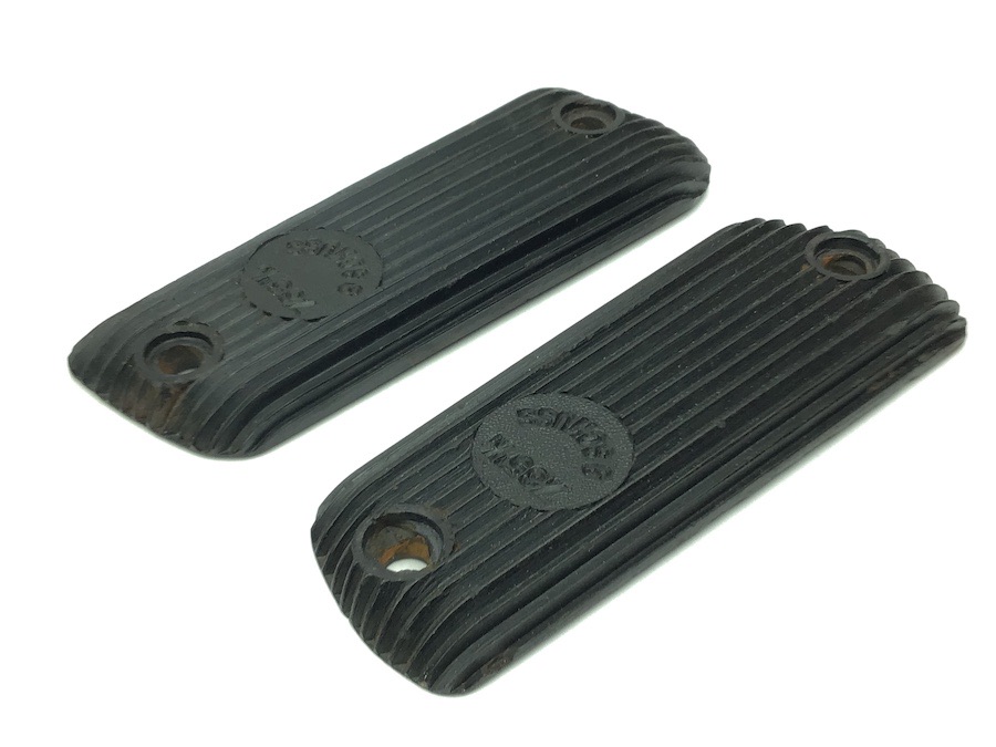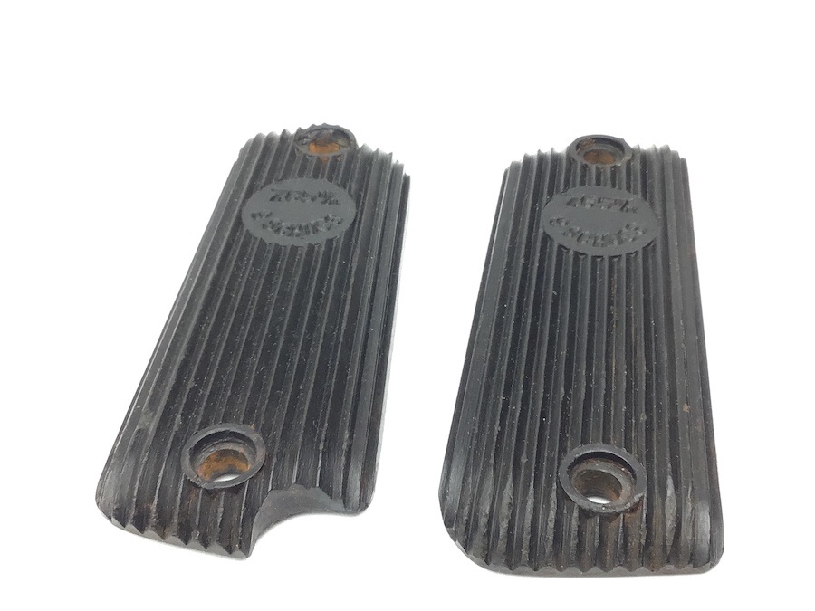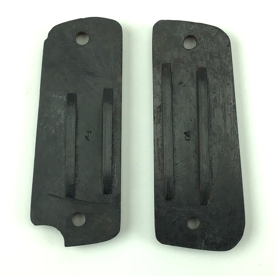 10/13/22 – Original and great condition. Black bakelite grip panels for the French Unique handgun. Caliber and cartridge capacity distinctly etched into the each panel. Minor wear around the screw holes, otherwise in great condition.