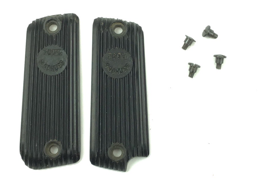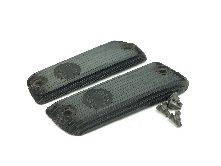 10/17/22 – Original and great condition. Black bakelite grip panels for the French Unique handgun. Includes original screws. Caliber and cartridge capacity distinctly etched into the each panel. Minor wear around the screw holes, otherwise in great condition.