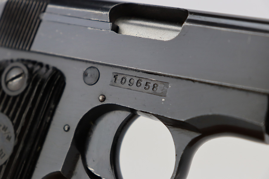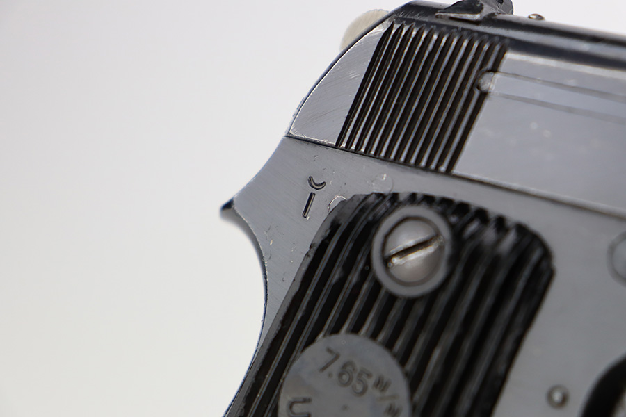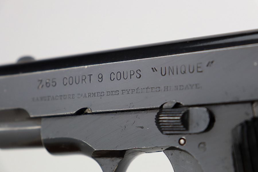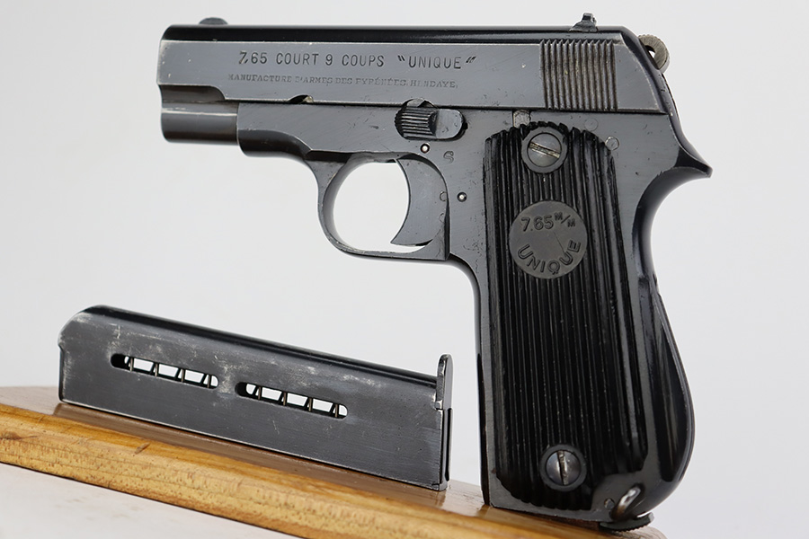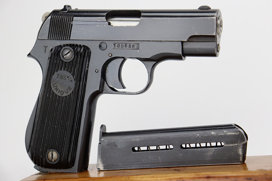 8/25/23 – This is an excellent example of a French Unique Model RR51 manufactured after WW2. It is all matching, has a milled serial number, and has a “palm tree” marking on the right side of the frame near the tang, indicating this gun was delivered to the Moroccan police. It has retained 95% of its bluing. There is just minor muzzle wear and some tiny handling marks on the front strap. Fitted with excellent correct black bakelite grips and comes with one proper magazine. Mint bore.