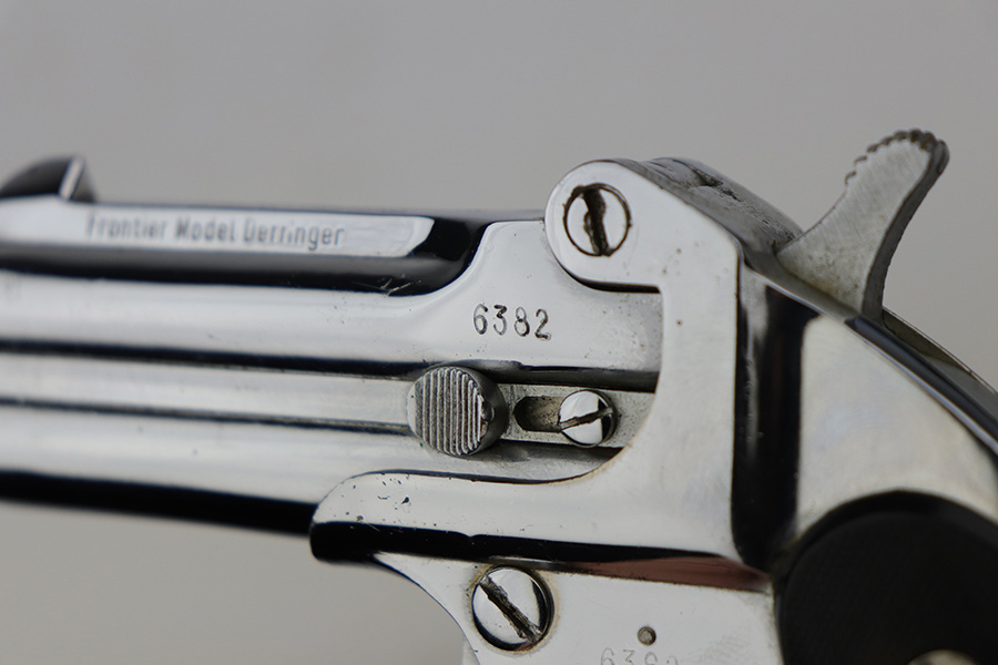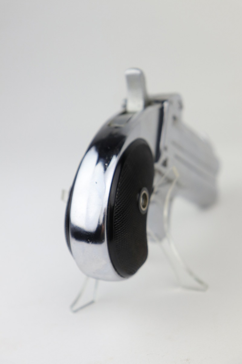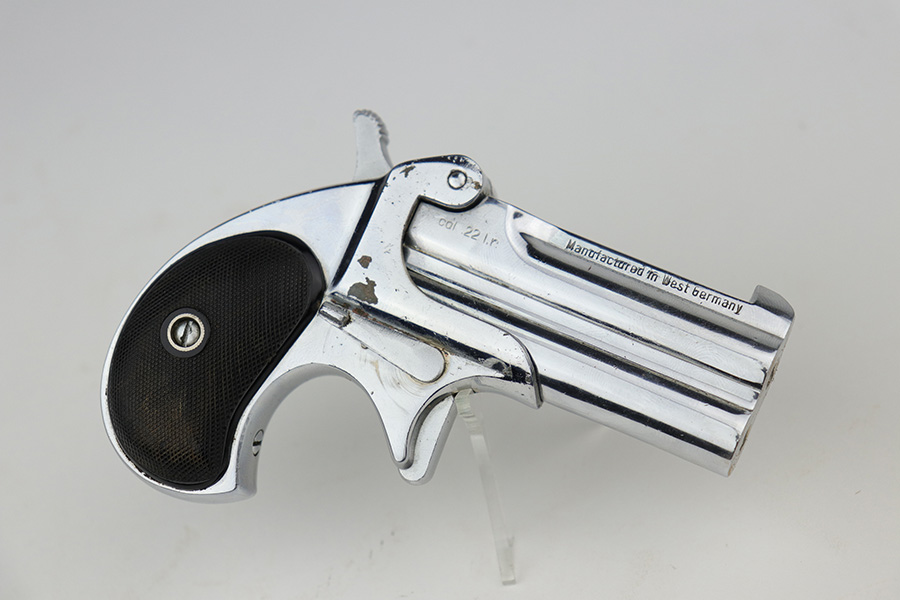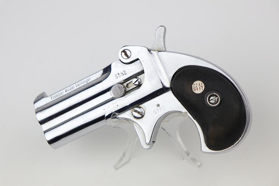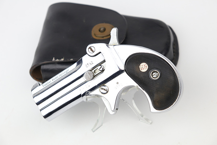 9/29/21 – This is an excellent example of a Frontier Model Derringer pistol, chambered in .22 LR and manufactured in West Germany. It is all matching and has the proper “Eagle N” West German proofs. It comes with a nice black leather holster that fits the gun well. The gun has retained about 97% of its nickel-plated finish. There are some tiny chips in the nickel here and there, most noticeable on the right side of the frame. Comes with excellent black plastic grips. The bores are excellent – shiny with strong rifling.