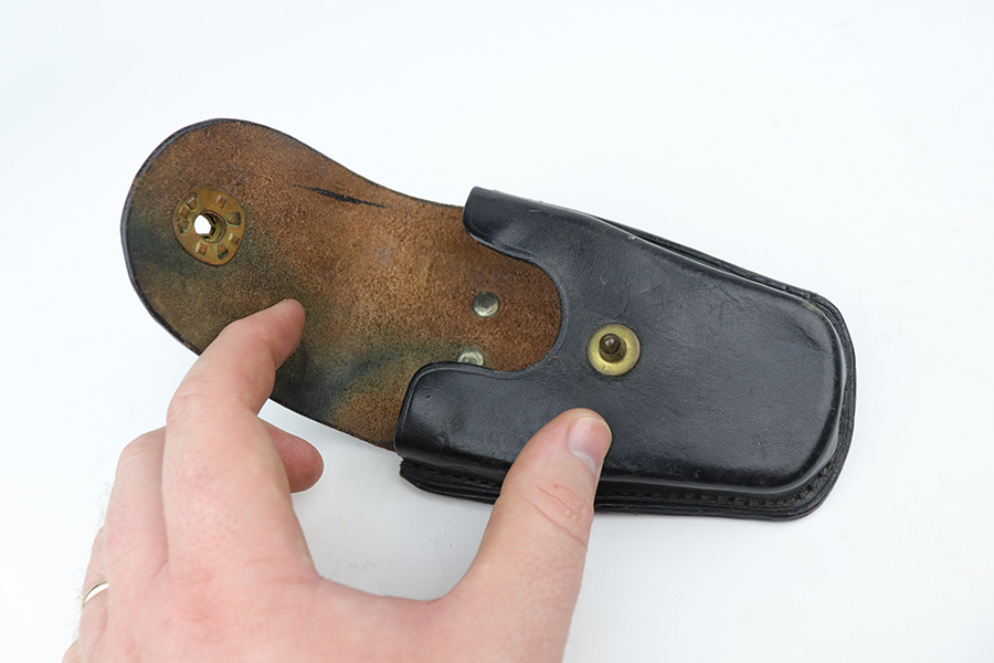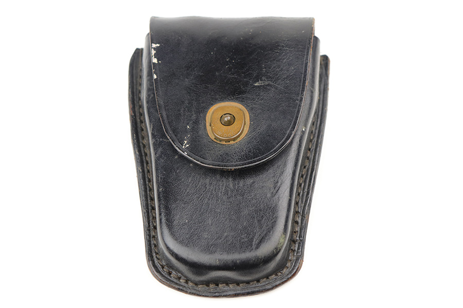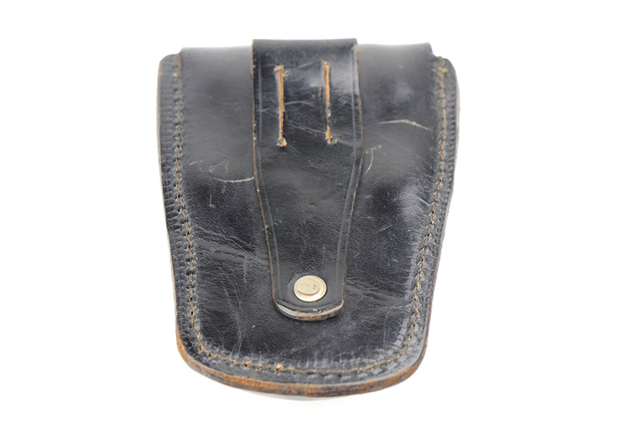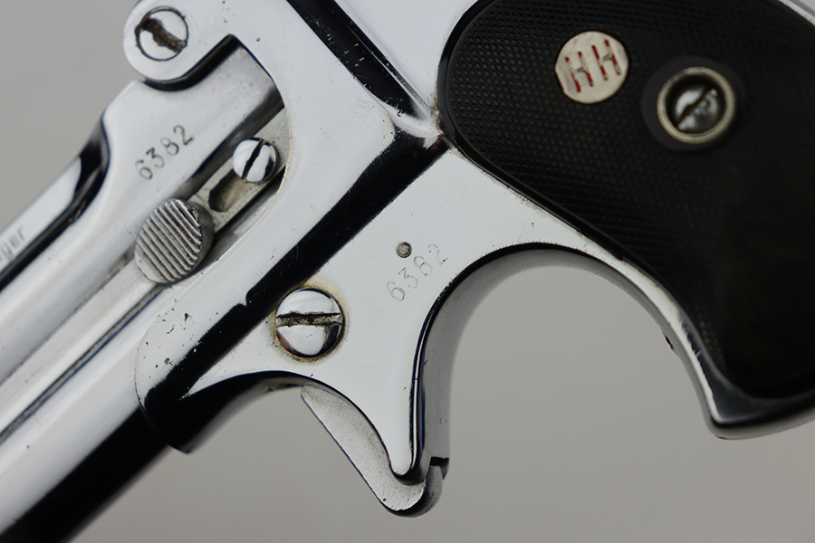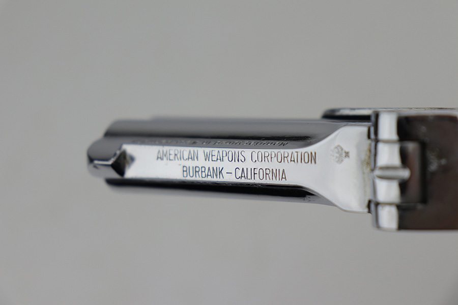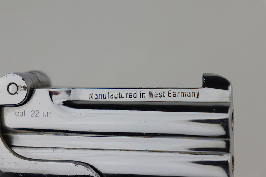 9/29/21 – This is an excellent example of a Frontier Model Derringer pistol, chambered in .22 LR and manufactured in West Germany. It is all matching and has the proper “Eagle N” West German proofs. It comes with a nice black leather holster that fits the gun well. The gun has retained about 97% of its nickel-plated finish. There are some tiny chips in the nickel here and there, most noticeable on the right side of the frame. Comes with excellent black plastic grips. The bores are excellent – shiny with strong rifling.