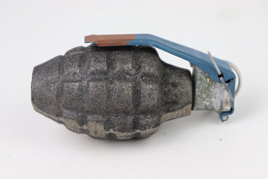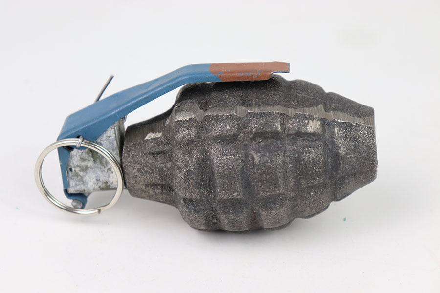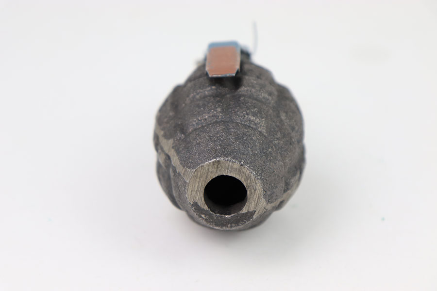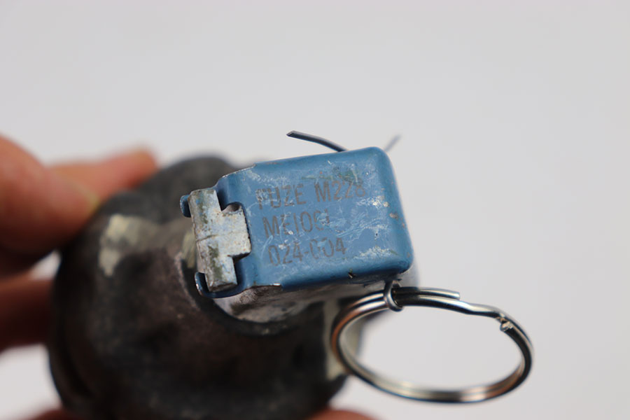 5/13/24 – Located at the Arizona office. This is a pineapple style training hand grenade with a M228 training fuse. The body is made of thick durable steel that shows some sign of use such as the scrape down the front side. Fuse comes complete with pull ring and safety lever. Inert & Non functional.