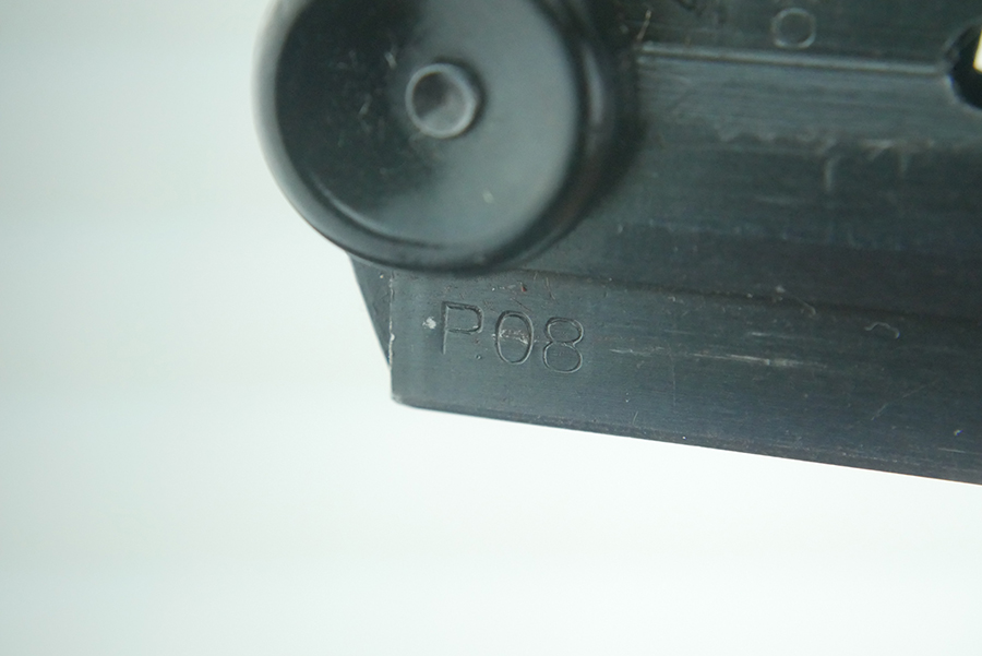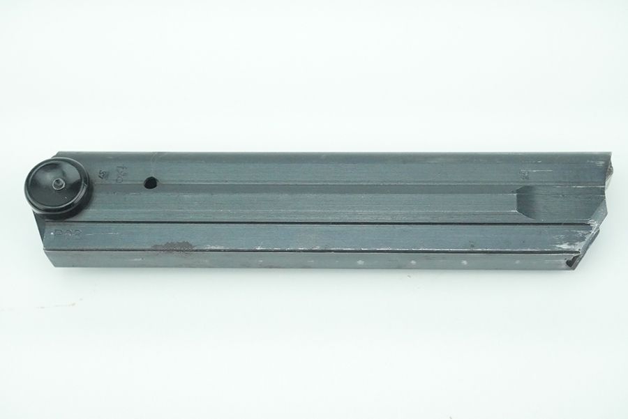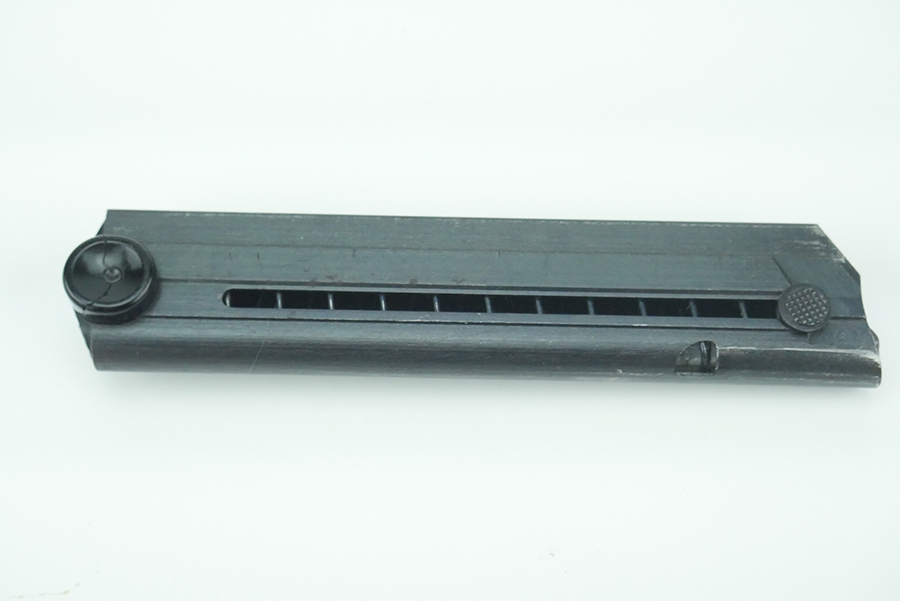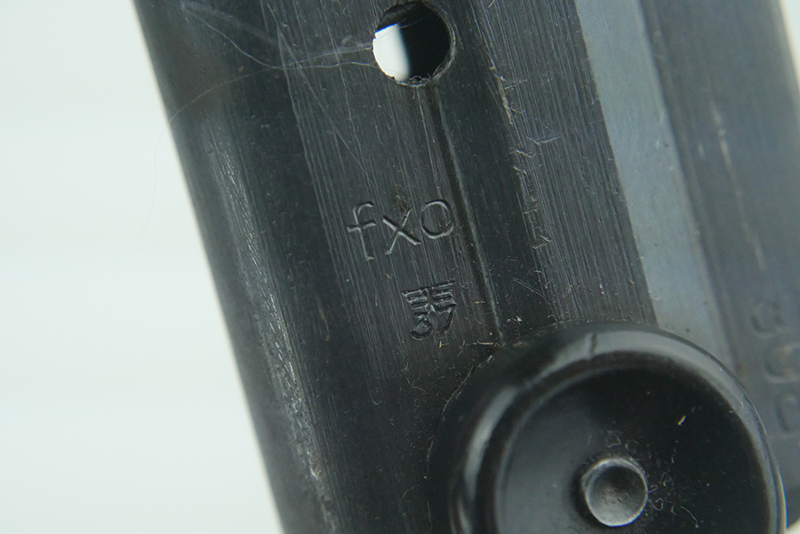 10/2/24 – This is a good example of a WW2 FXO Black Widow luger magazine. The body of this magazine maintains almost all of it’s original finish, with only minor finish loss associated with standard use. The black Bakelite base does have one crack on the right side. The body of the magazine is properly Eagle 37 stamped as well as “FXO” and “P.08”. The spring is still strong on this magazine and fully functional.