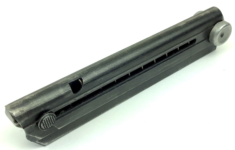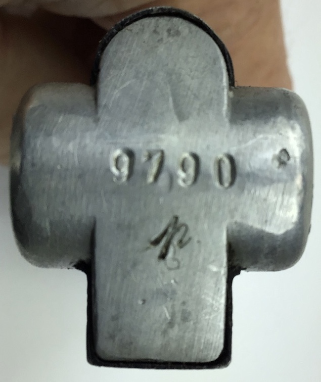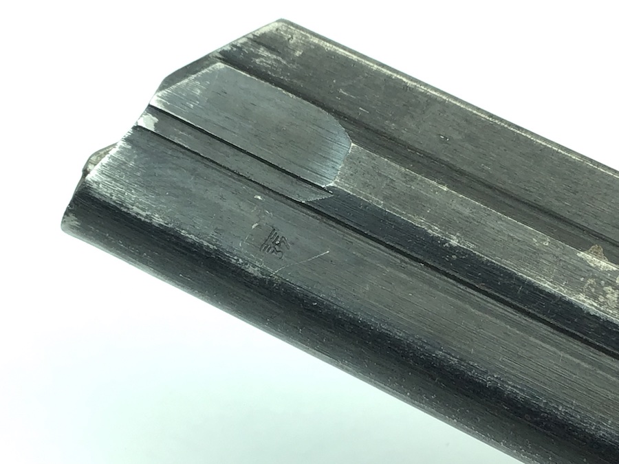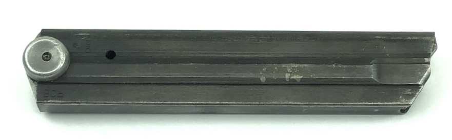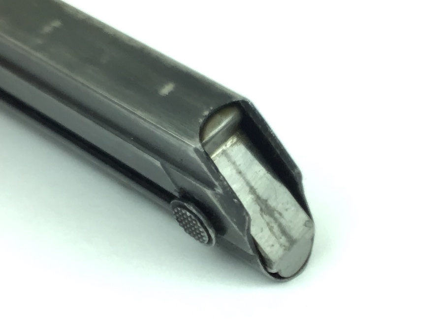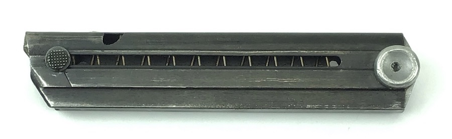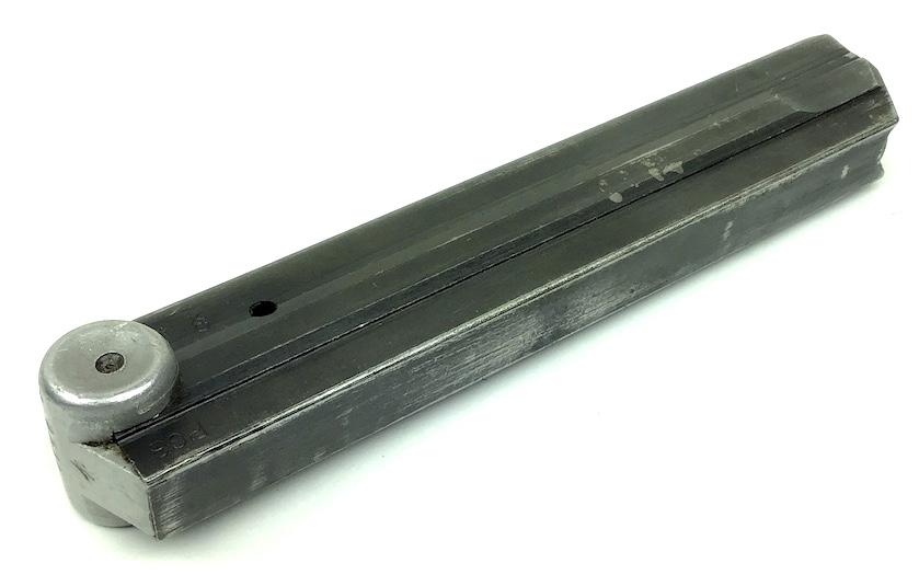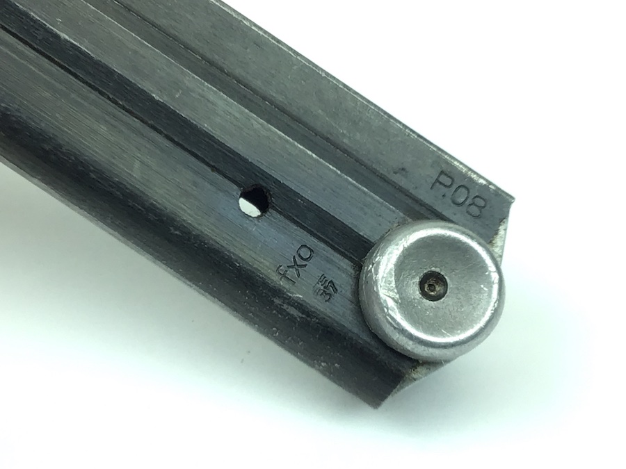 4/22/20 – This is an original “fxo” Luger magazine with two proof eagle/37 stamps on the frame, and an aluminum base. The base is stamped with with a letter ‘p’ suffix and serial number ‘9790’. The bluing has some typical wear and is in excellent condition. No rust or pitting. Strong spring. Original and fully functional magazine.