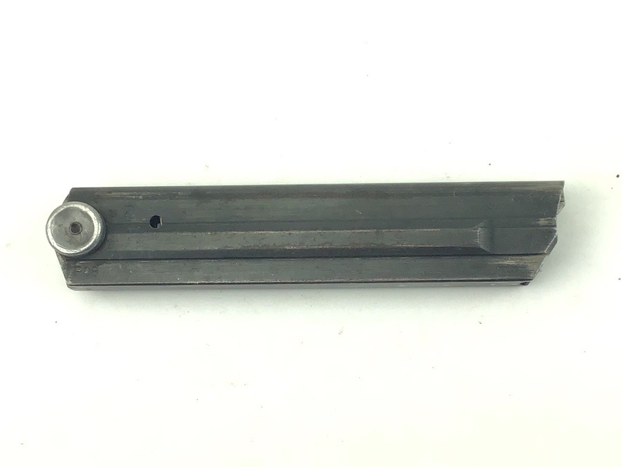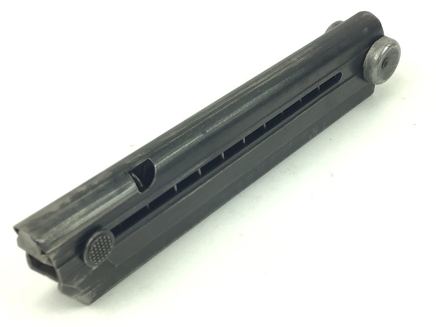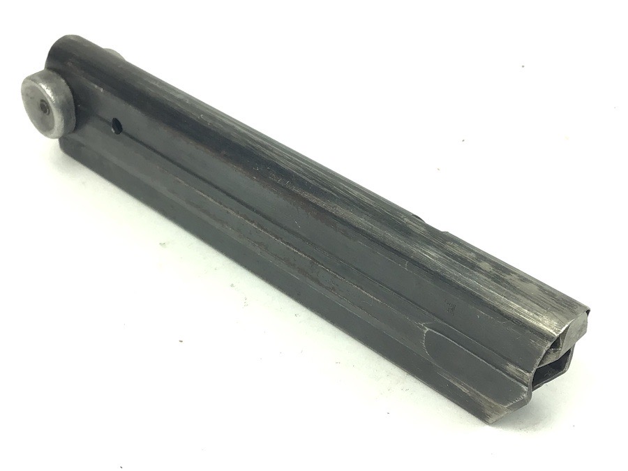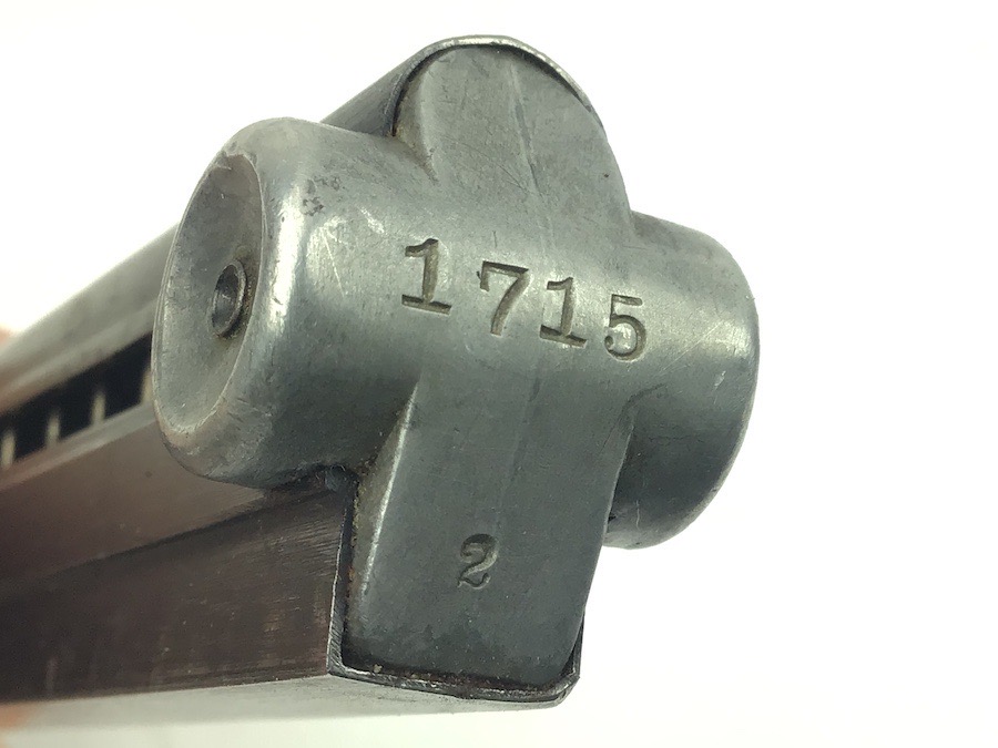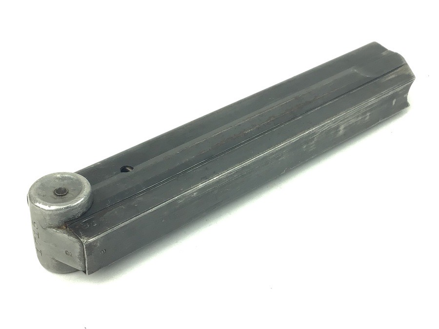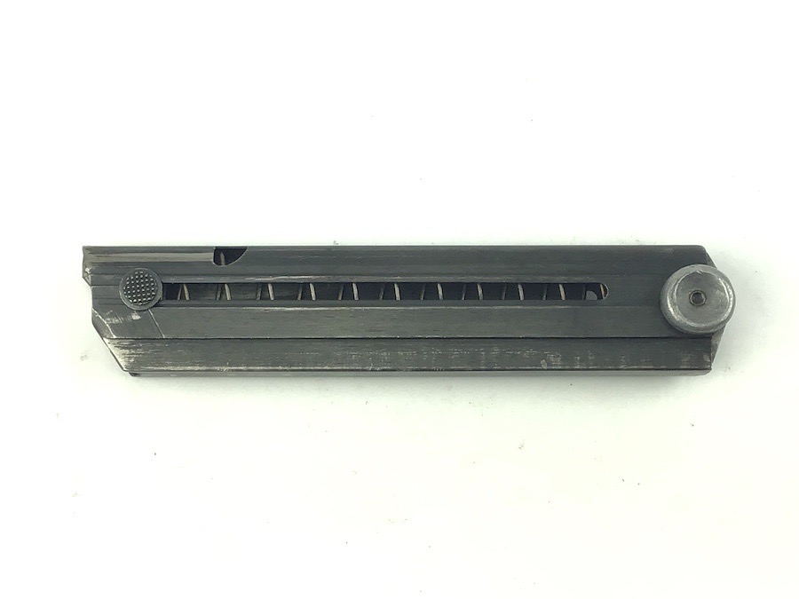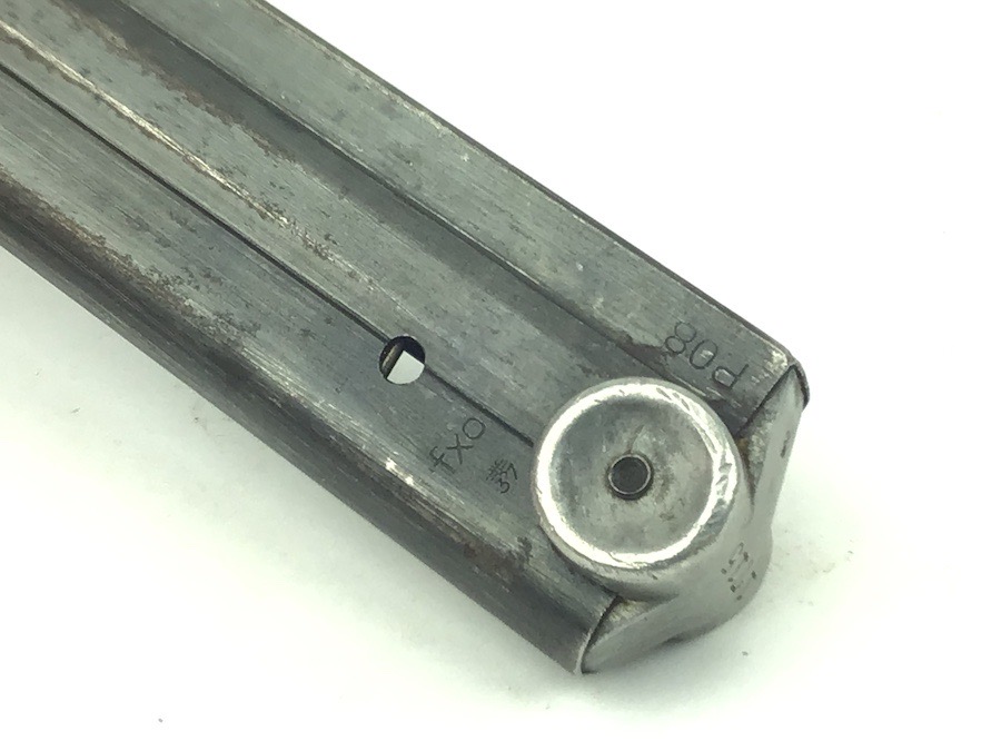 12/30/22 – This is an original “fxo” Luger magazine with two proof eagle/37 stamps on the frame, and an aluminum base. The base is stamped with with a numeral ‘2’ and serial number ‘1715’. The numbering is large font and strongly struck, and we believe is potentially a renumber (although period correct). Price reduced accordingly. The bluing has minimal wear and some mild surface corrosion. Strong spring. Original and fully functional magazine.