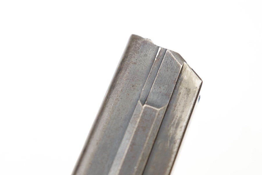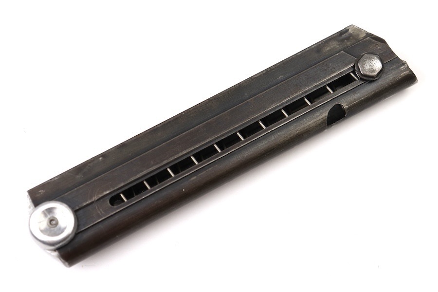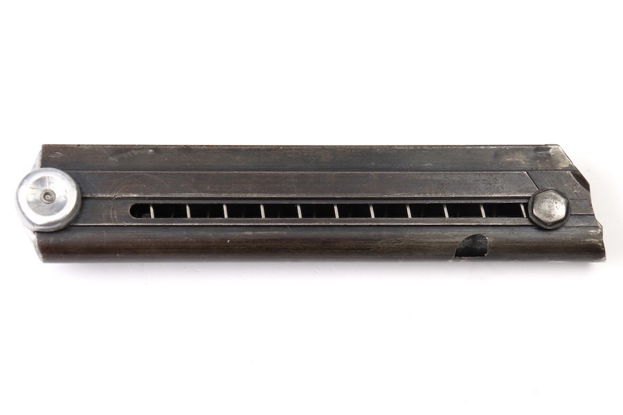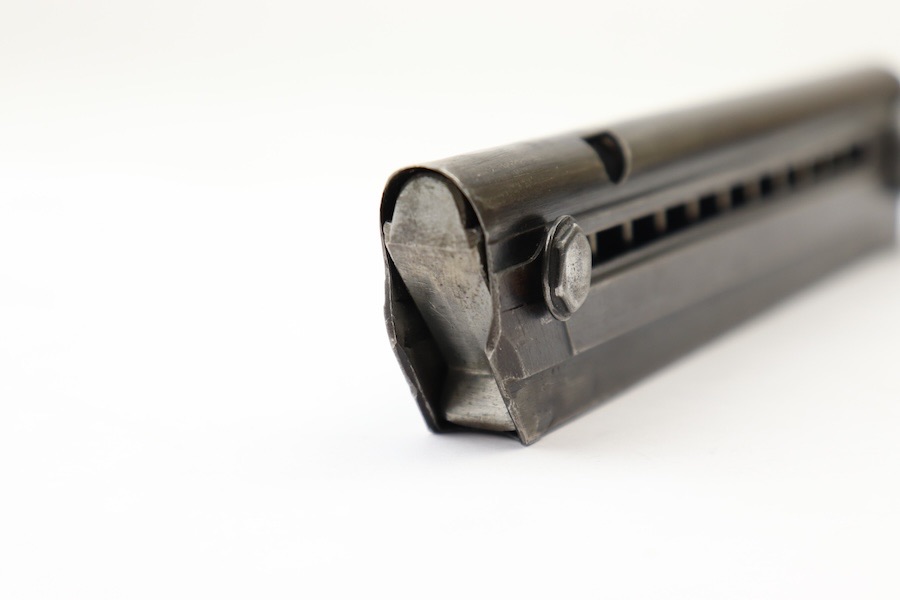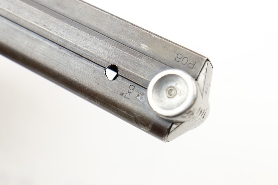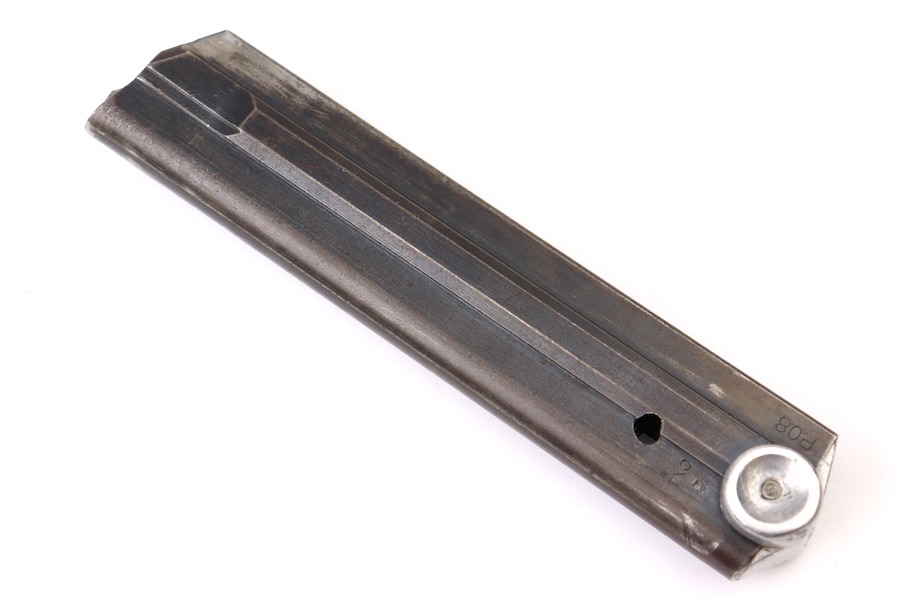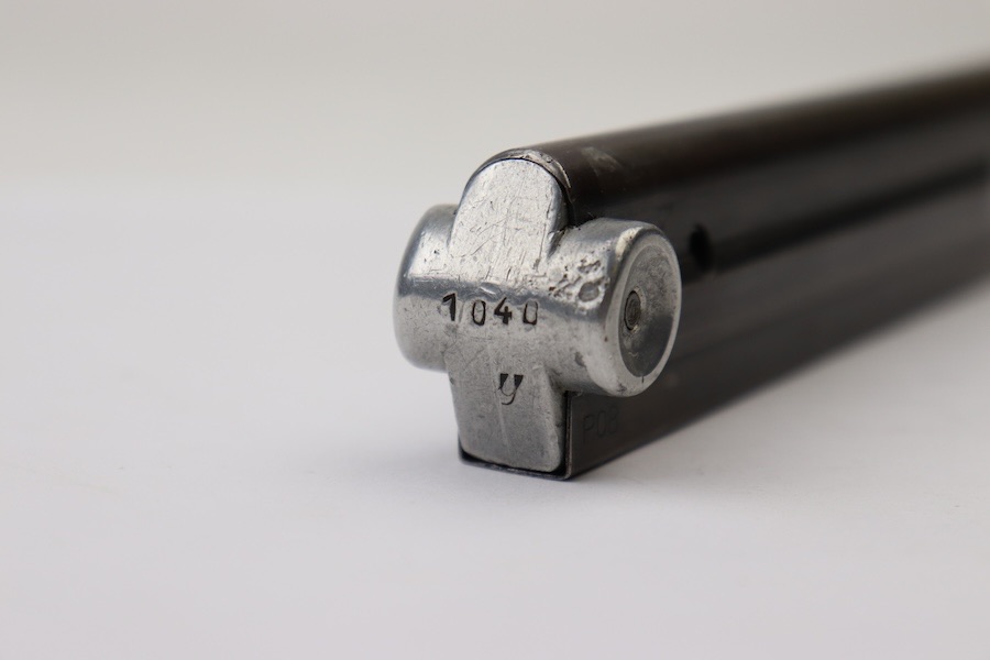 10/27/23 – This is a good condition Luger Eagle/37 FXO magazine. The tube retains 70% of its original bluing finish. The spring is powerful and smooth. The spring assist button has been replaced with some sort of bolt. The mag has an aluminum base plate with the serial number 1040 Y stamped into it. The tube is stamped Eagle 37, FXO, and P.08.