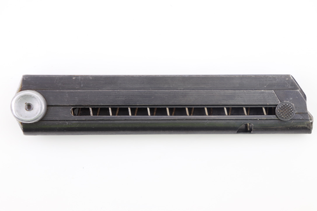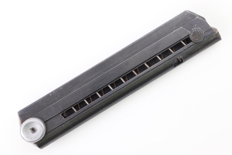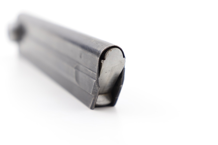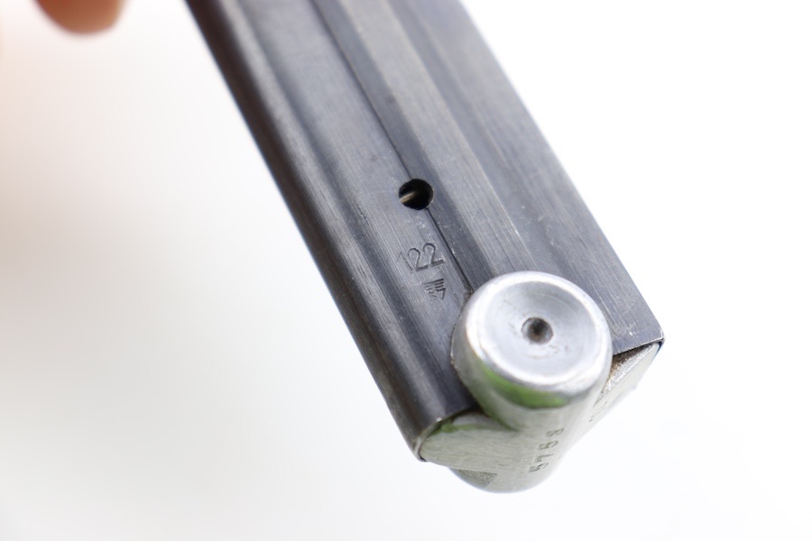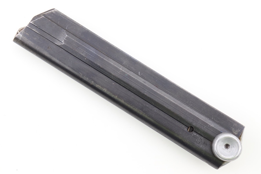 1/30/24 – This is a great condition WW2 Luger magazine. The tube retains 95% of its original bluing finish. The spring is powerful and smooth. The mag has an aluminum base plate with the serial number 5758n stamped into it. The tube is stamped with two Eagle 37 proofs and a 122 maker code. All markings are clear and legible.