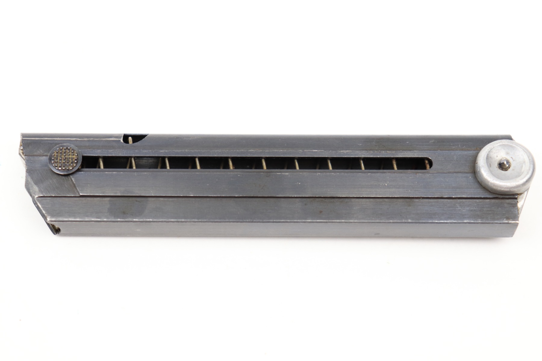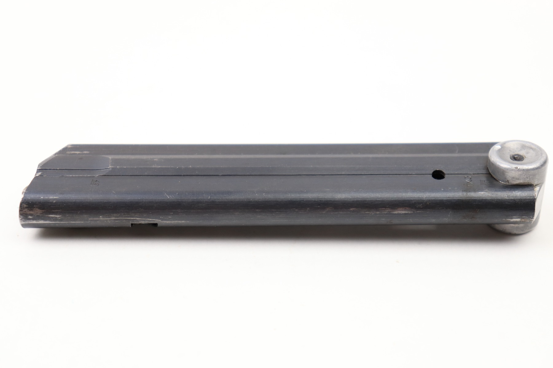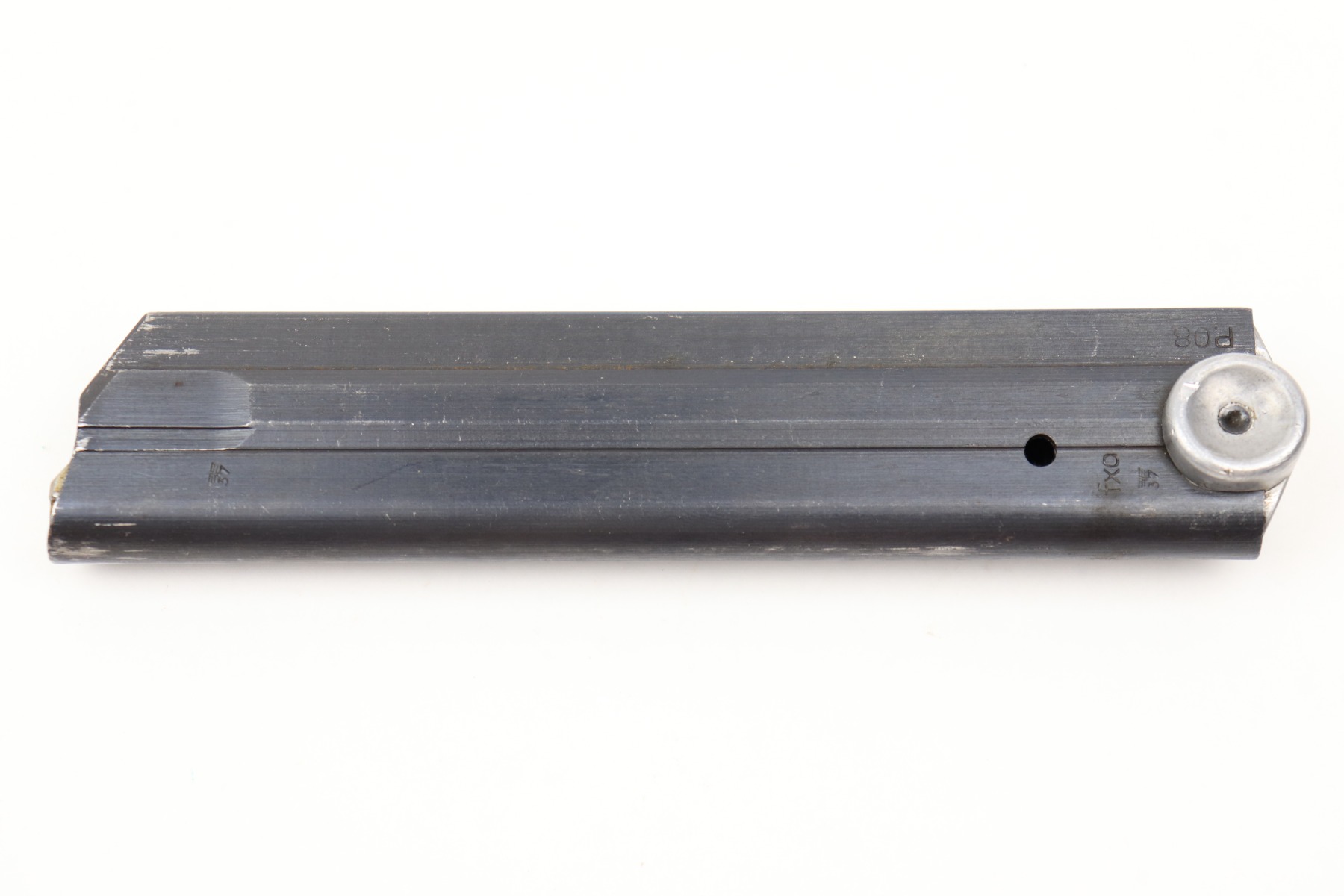 6/28/22 – This is an original WW2 production Luger magazine by Haenel. The magazine is in great condition with a blued tube and aluminum, serial numbered base. The tube has some dark spots of discoloration and surface patina, but minimal finish loss. The tube is fxo stamped with two eagle 37 proofs. The spring is strong and fully functional.