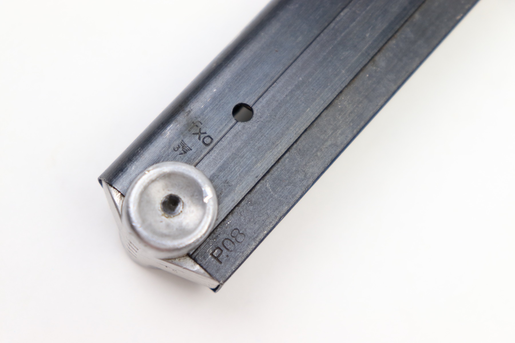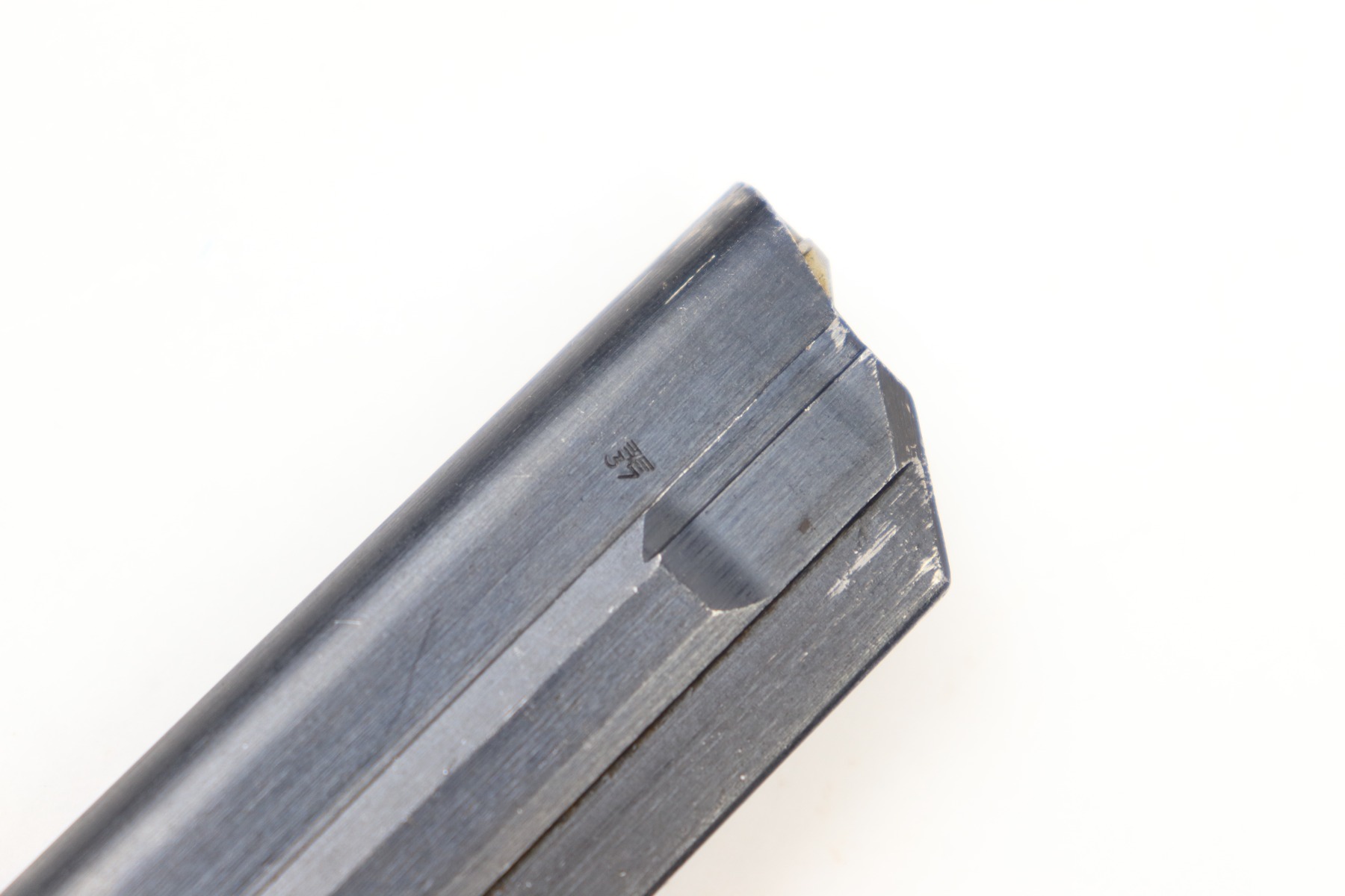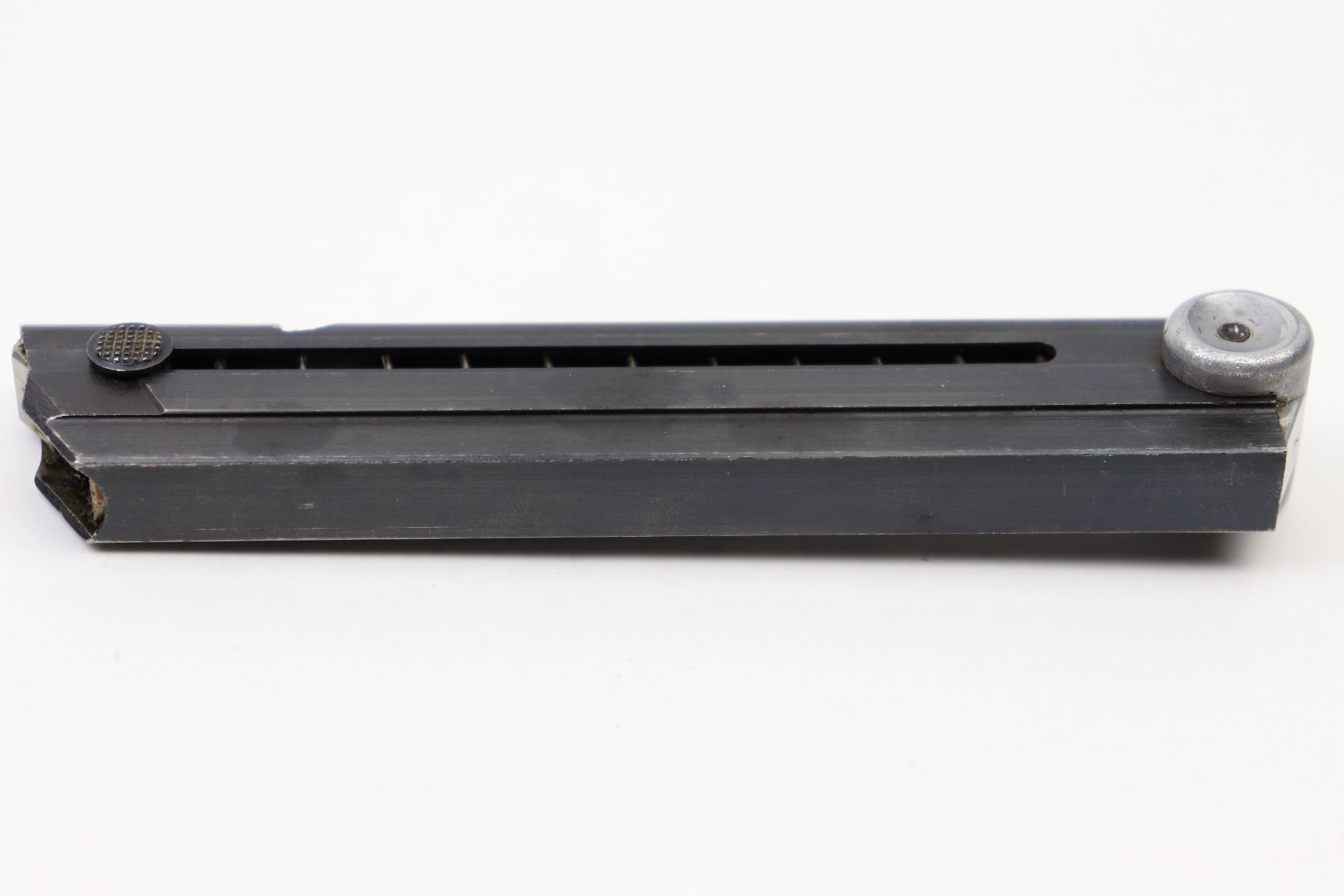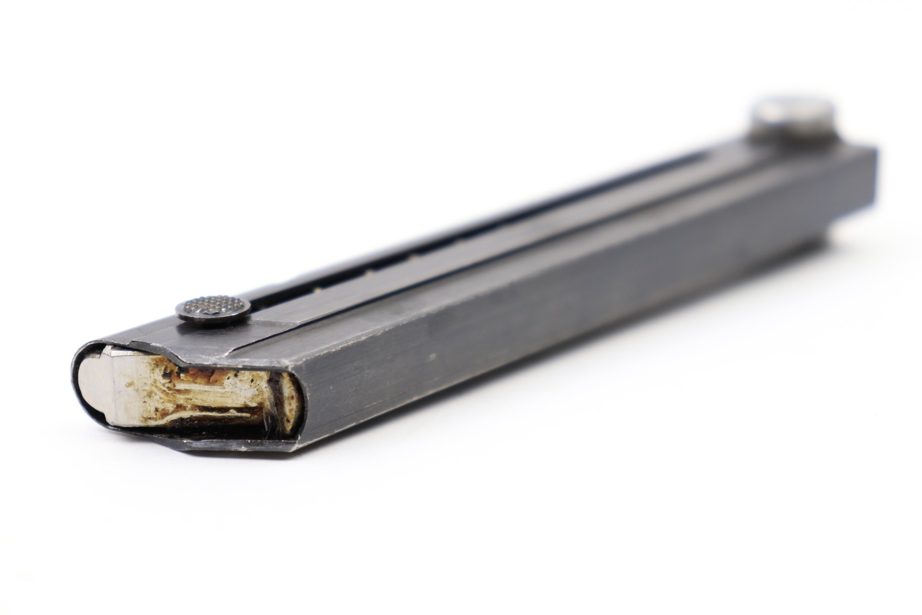 6/28/22 – This is an original WW2 production Luger magazine by Haenel. The magazine is in great condition with a blued tube and aluminum, serial numbered base. The tube has some dark spots of discoloration and surface patina, but minimal finish loss. The tube is fxo stamped with two eagle 37 proofs. The spring is strong and fully functional.