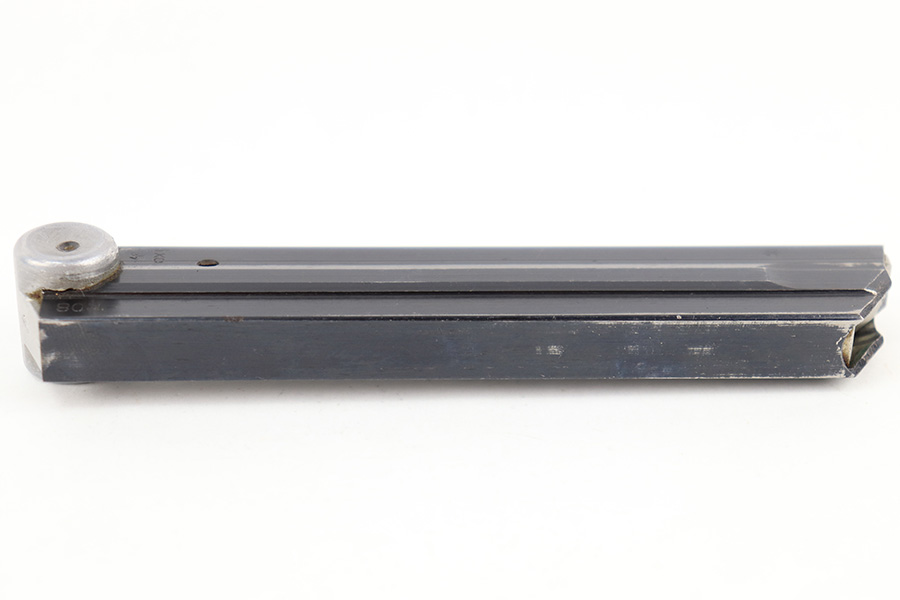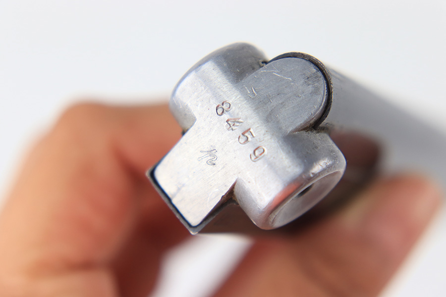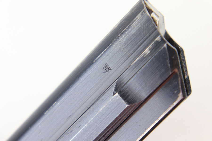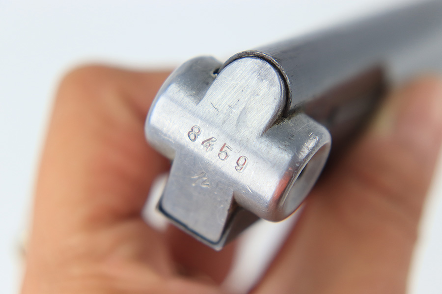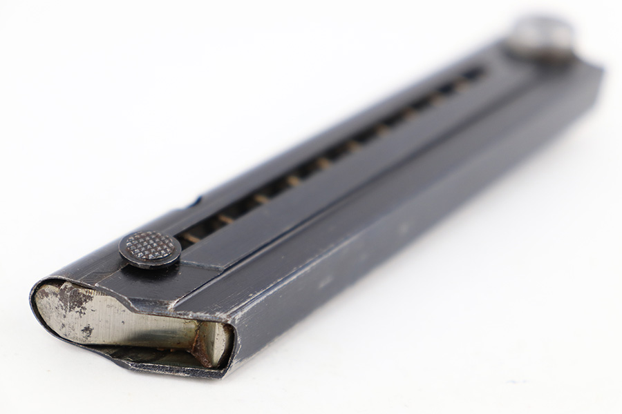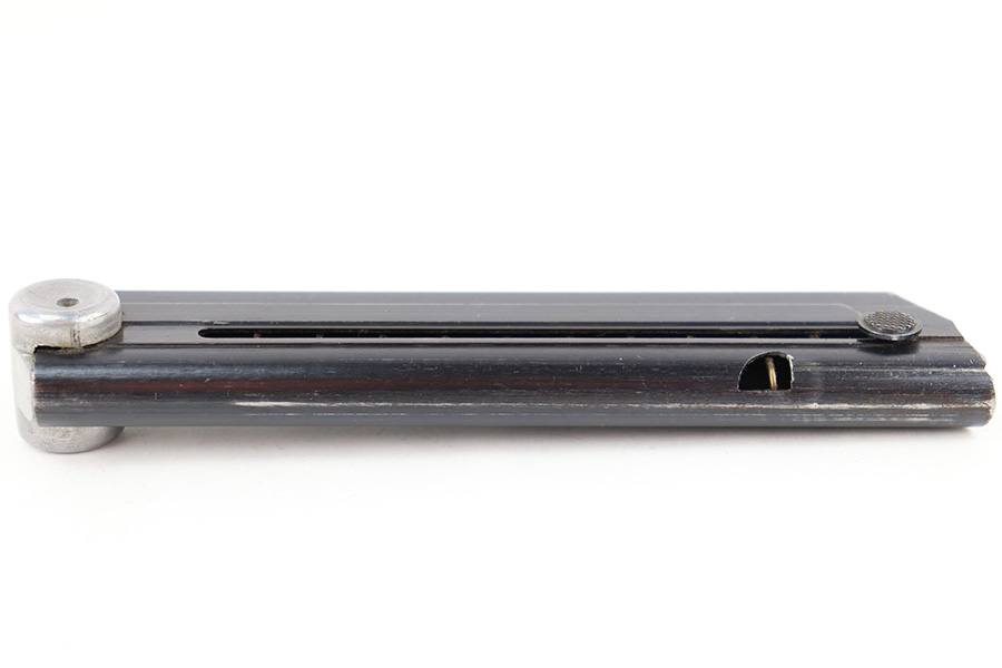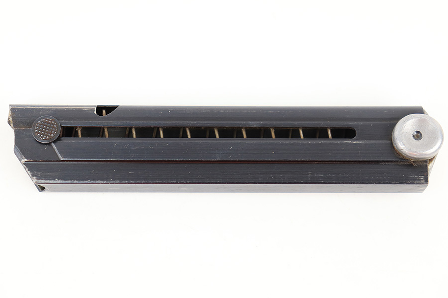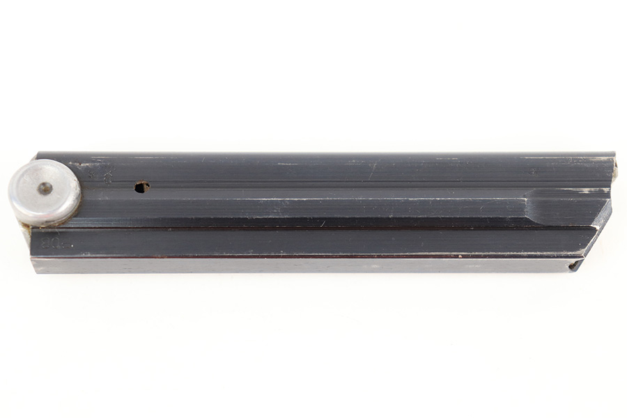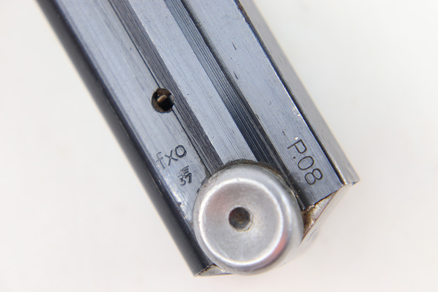 7/26/23 – This is an excellent condition “FXO” numbered luger magazine from WW2. The magazine tube is “fxo” and “P.08” stamped with two eagle/37 military proof stamps. The aluminum base is serial numbered 8459r with no other markings. The spring is strong and fully functional.