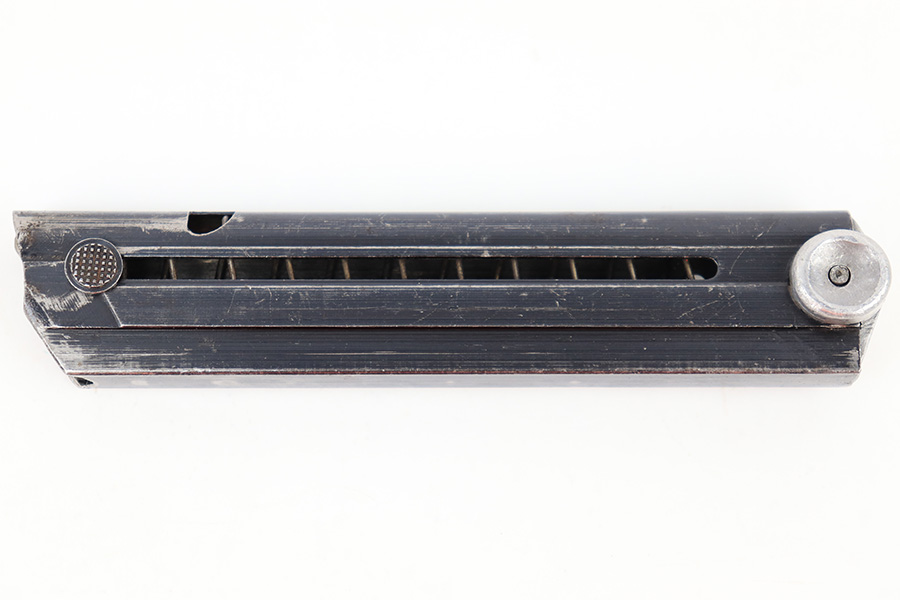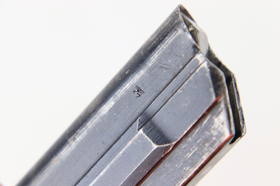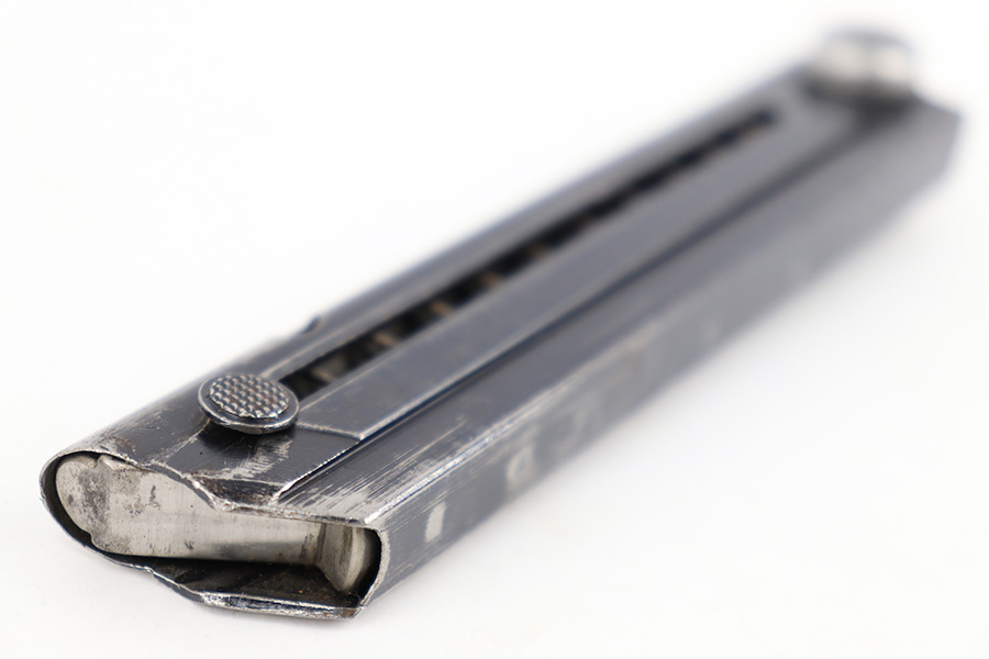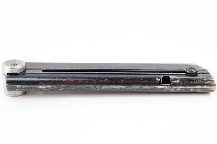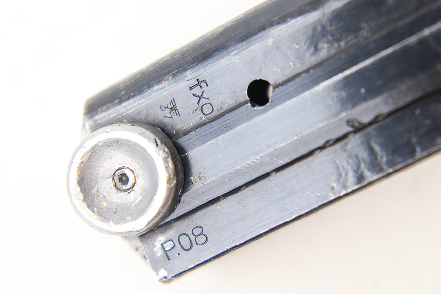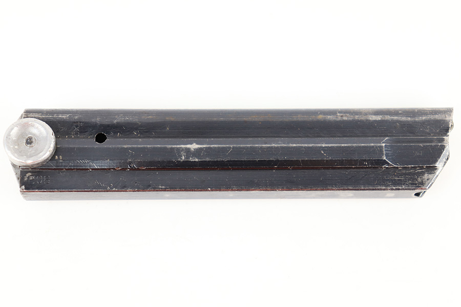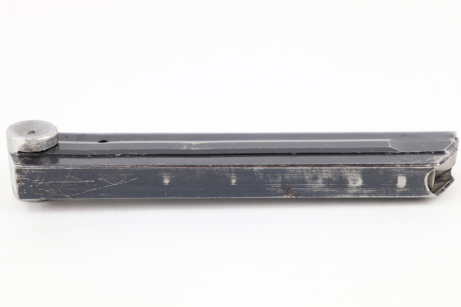 7/26/23 – This is an original WW2 production FXO Luger magazine with a numbered base. The magazine tube is blued and in great condition despite some edge wear, mild finish loss, and a few small areas of patina. The tube is stamped with two eagle 37 proof stamps, an “fxo” stamp, and a “P.08” stamp. The base is numbered 2277b. Strong, functional spring.