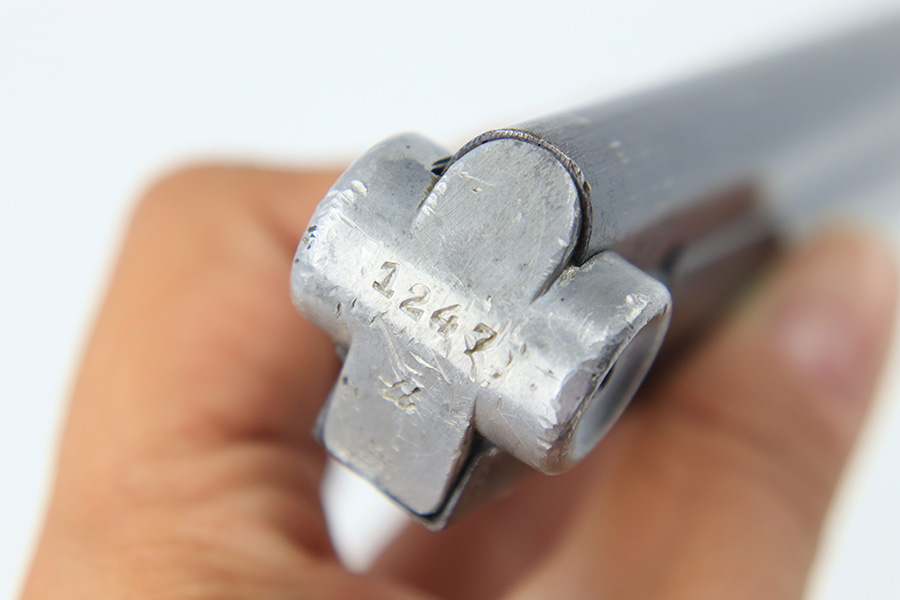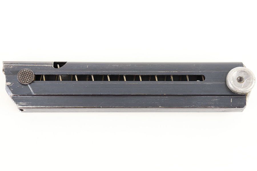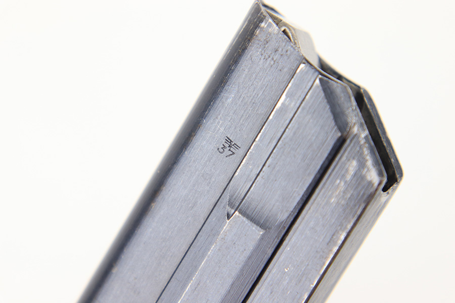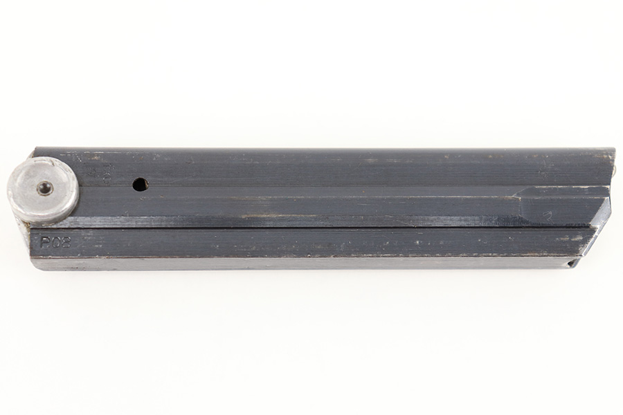 8/17/23 – This is an original WW2 production Luger magazine by Haenel. The magazine tube is blued and the base is aluminum. The tube is in excellent condition with minimal finish loss. Stamped “fxo” and “P.08” on the left side, along with two eagle/37 military proofs. The base is numbered “1247u” and has a few small dings and blemishes, but no major issues. Fully functional spring.