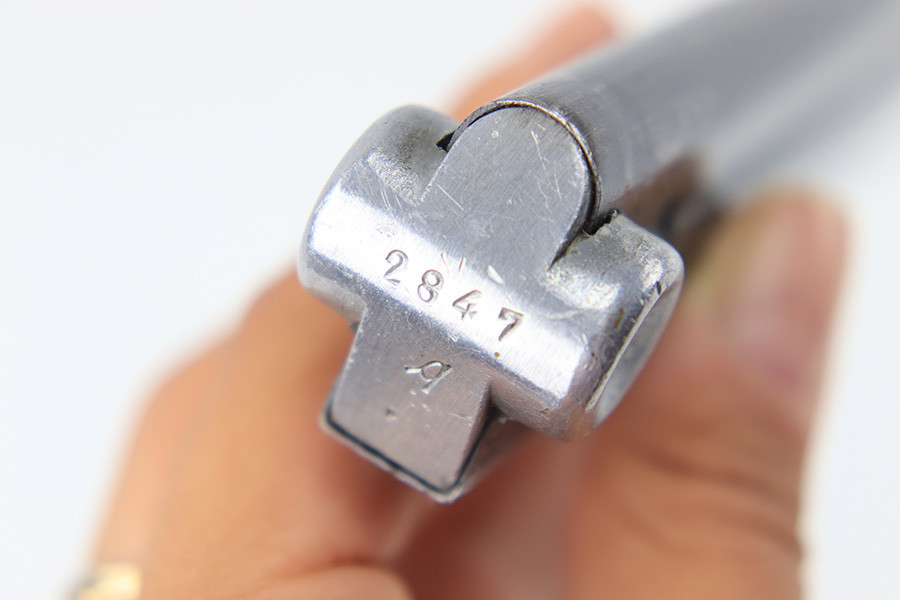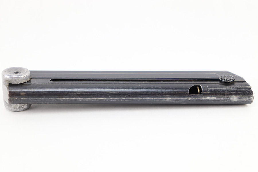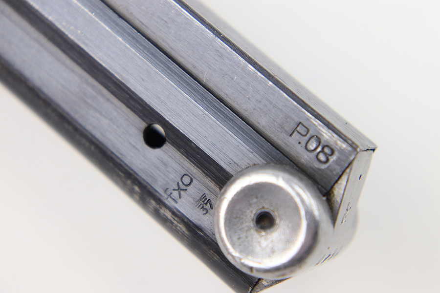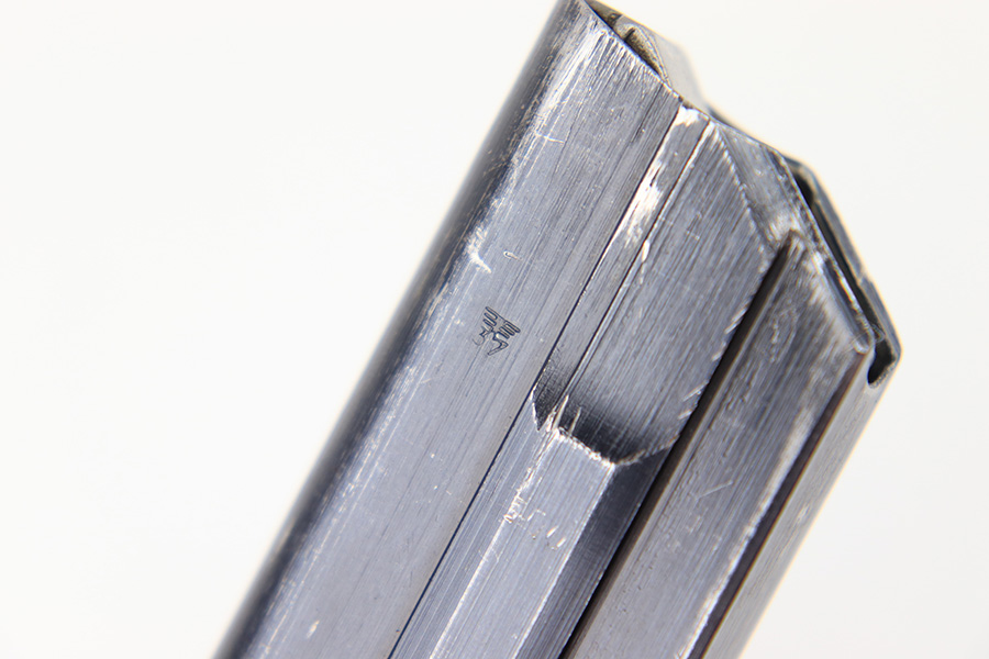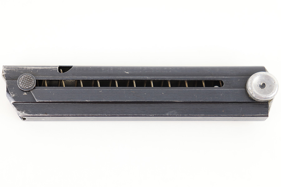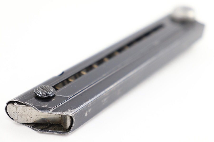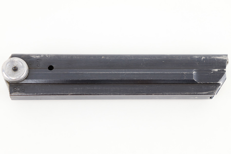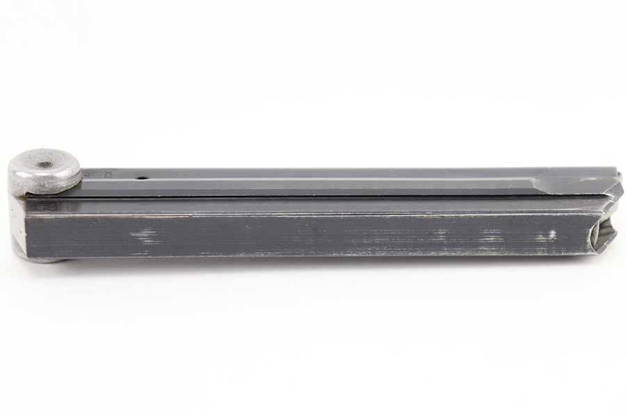 8/18/23 – This is a near-excellent condition Luger magazine from WW2. The magazine has a blued tube that’s stamped “fxo” and “P.08” with two eagle/37 proof stamps. Mild finish loss but no rust or pitting. The aluminum base is serial numbered 2847q with no other markings. Strong, functional spring.