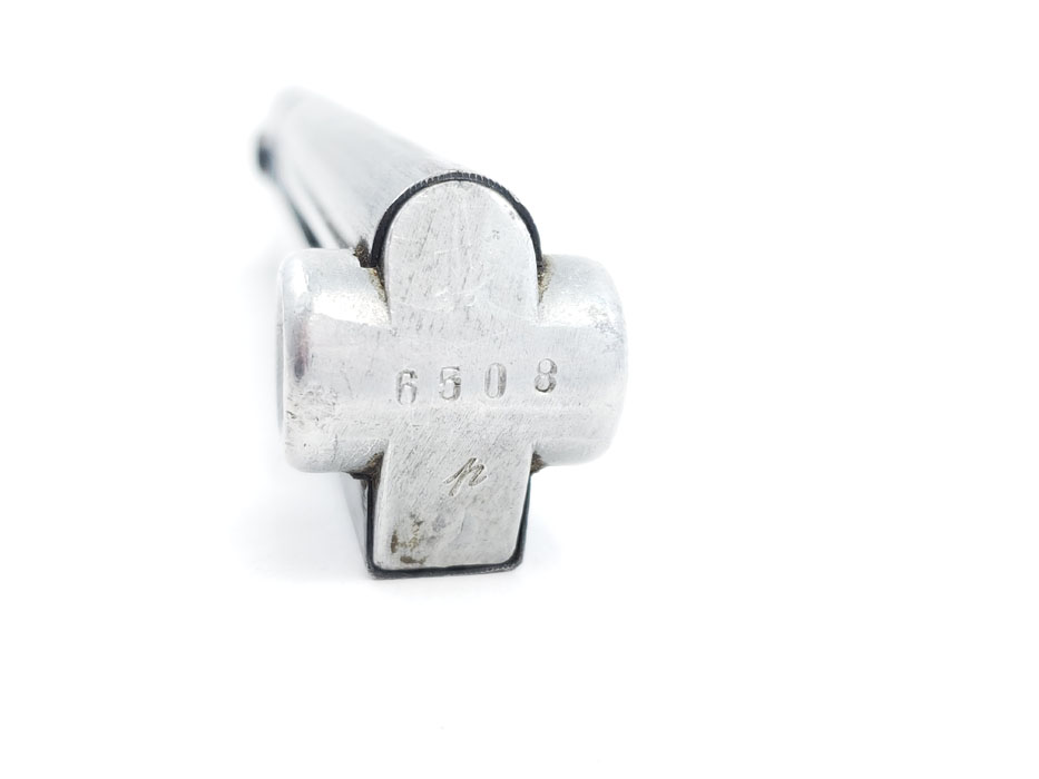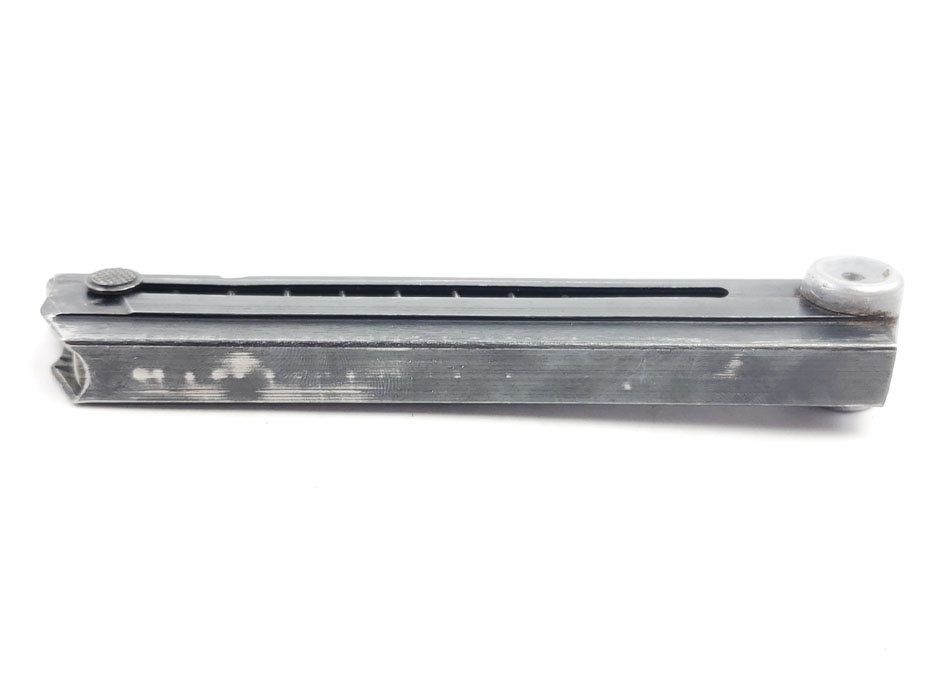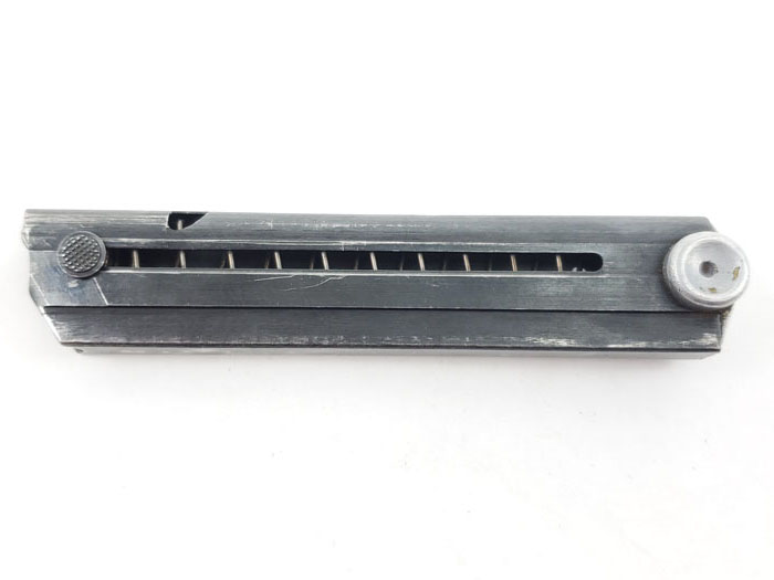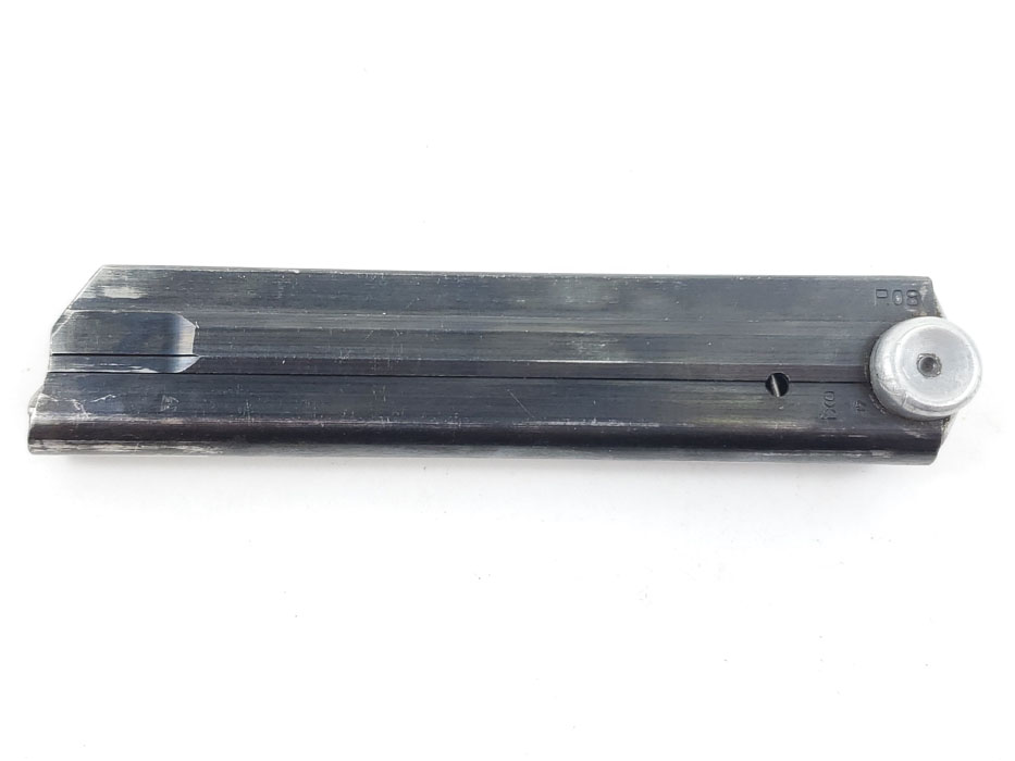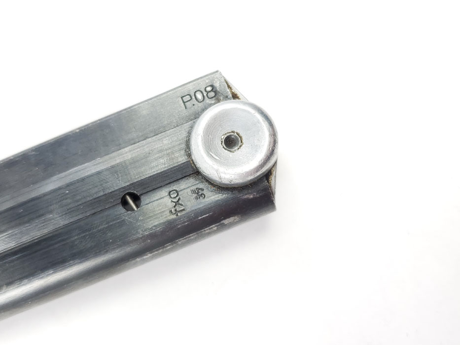 4/3/20 – This is an original WW2 production luger magazine. The magazine is eagle/37 proof stamped and “FXO” stamped on the left side of the tube. The base is aluminum and serial numbered “6508r”. The spring is strong and functional, and there is minimal bluing loss on the tube.