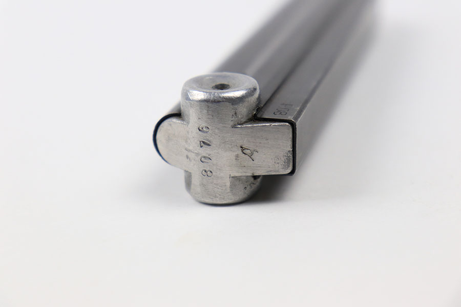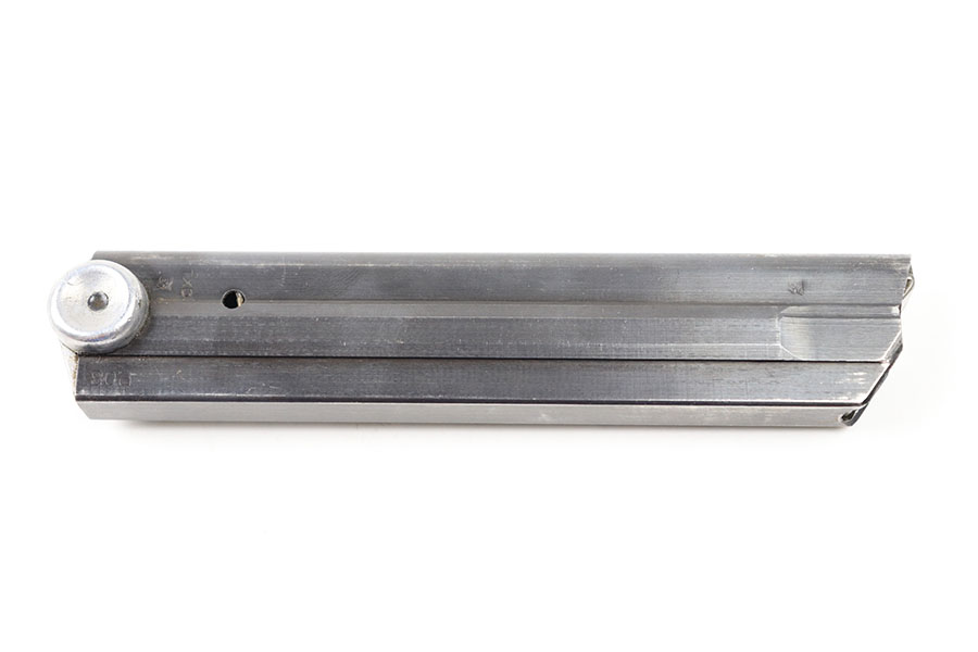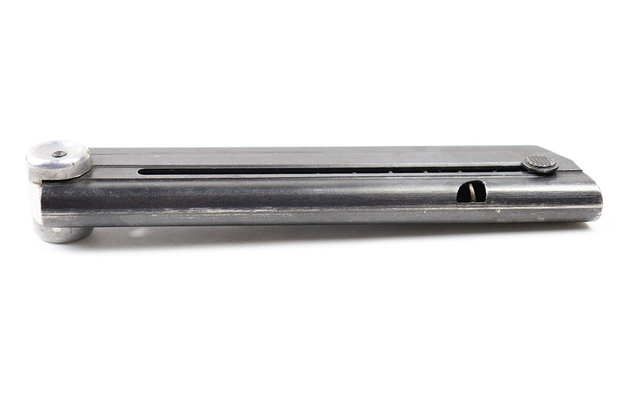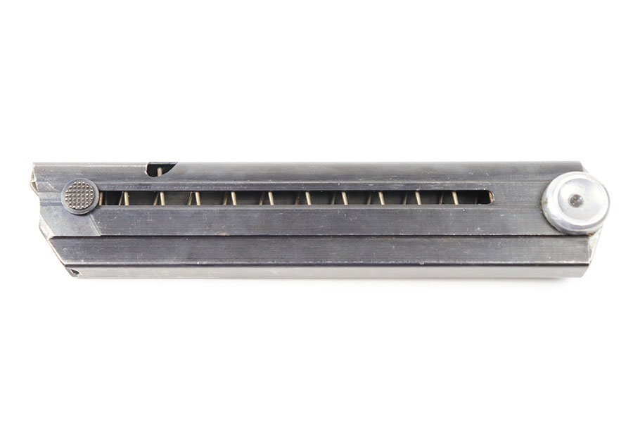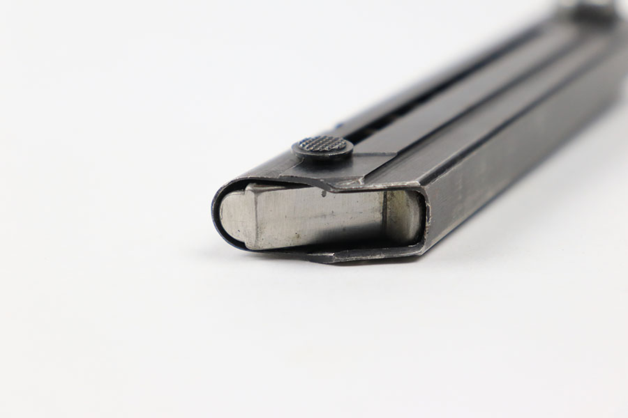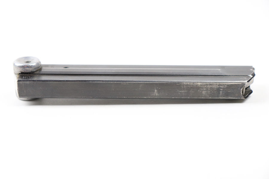 7/14/21 – This is a Haenel made luger magazine from WW2. The magazine tube is “fxo” code stamped and has two eagle 37 proof stamps. The blued finish is excellent with only minor finish loss. The aluminum base is serial numbered. Strong, functional spring.