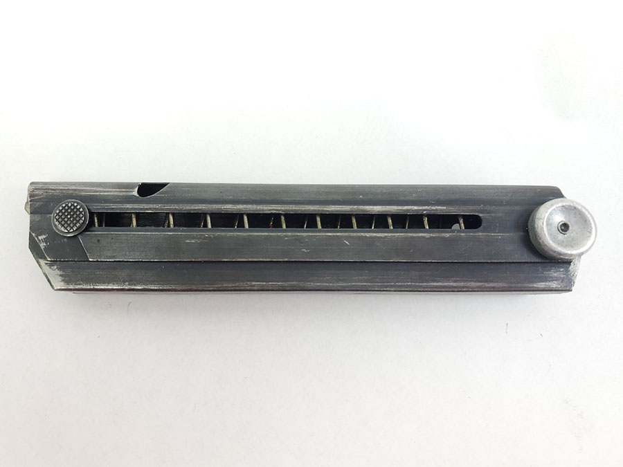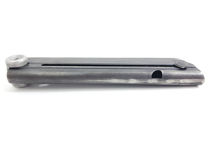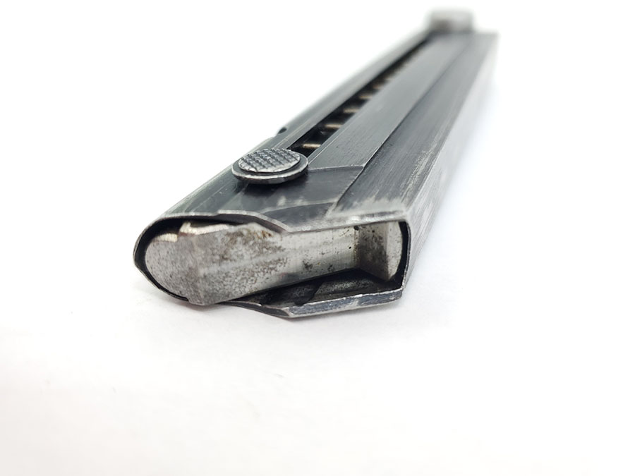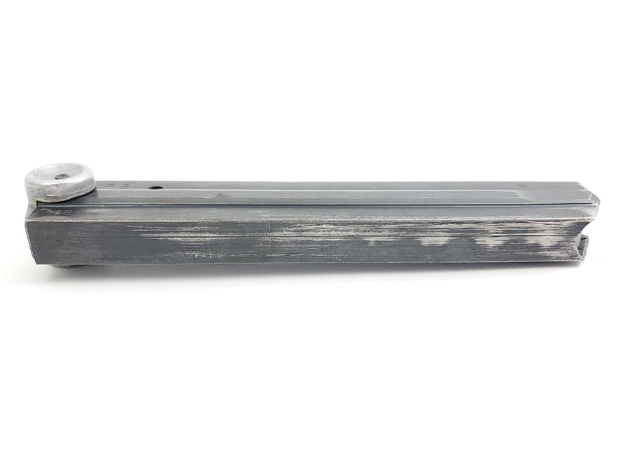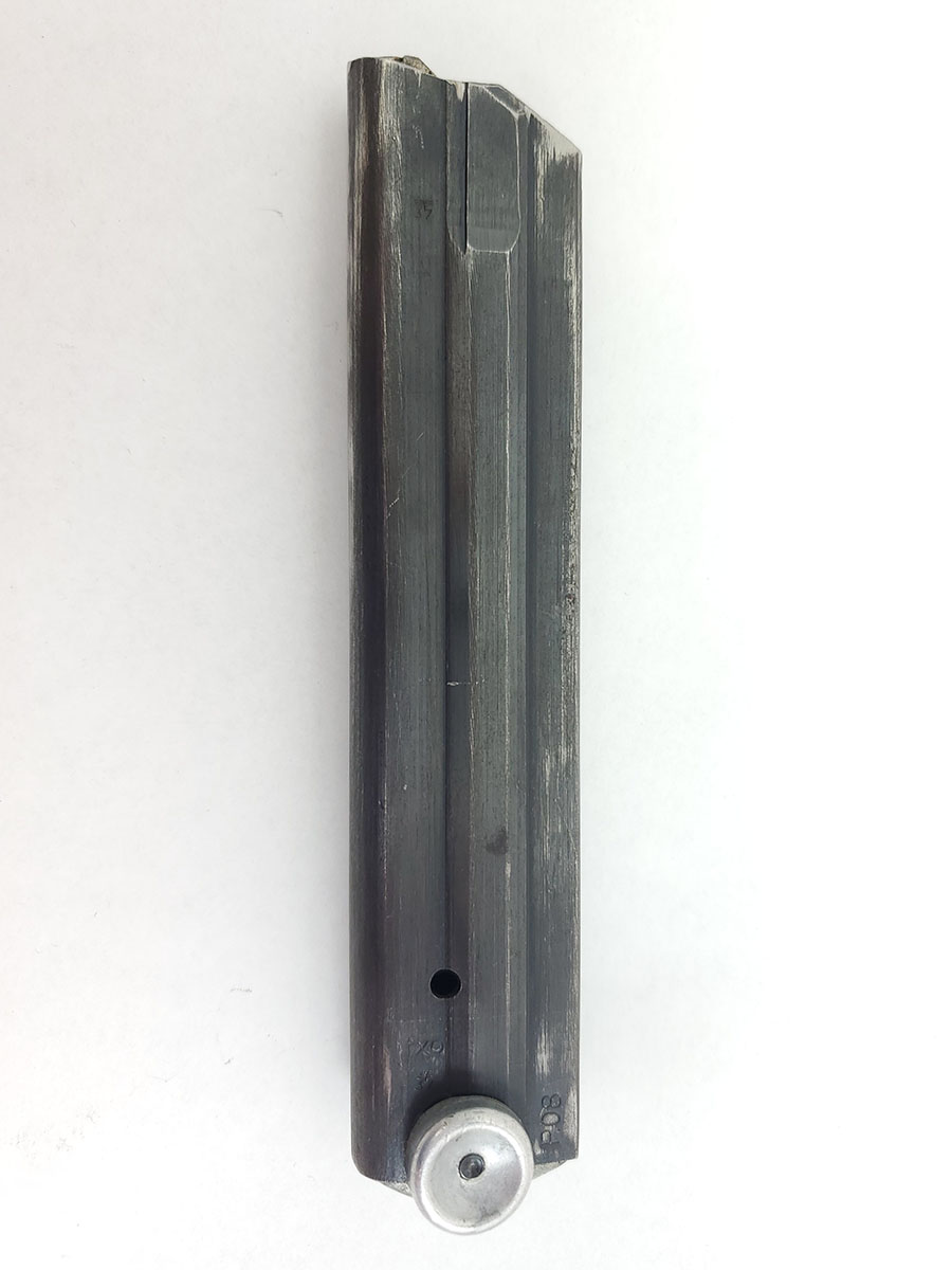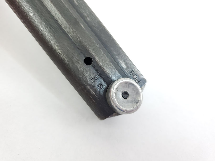 10/13/20 – This is an original FXO luger magazine with an aluminum, blank base. The base shows no signs of ever having a serial number or proof stamp. The frame is stamped FXO, P.08, and has two eagle/37 proof stamps. Made by Haenel. Fully functional and original.
