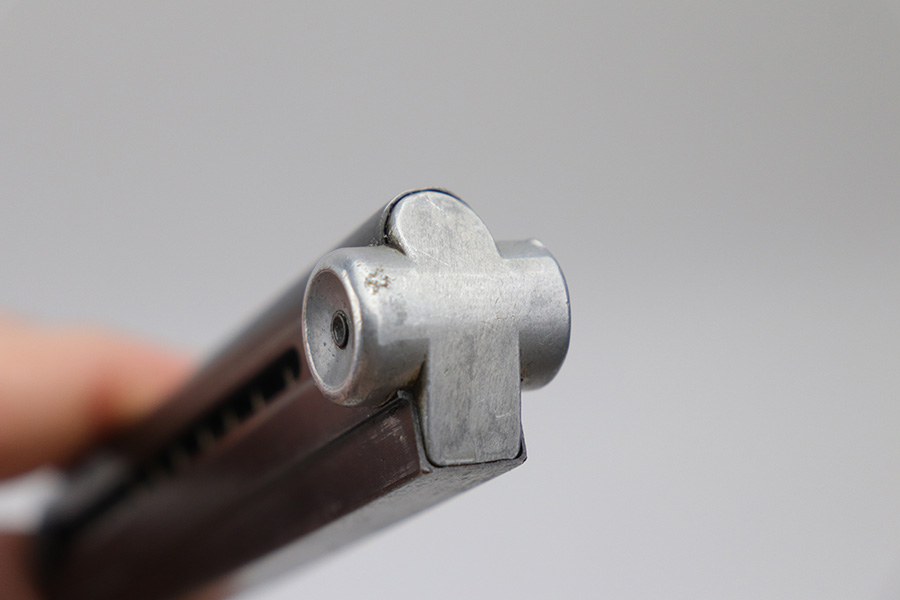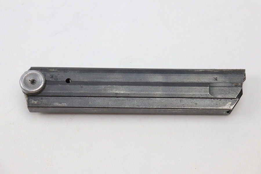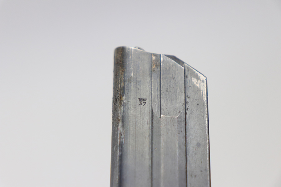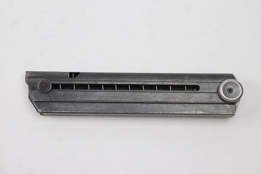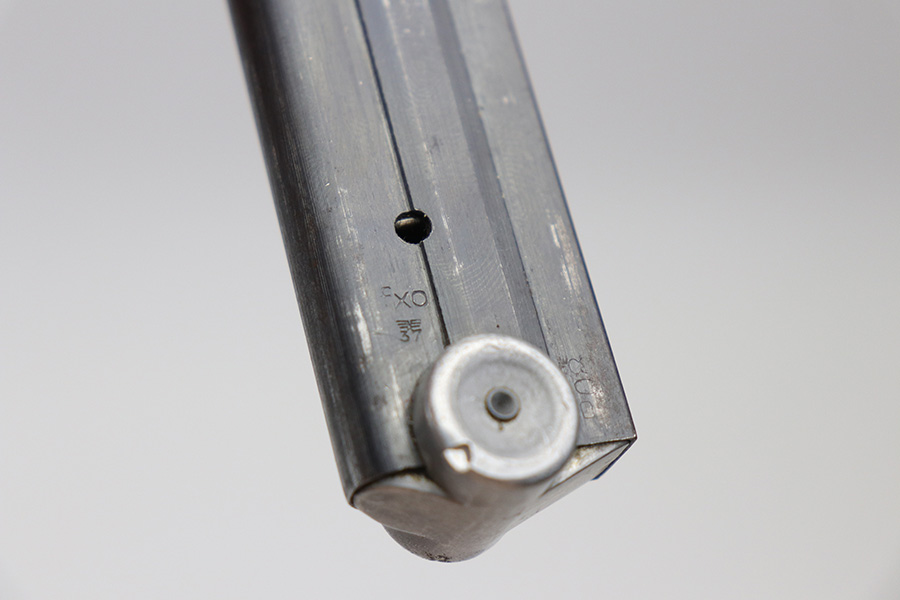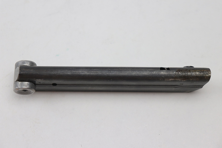 11/5/21 – This is a desirable FXO Luger magazine with a blank aluminum base. The base shows no signs of alteration, and has no markings or stamps. This makes the magazine desirable as it is matching to any gun. The base has one small chip in the left “ear” but this is minor. The tube is blued and in great condition with no rust or pitting. FXO stamped with two eagle 37 proofs. The spring is strong and fully functional.