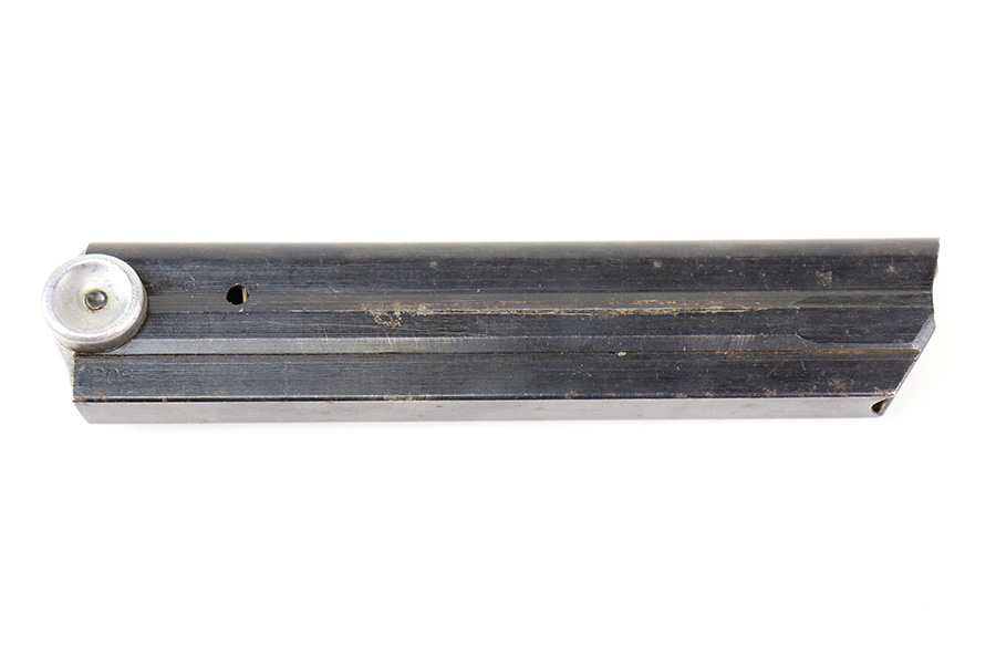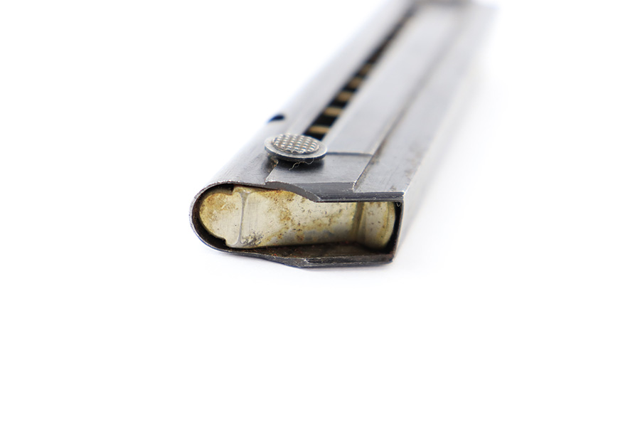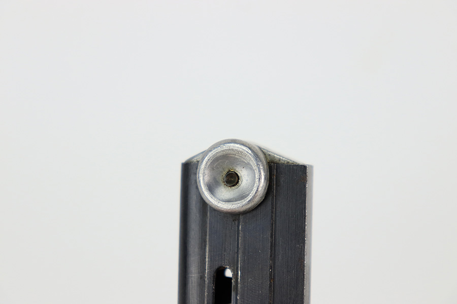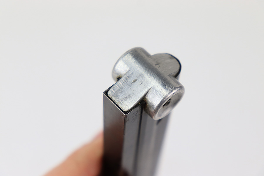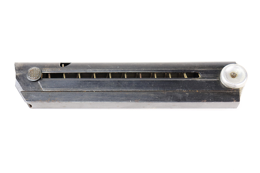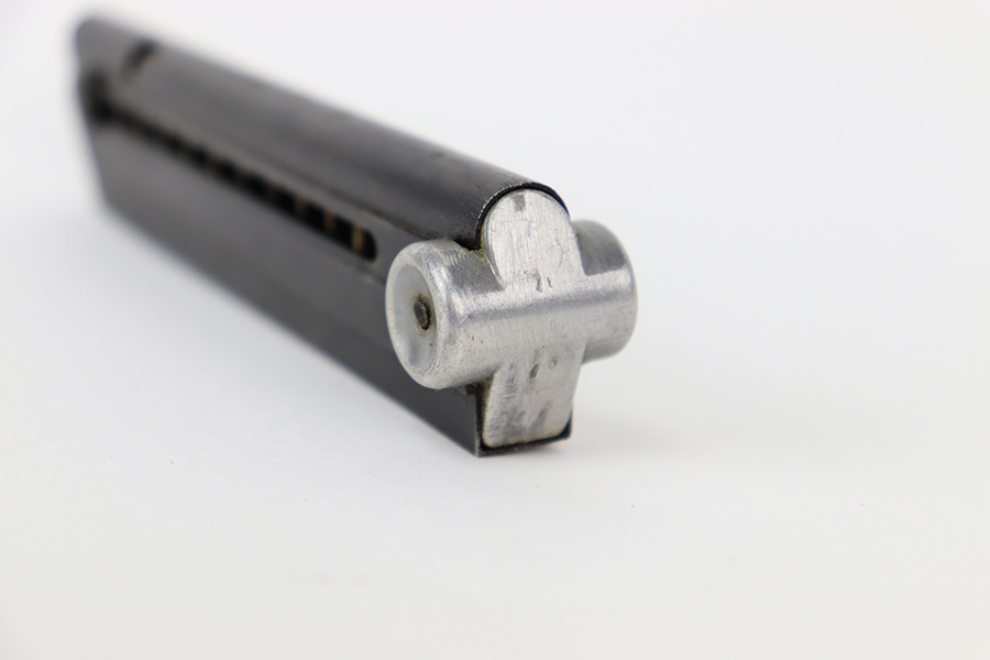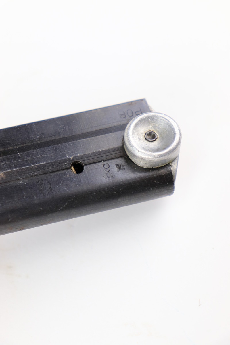 3/23/22 – This is an original WW2 production Luger magazine. The magazine has a blued tube that is “fxo” and P.08 stamped along with two eagle 37 proofs. The tube has some mild surface wear but most of the finish is intact. The aluminum base is in great condition and has no markings. However, we see evidence that the base was previously ground down and polished. Price reduced accordingly. The spring is fully functional.