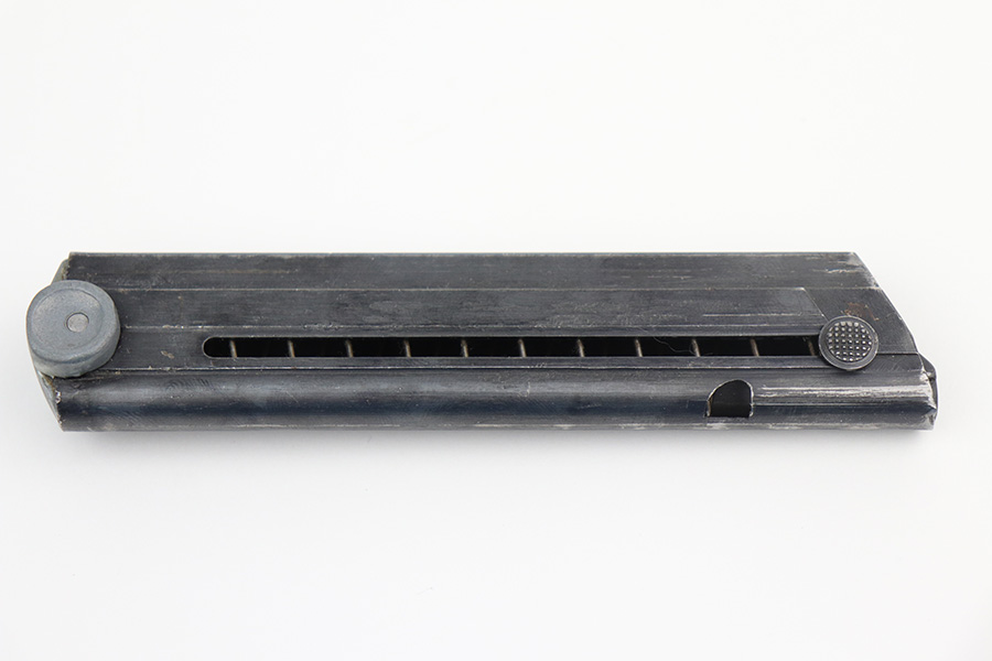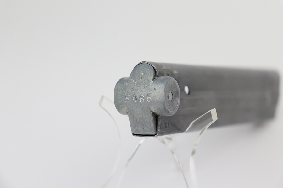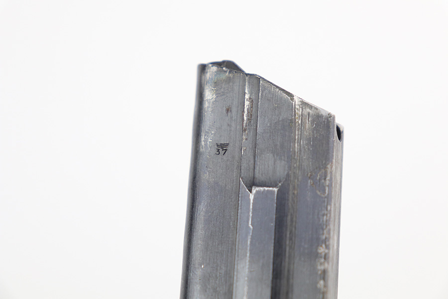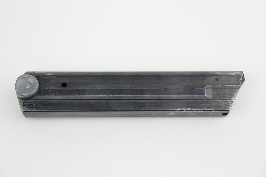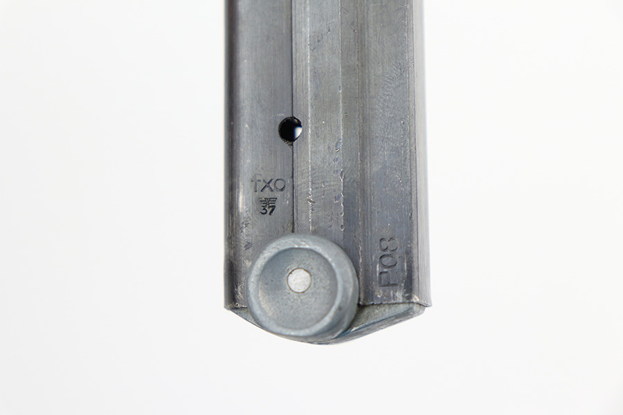 9/23/21 – This P.08 magazine was manufactured by Haenel during WW2. The tube features “fxo” maker mark, two eagle 37 proofs, and a “p.08” marking. The right side of the tube has minor pitting or what is possible minor casting flaw. The majority of the tube’s finish is retained. The magazine bottom is police number, serial number “5465”.