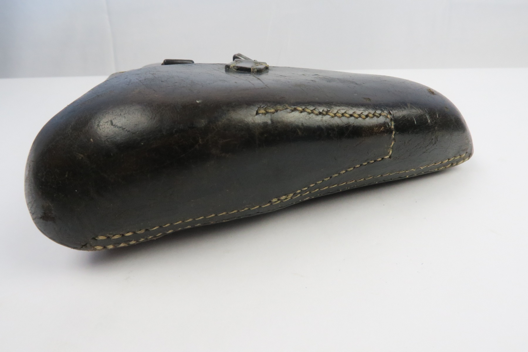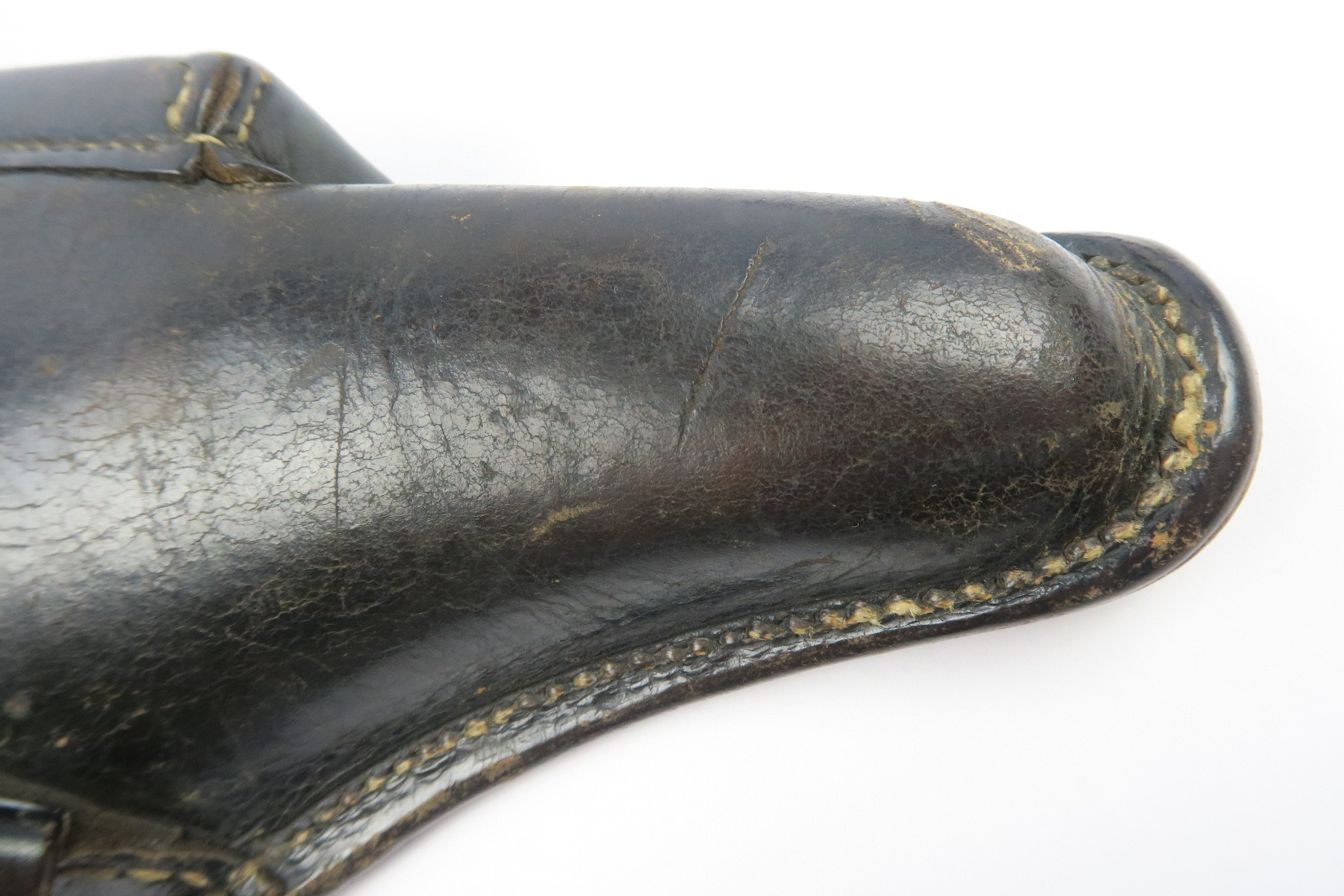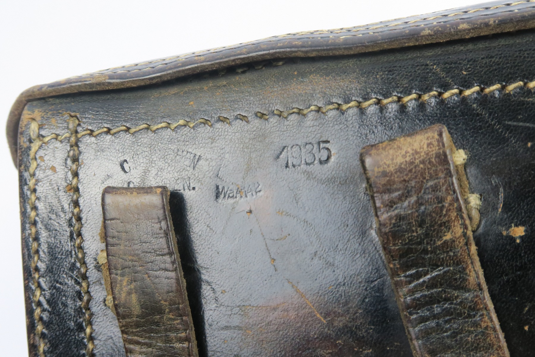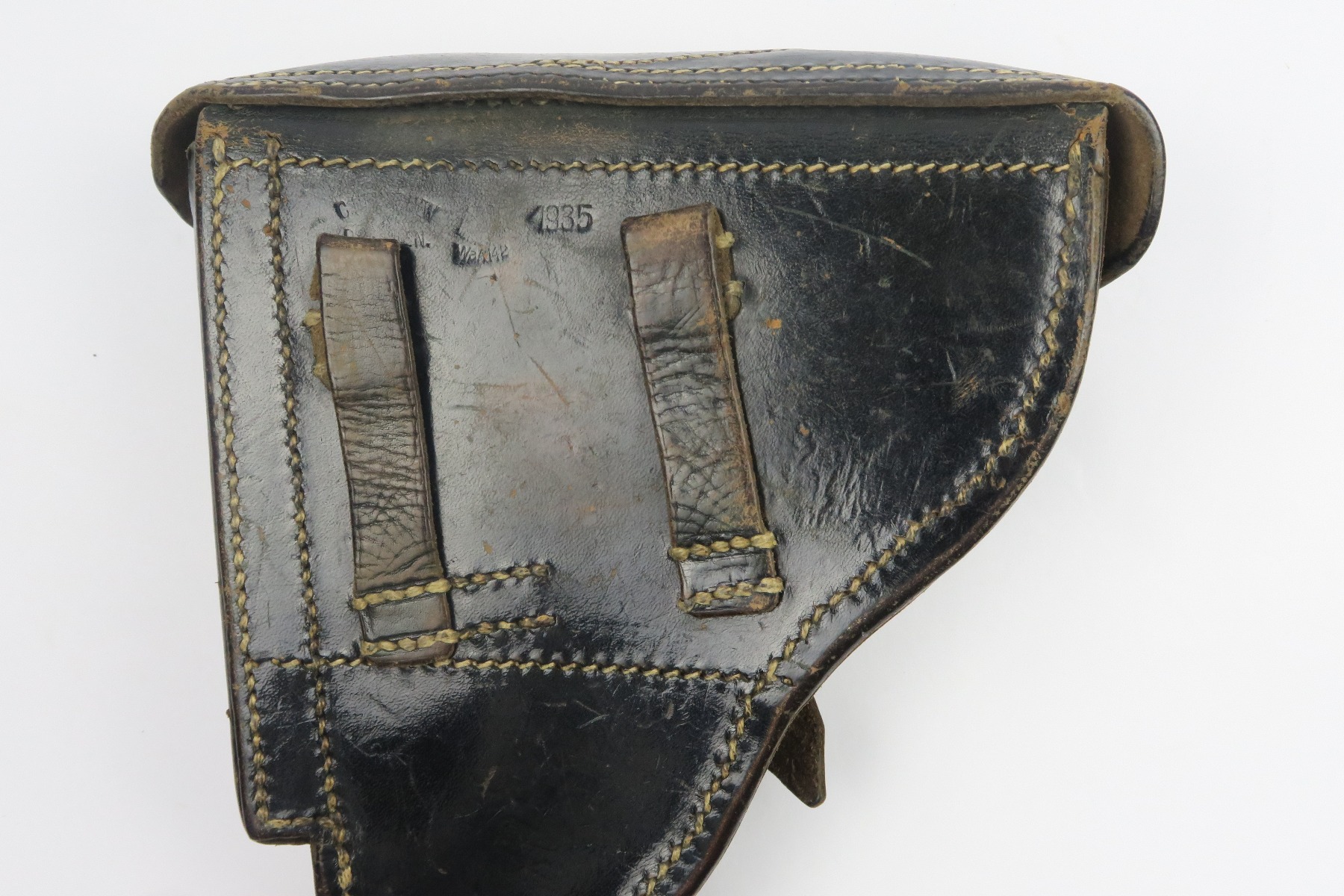 12/26/17 – This is an original 1935 dated Luger holster. Also known as the “G Date” Luger holster, and the most scarce of all WW2 era Luger holsters. The reasons why are unclear, but most tend to think there was an excess made in 1934, so not many were made in 1935 (or at least survived to today). The back of the holster is waffen WaA142 proofed, with a 1935 date and a maker stamp from Dresden Germany. The leather is in good shape but there is a light rip in the back left belt loop (near stitching, still completely attached). The front leather also has some light surface wrinkling and scuffing. The stitching is in tact and all original. The interior leather is fairly clean. Overall a very nice all original 1935 Luger holster. These don’t come in much nicer condition.