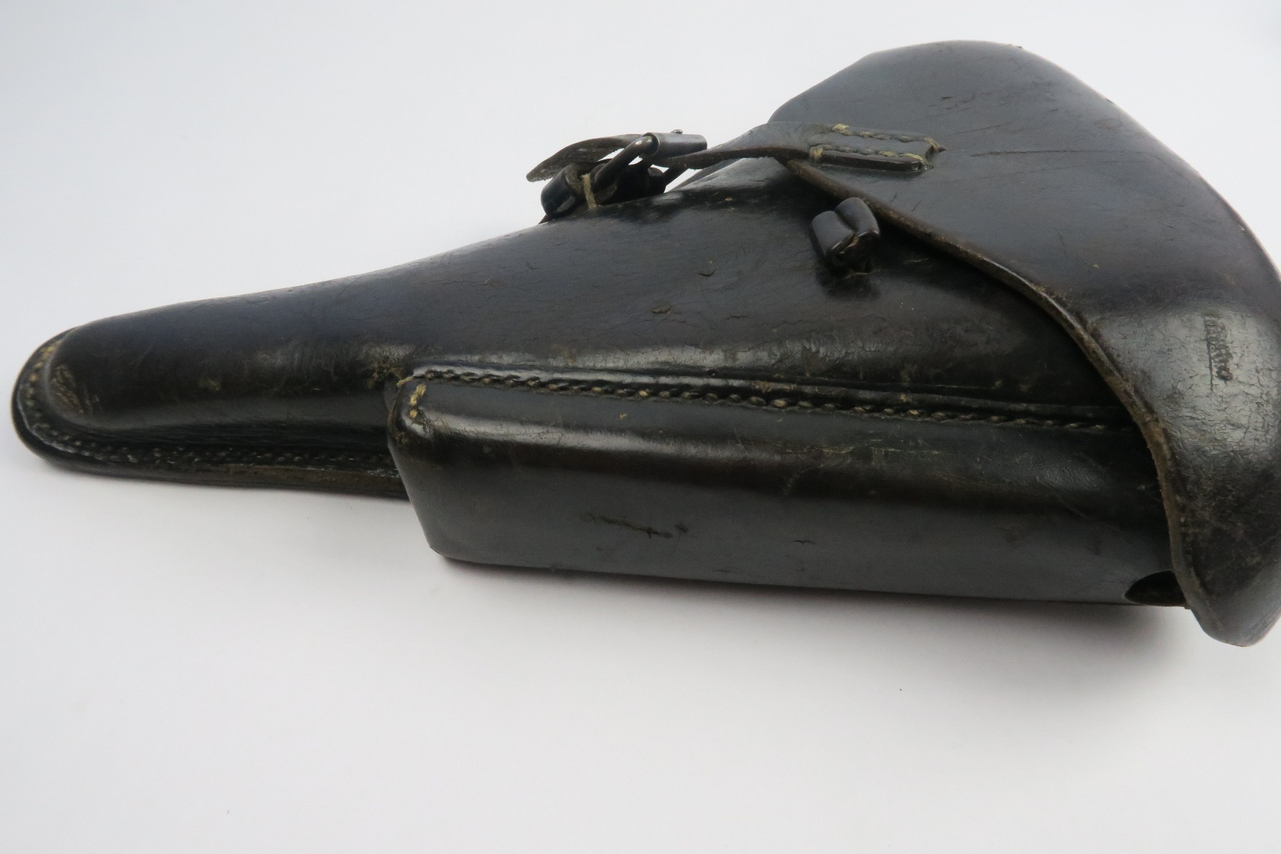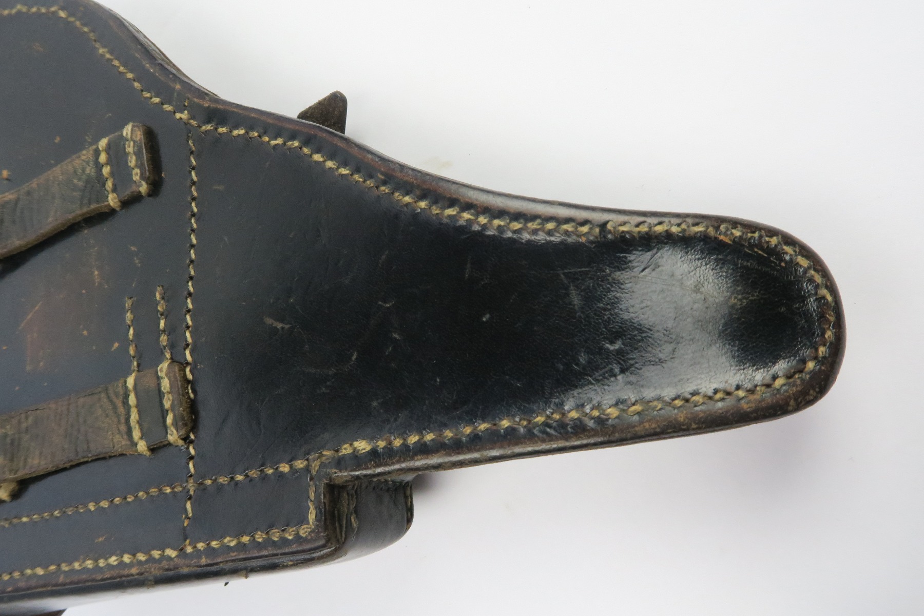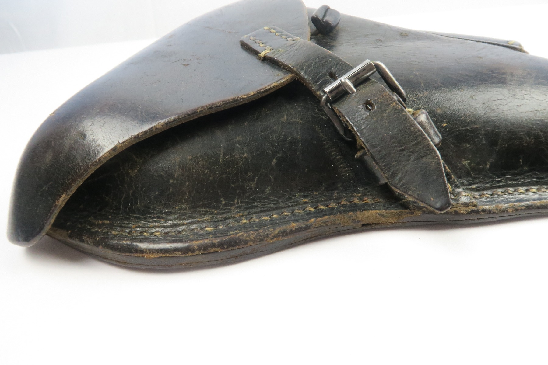 12/26/17 – This is an original 1935 dated Luger holster. Also known as the “G Date” Luger holster, and the most scarce of all WW2 era Luger holsters. The reasons why are unclear, but most tend to think there was an excess made in 1934, so not many were made in 1935 (or at least survived to today). The back of the holster is waffen WaA142 proofed, with a 1935 date and a maker stamp from Dresden Germany. The leather is in good shape but there is a light rip in the back left belt loop (near stitching, still completely attached). The front leather also has some light surface wrinkling and scuffing. The stitching is in tact and all original. The interior leather is fairly clean. Overall a very nice all original 1935 Luger holster. These don’t come in much nicer condition.