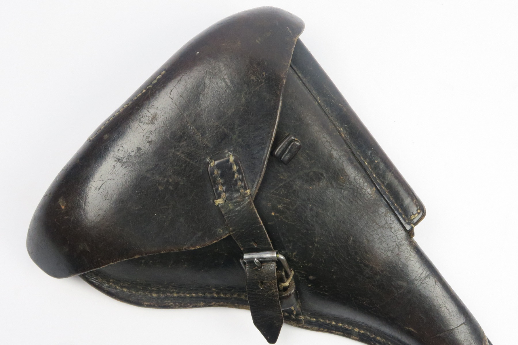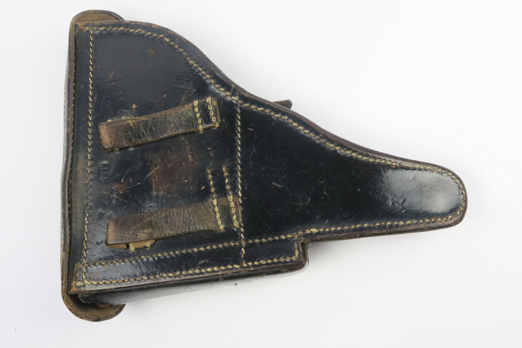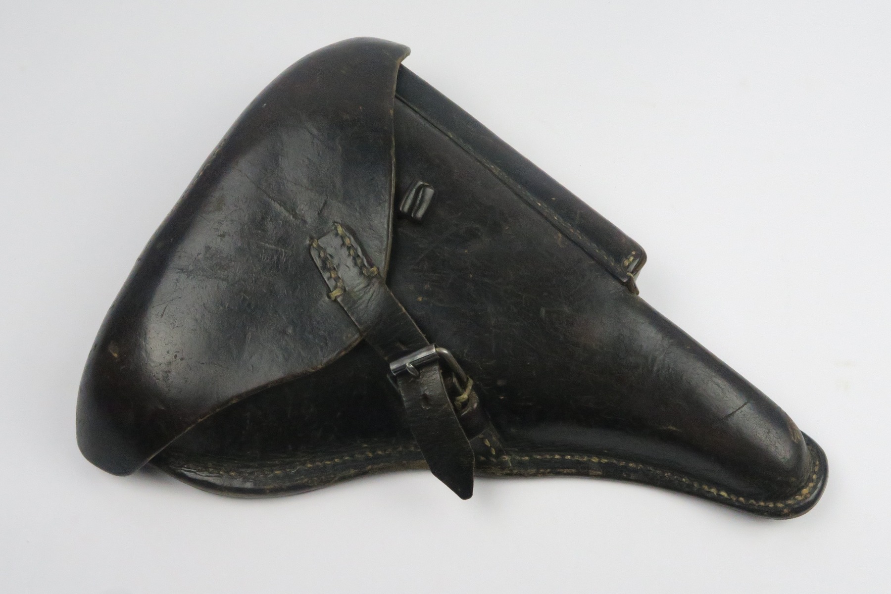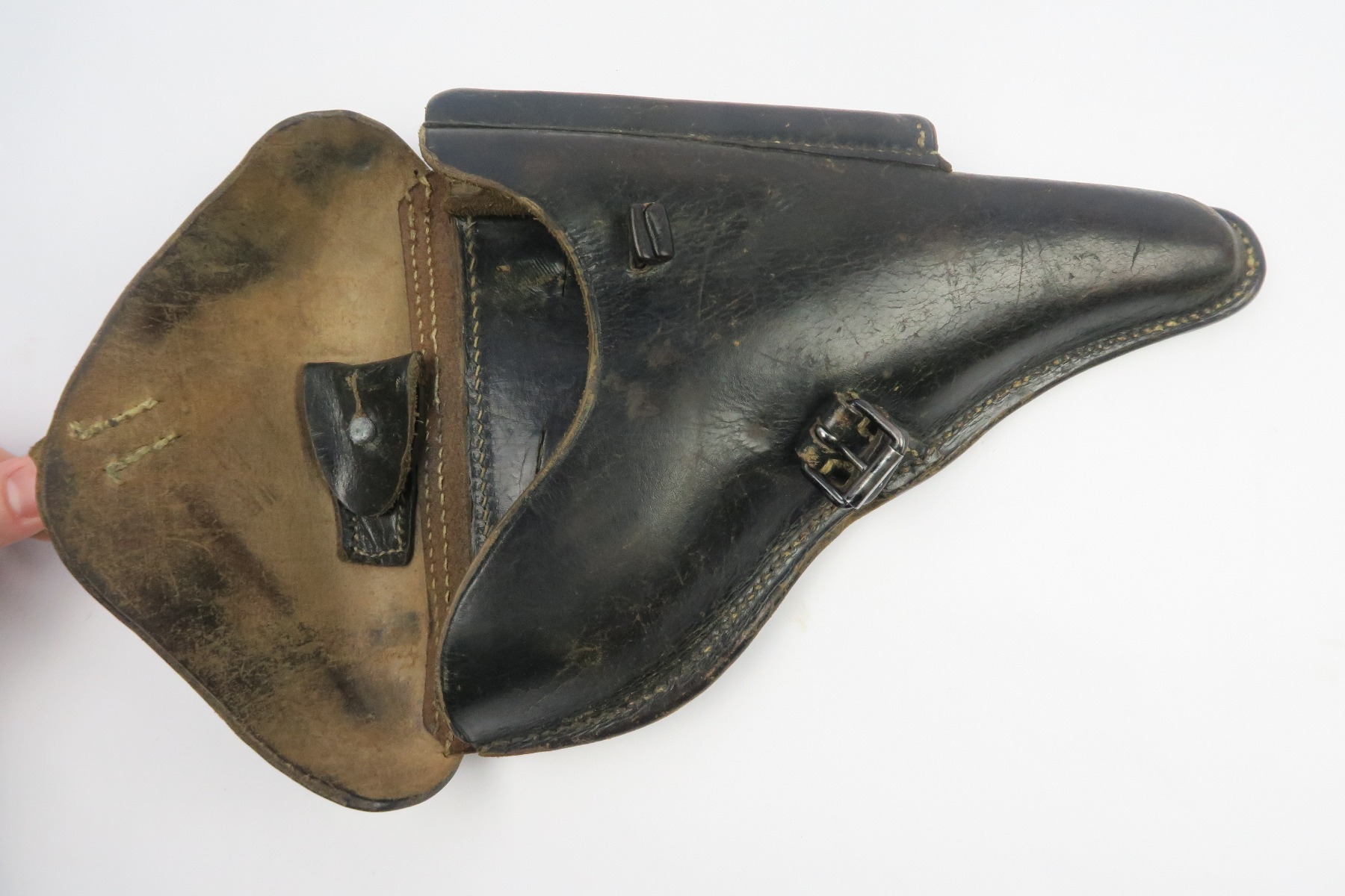 12/26/17 – This is an original 1935 dated Luger holster. Also known as the “G Date” Luger holster, and the most scarce of all WW2 era Luger holsters. The reasons why are unclear, but most tend to think there was an excess made in 1934, so not many were made in 1935 (or at least survived to today). The back of the holster is waffen WaA142 proofed, with a 1935 date and a maker stamp from Dresden Germany. The leather is in good shape but there is a light rip in the back left belt loop (near stitching, still completely attached). The front leather also has some light surface wrinkling and scuffing. The stitching is in tact and all original. The interior leather is fairly clean. Overall a very nice all original 1935 Luger holster. These don’t come in much nicer condition.