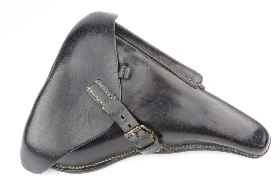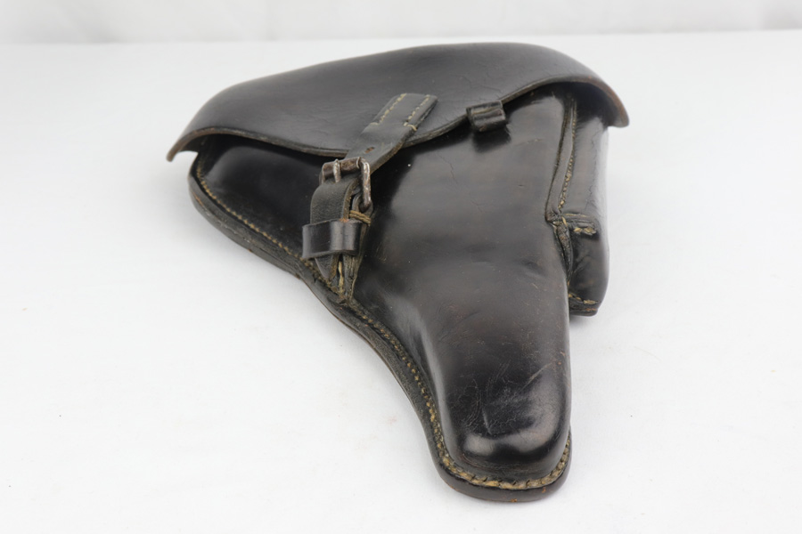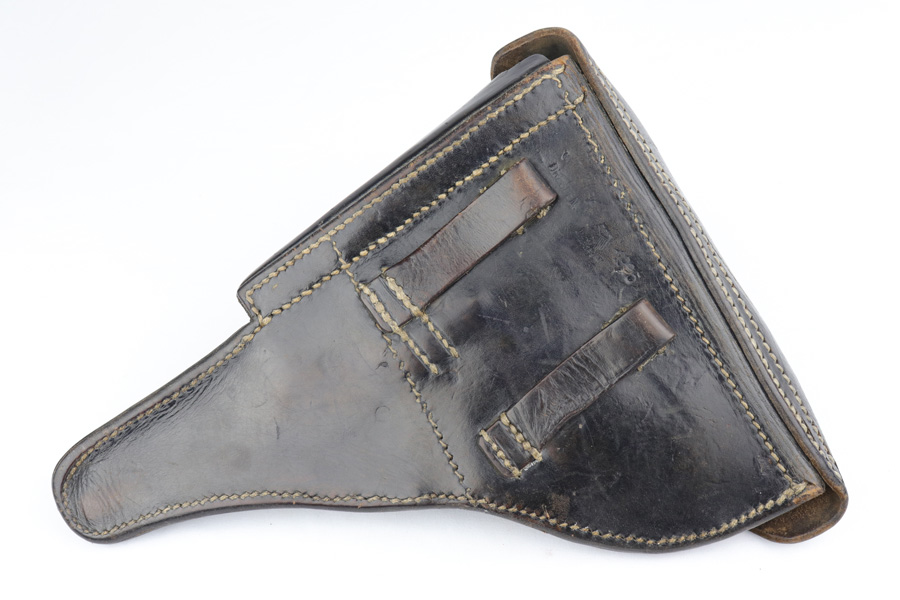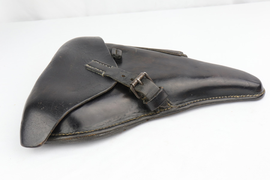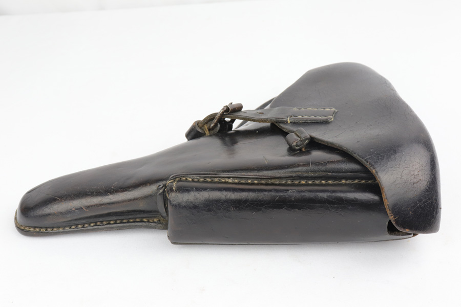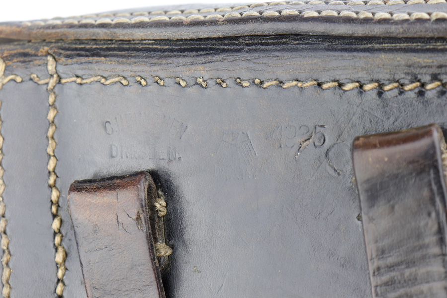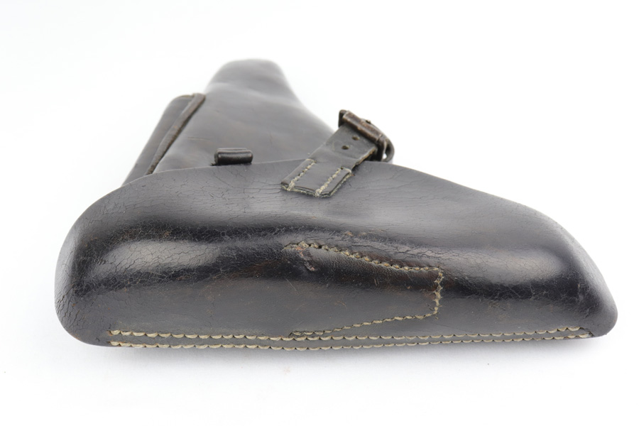 3/8/19 – This is the hardest to find variation of WW2 Luger holster by far. For whatever reason (likely because they made too many in 1934), there are barley any 1935 dated Luger holsters in existence. This is one of the nicest we’ve ever found. The back of this holster is clearly 1935 dated with a C.Heinichen maker stamp and droop winged eagle proof. The leather is pliable but holds nice shape and is fairly clean on the interior. There’s light surface cracking on the lid and front leather but no deep cracks. Stitching all original and in tact.