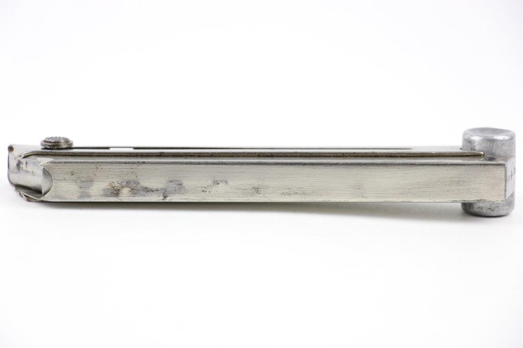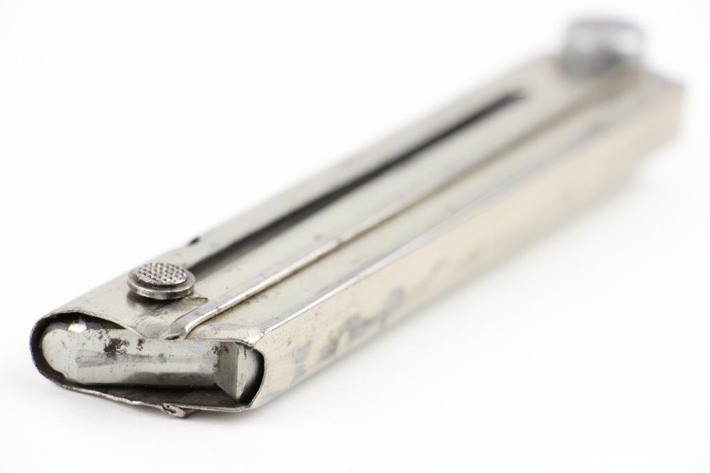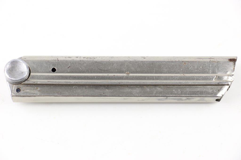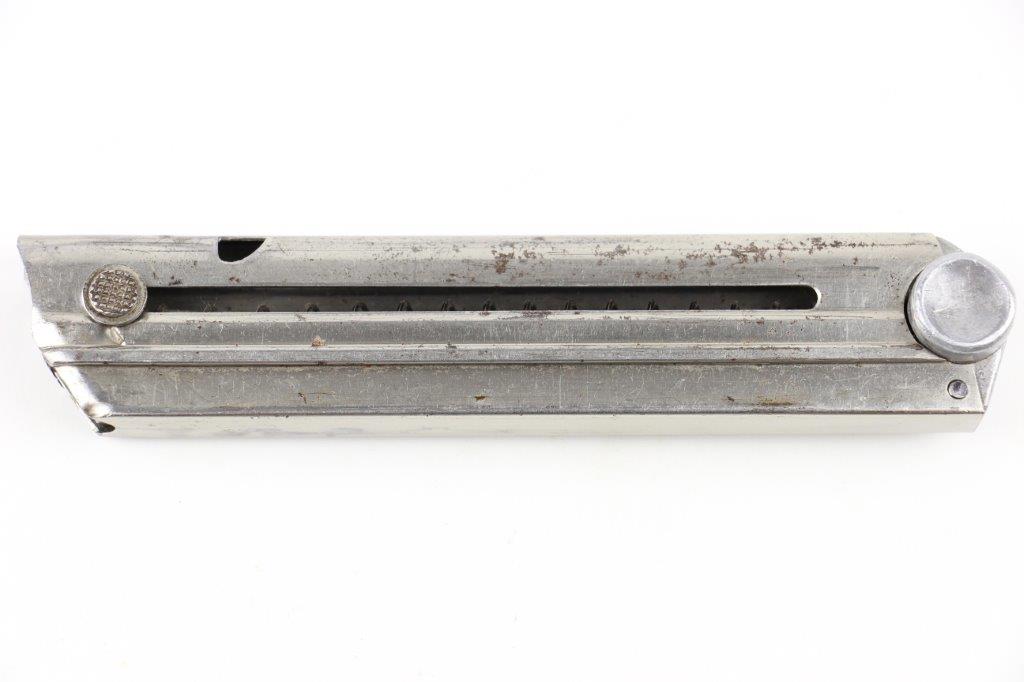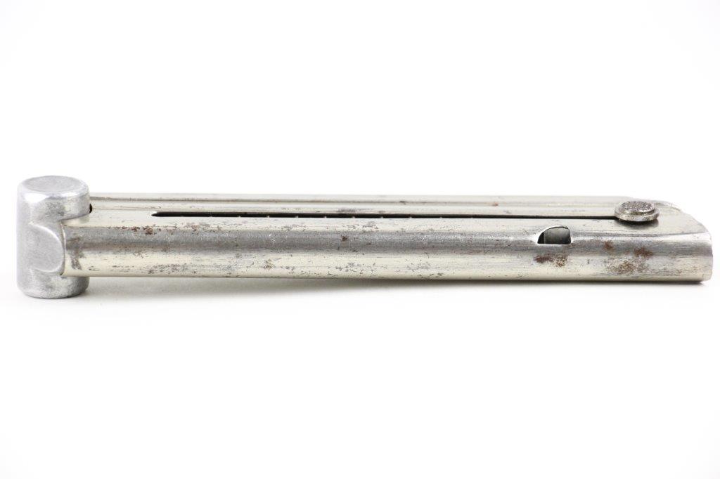 6/16/24 – This is a rare, early WW2 production Mauser Luger magazine. The magazine has a nickel tube and aluminum base. The base is serial numbered “3298c” with a + sign underneath, indicating this as the spare magazine. The base is also stamped with an early Mauser proof Eagle 154 stamp. This proof stamp correlates with 1935 “G Date” secret production. The magazine is in great overall condition with a smooth functional spring. Minimal spotty brown patina on the tube, and no rust or pitting.