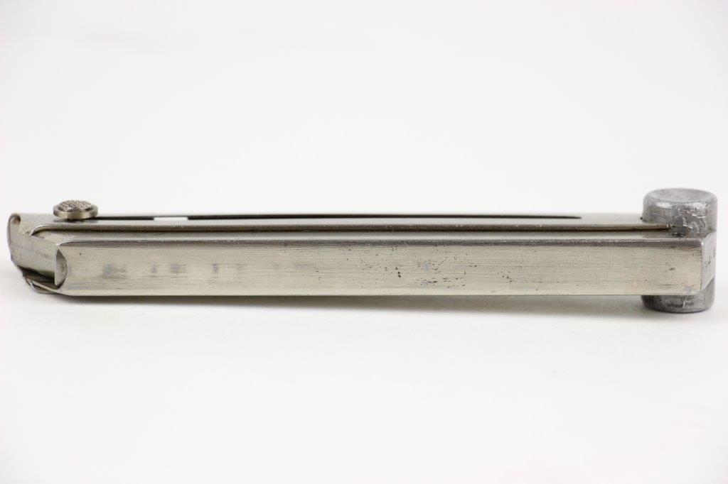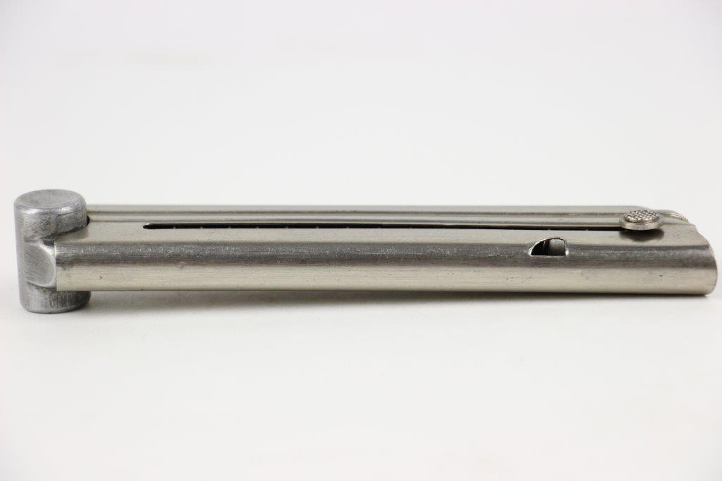 5/28/24 – This is an original, early WW2 production Mauser Luger magazine. This example is rare because of the droop winged eagle/211 military proof stamp on the base. This proof is associated with and found on G Date Mauser Lugers. The magazine also features an early nickeled tube. Near-excellent condition with some micro-scratches and handling wear, but no rust or pitting. The aluminum base is stamped with a desirable 3 digit serial number 604d, a plus sign, and a military proof stamp. Strong, fully functional spring.